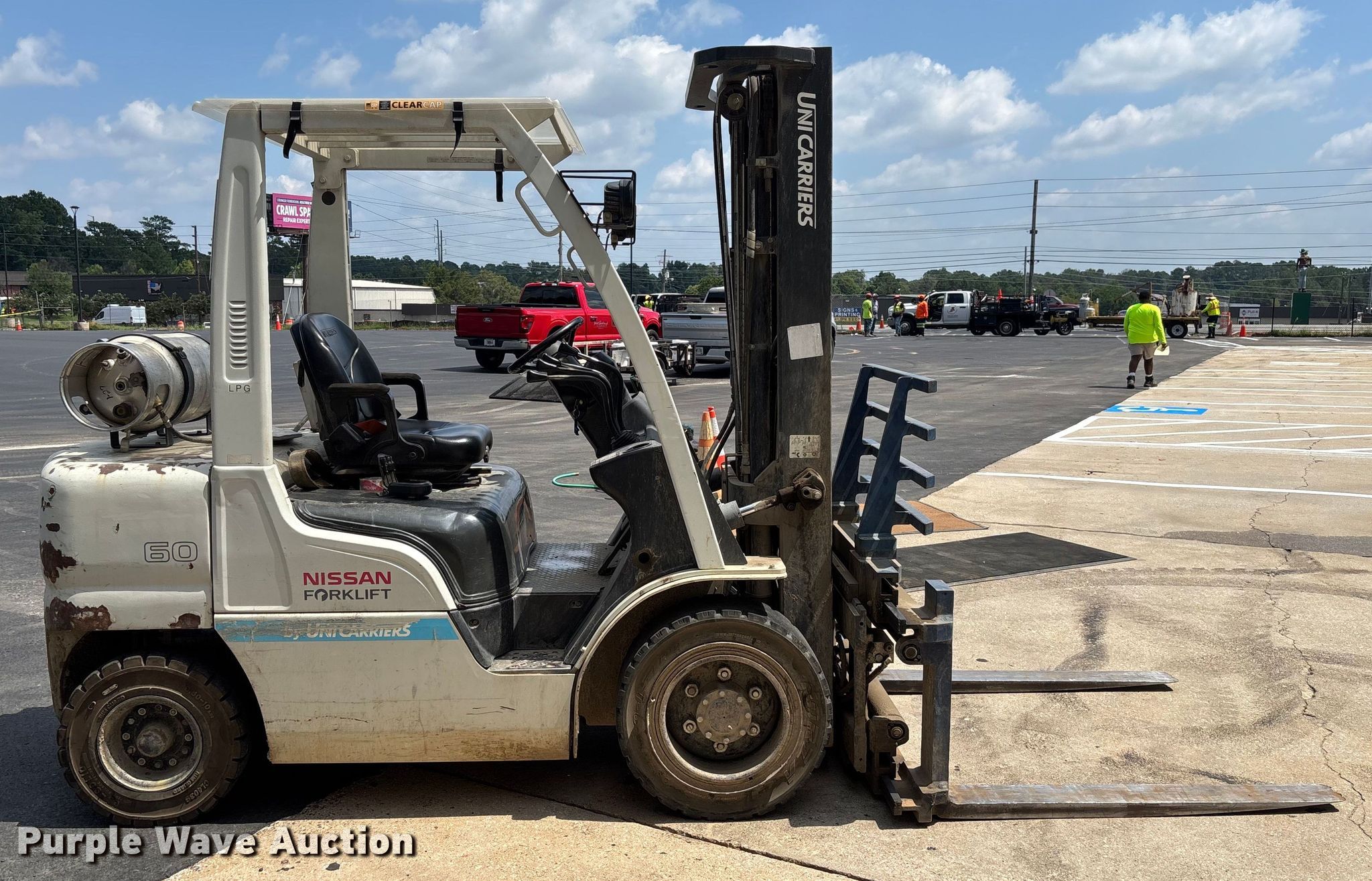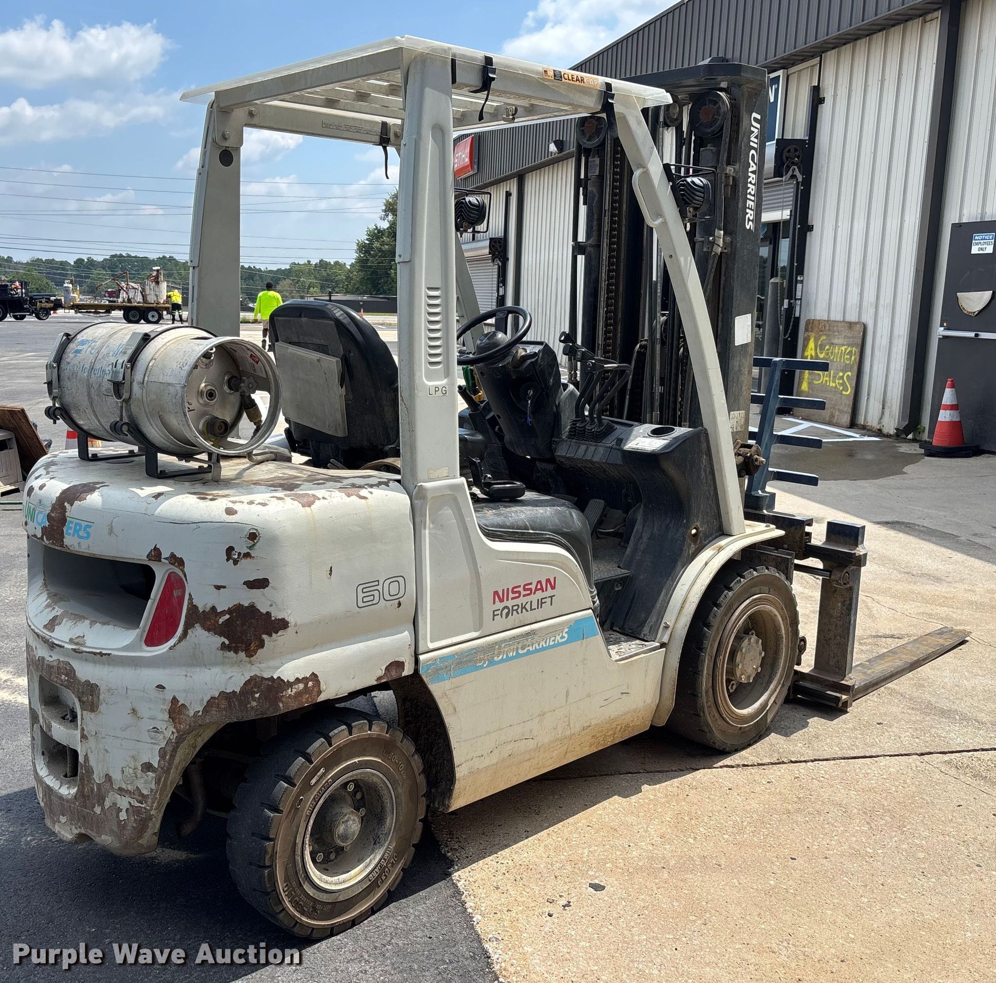 Purple Wave is selling a used Cushion Tire or Pneumatic Forklift in Georgia. This item is a 2014 Nissan PF60 forklift with the following: Hours: 6,582 on meter, Miles or hours may vary, unit still in use, Serial: UG1F2-9L3886, Unit #: SFS2348