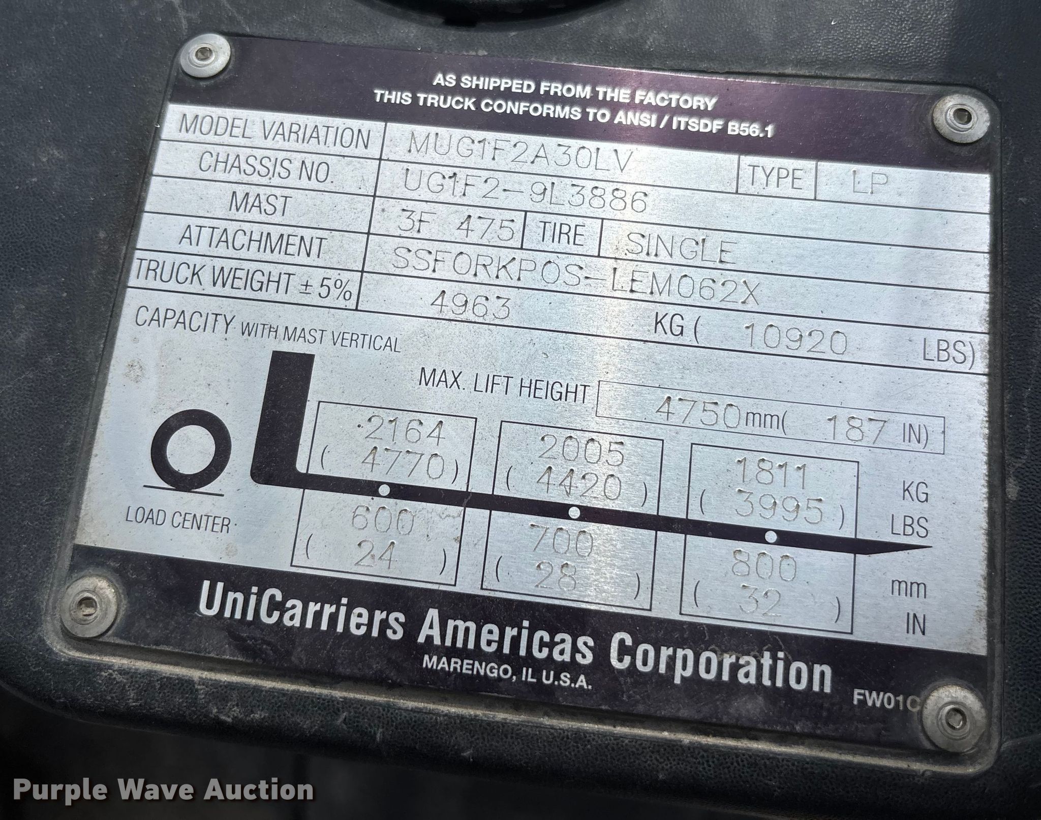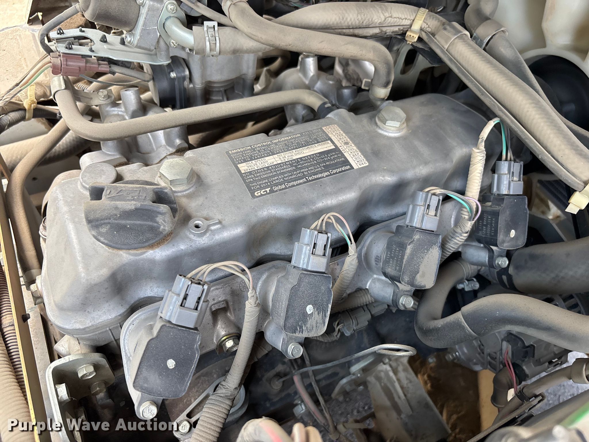 2014 Nissan PF60 forklift. Hours: 6,582 on meter, Miles or hours may vary, unit still in use, Serial: UG1F2-9L3886, Unit #: SFS2348. Engine GCT, Displacement: 2.5L, Cylinders: 4, Fuel type: LPG LP bottle: Not included. Transmission Automatic. Operators station OROPS, Canopy. Features Maximum lift capacity: 4,770 lbs, Maximum lift height: 187", Collapsed mast height: 90", Mast stages: 3, Side shift, Mast tilt, Fork positioner, Fork length: 47". Tires Front: 28x9-15/7.00, Rear: 6.50-10 5.00, Solid. Notes Warning indicator: Master warning. Ferguson. Norcross, GA 30071