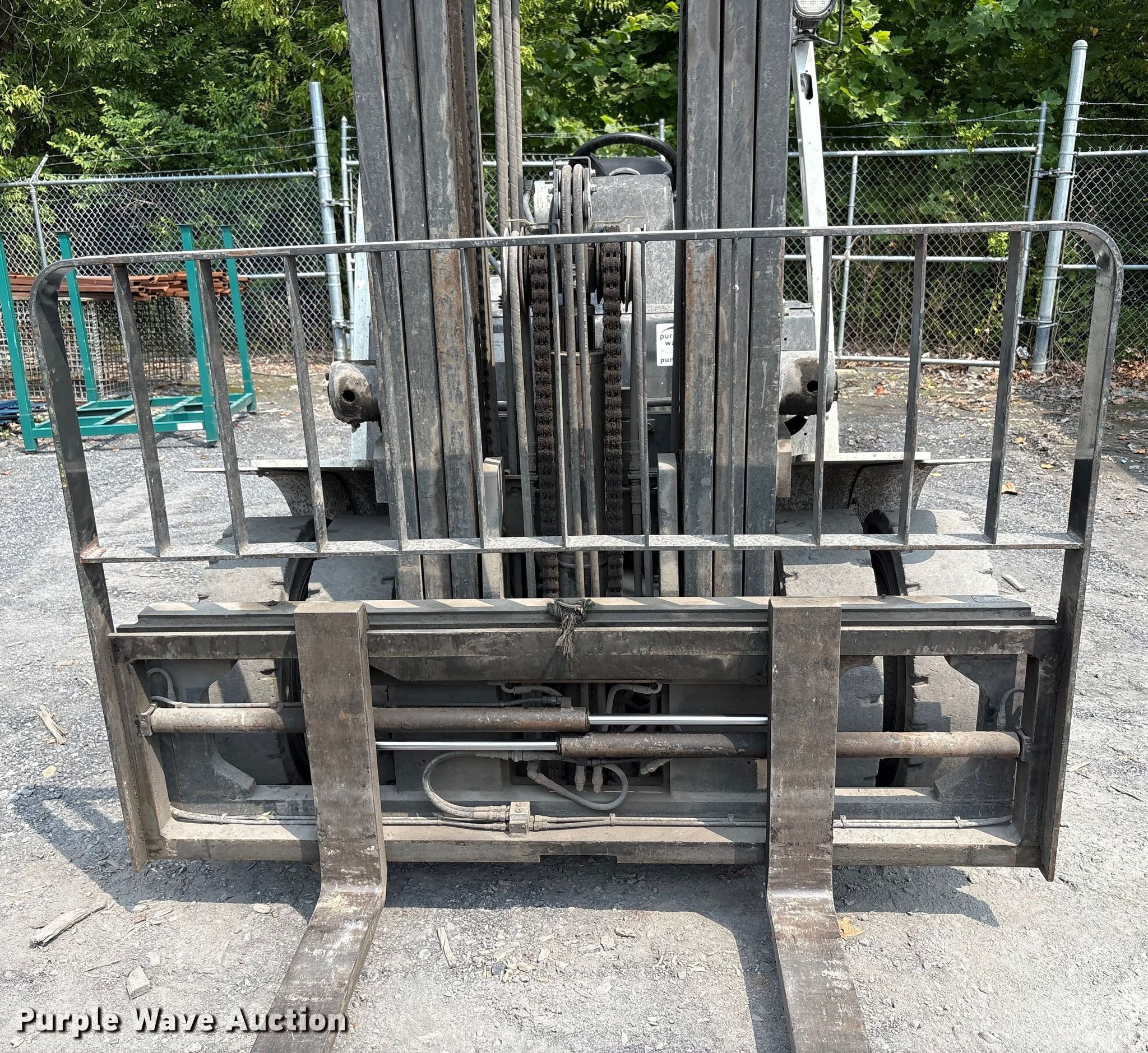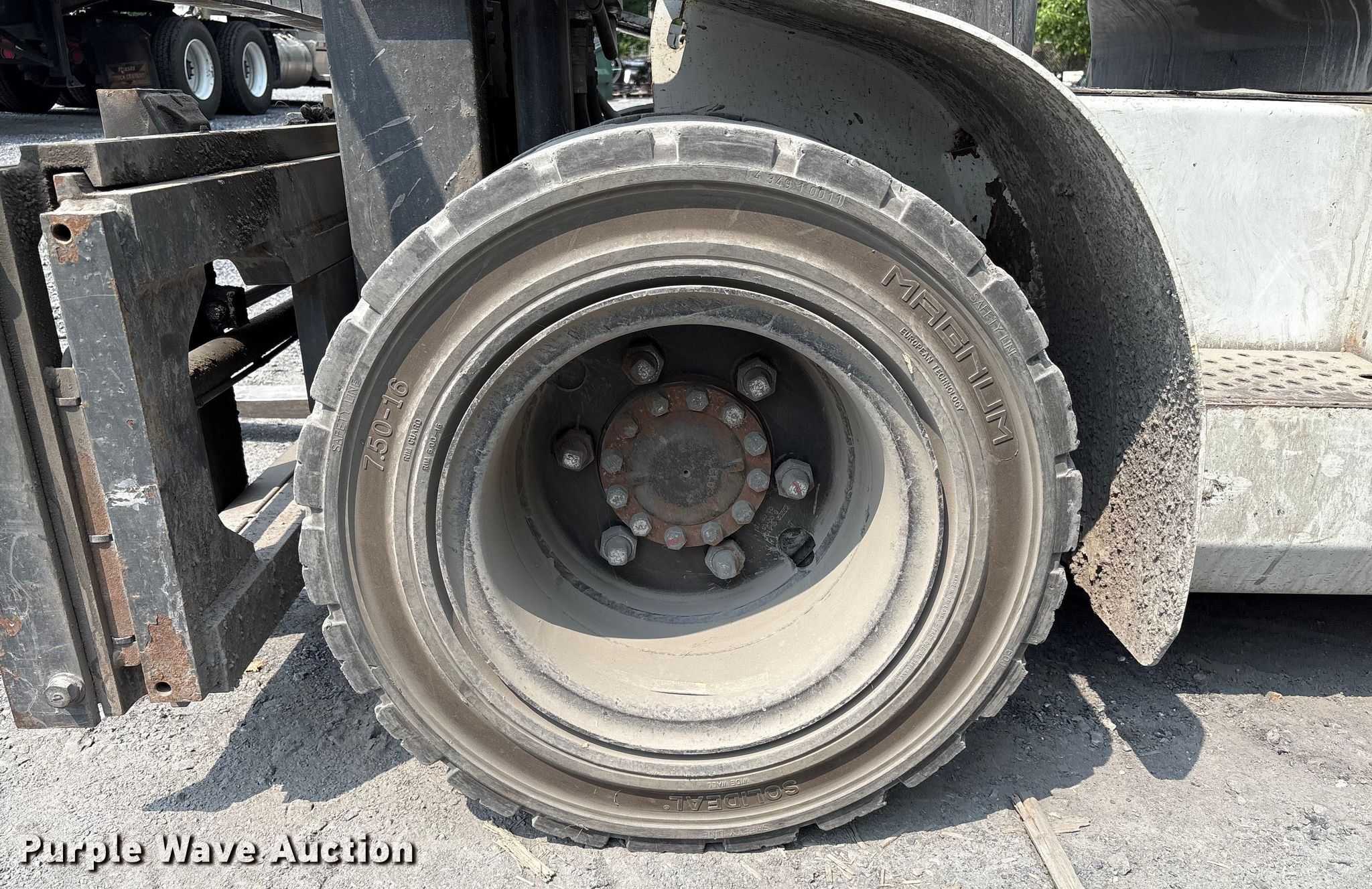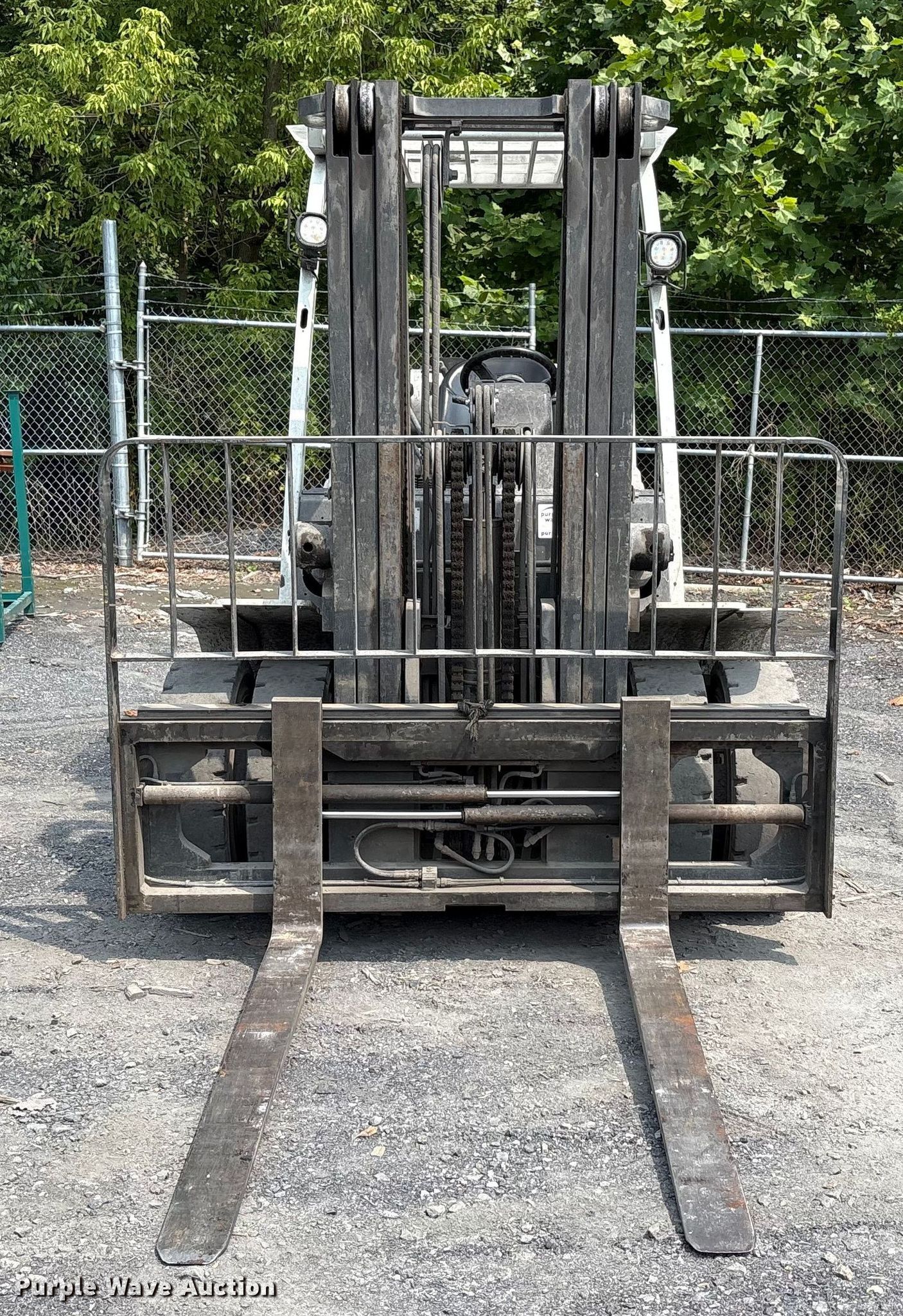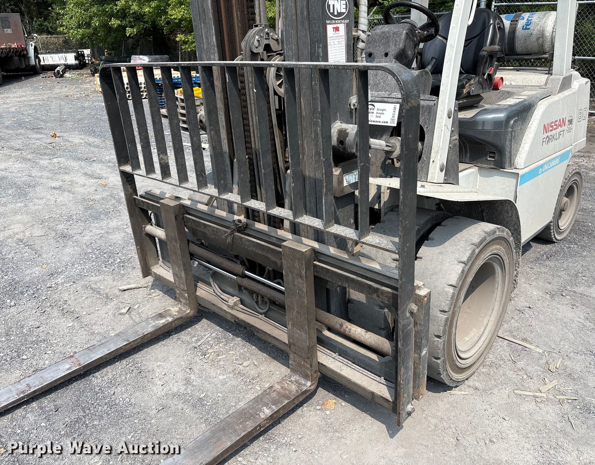 2014 Nissan PF80YLP forklift. Hours: 2,999 on meter, Serial: J1F4-980973, Unit #: SFS2292. Engine Cylinders: 6, Fuel type: LPG LP bottle: Not included. Transmission Automatic. Operators station OROPS. Features Maximum lift height: 187", Collapsed mast height: 89", Mast stages: 3, Side shift, Mast tilt, Fork positioner, Fork length: 59". Tires Front: 7.50-16, Rear: 7.00-12, Solid. Notes Warning indicator: Warning. Ferguson. Fullerton, PA 18052