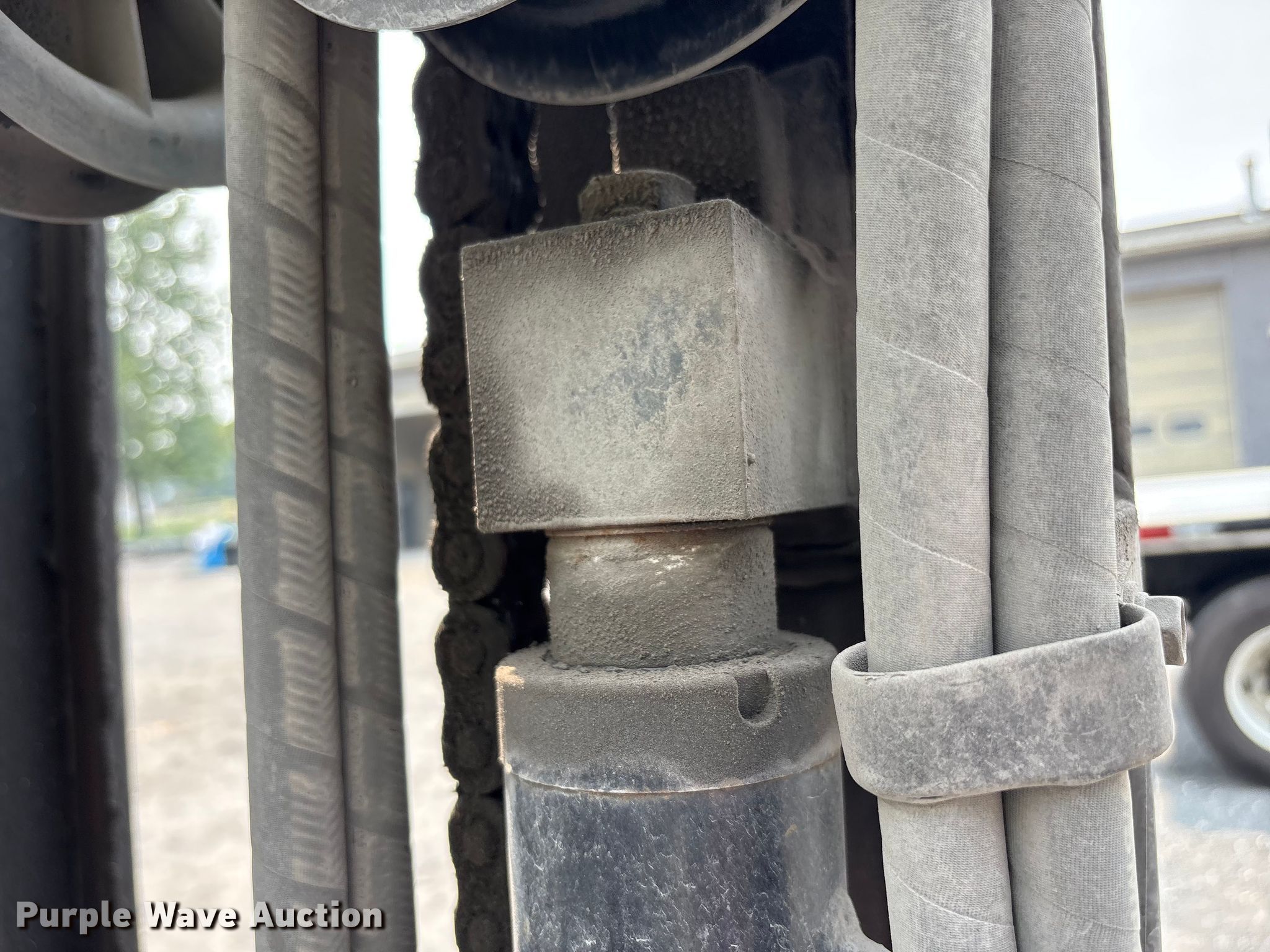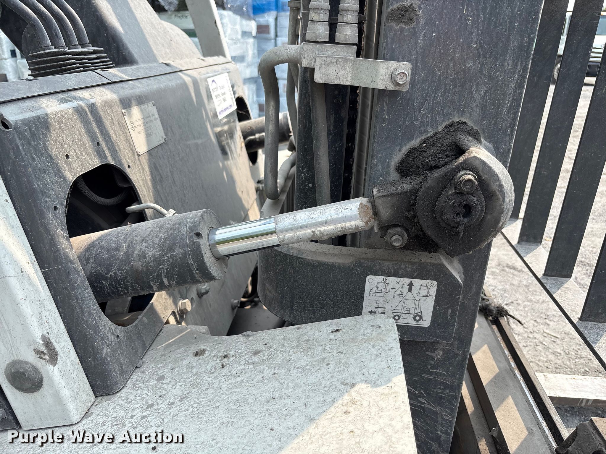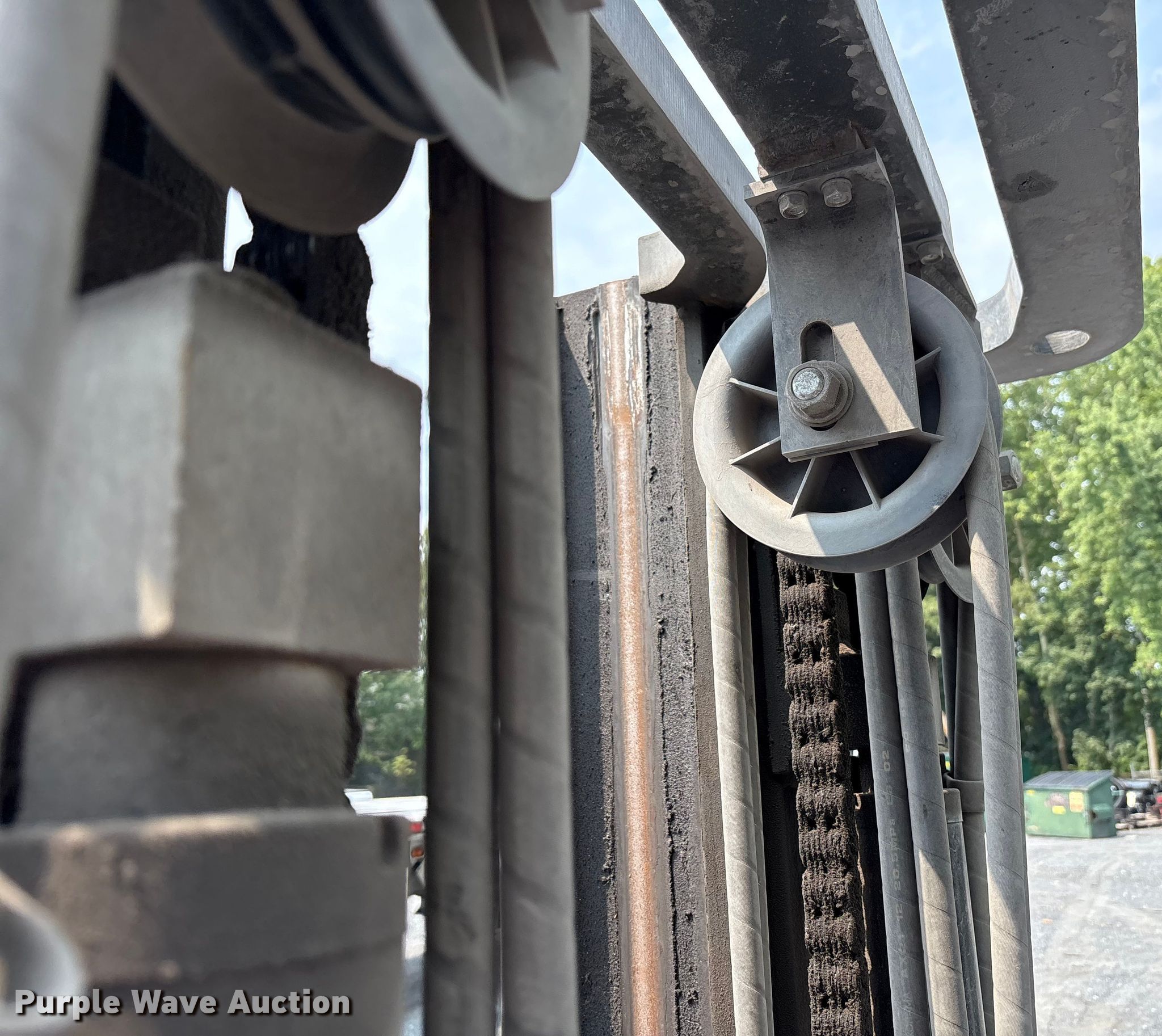 2014 Nissan PF80YLP forklift. Hours: 2,999 on meter, Serial: J1F4-980973, Unit #: SFS2292. Engine Cylinders: 6, Fuel type: LPG LP bottle: Not included. Transmission Automatic. Operators station OROPS. Features Maximum lift height: 187", Collapsed mast height: 89", Mast stages: 3, Side shift, Mast tilt, Fork positioner, Fork length: 59". Tires Front: 7.50-16, Rear: 7.00-12, Solid. Notes Warning indicator: Warning. Ferguson. Fullerton, PA 18052