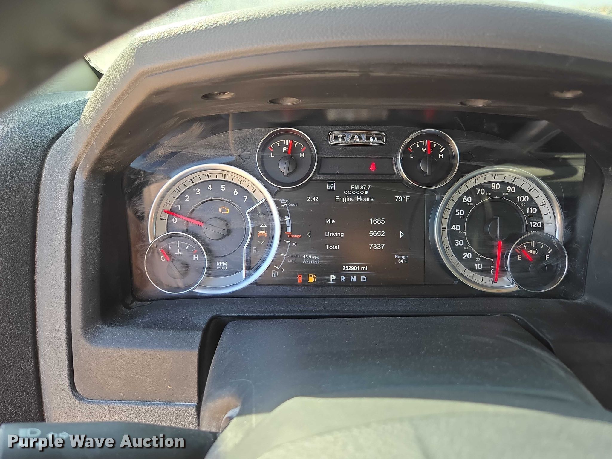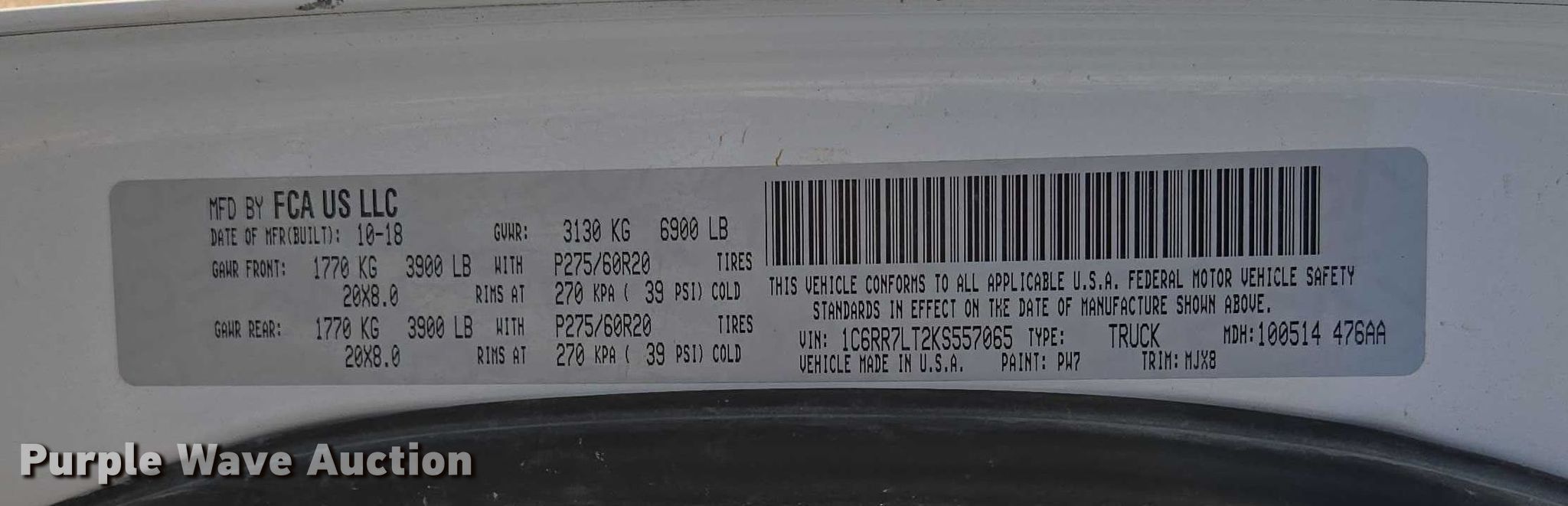 2019 Dodge Ram 1500 Crew Cab pickup truck. Miles: 252,901 on odometer, Hours: 7,337 on meter, VIN: 1C6RR7LT2KS557065, Unit #: 01.601904. Engine Displacement: 5.7L V8 DOHC, Cylinders: 8, Fuel type: Gas. Transmission Automatic, Four wheel drive. Interior AC, Heat, Seat: Heated, Power driver, Heated mirrors, Power windows, Power locks, Cruise control, Backup camera. Tires Size: LT275/60R20. Notes Dash warning indicator: Check engine, Windshield chipped or cracked. Missouri title. Title distribution may be delayed up to 14 days from verification of funds. Capital Equipment LLC. Ozark, MO 65721