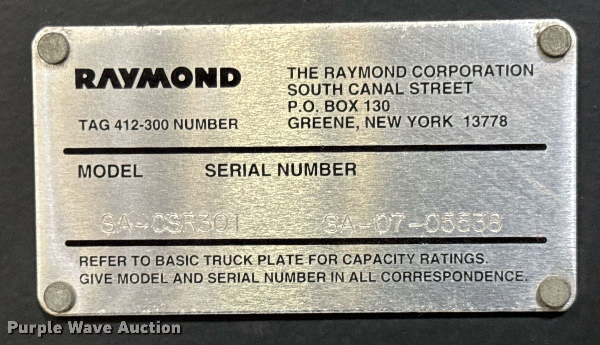 Purple Wave is selling a used Warehouse Forklift in Illinois. This item is a 2007 Raymond SA-CSR30T order picker with the following: Serial: SA-07-05538, Unit #: SFS2023