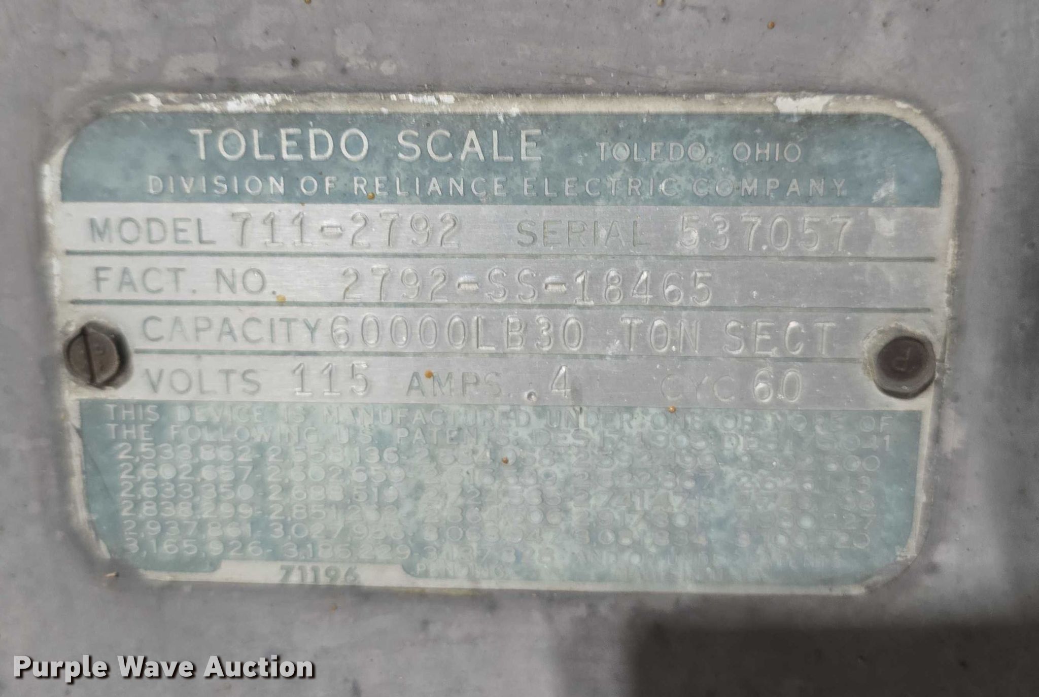 Toledo 711-2792 scale. Serial: 537057. Features Capacity: 60,000 lbs, Volts: 115. Notes Unknown operating condition. Northstar International. Lincoln, NE 68504