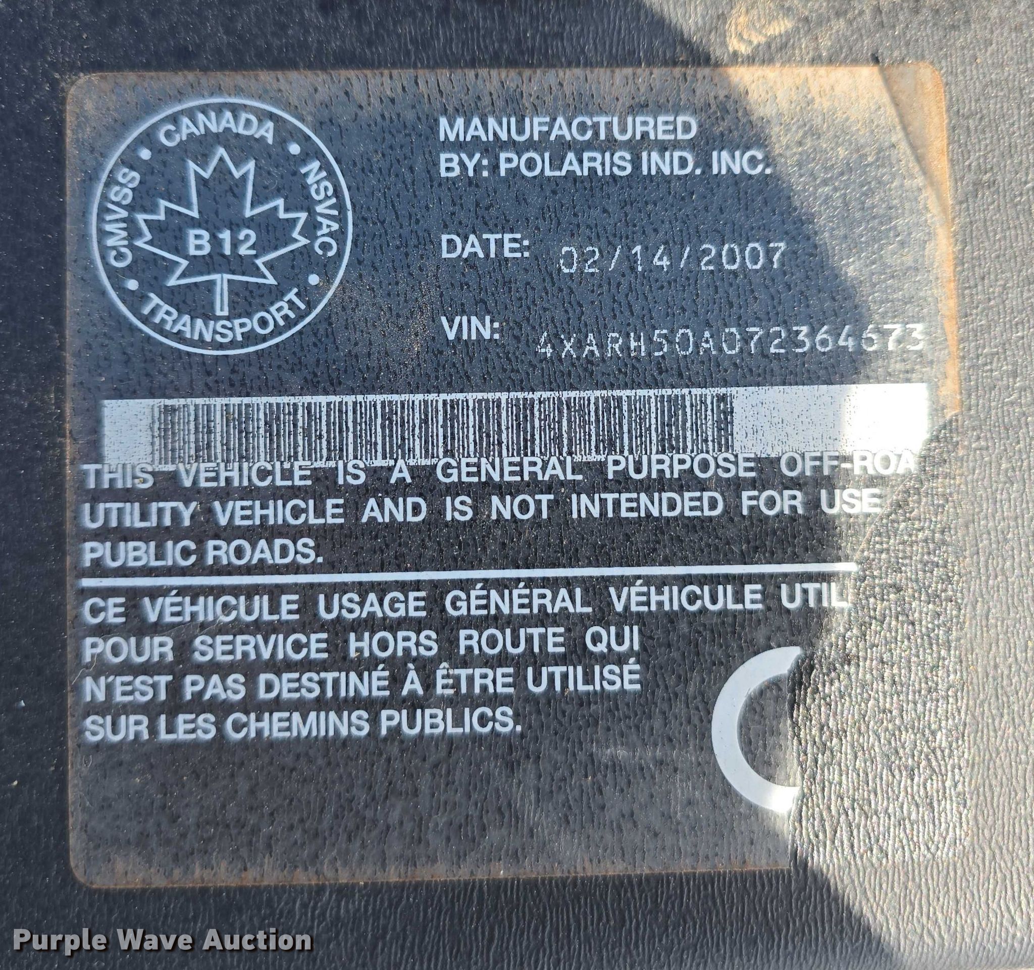 Purple Wave is selling a used Utility Vehicle in Nebraska. This item is a 2007 Polaris Ranger 500 utility vehicle with the following: Hours: 2,378 on meter, VIN: 4XARH50A072364673