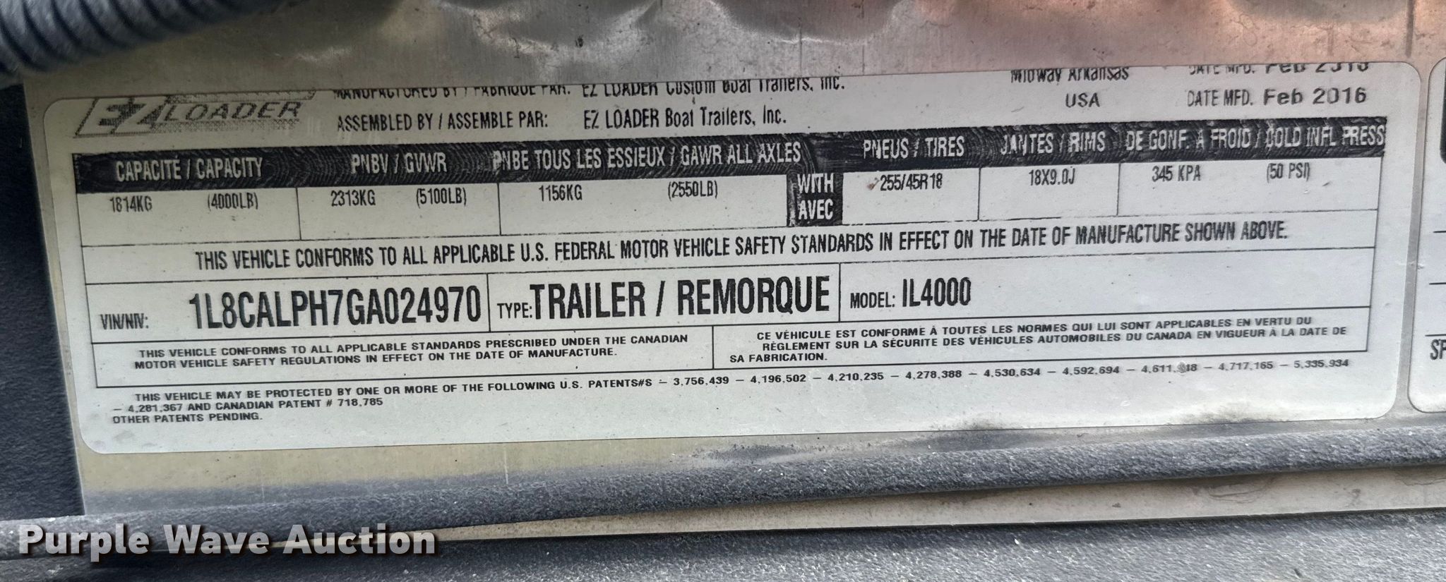 Purple Wave is selling a used Trailer Other in Oklahoma. This item is a 2016 EZ Loader IL4000 boat trailer with the following: VIN: 1L8CALPH7GA024970, Insurance salvage unit claim #: 5-807640