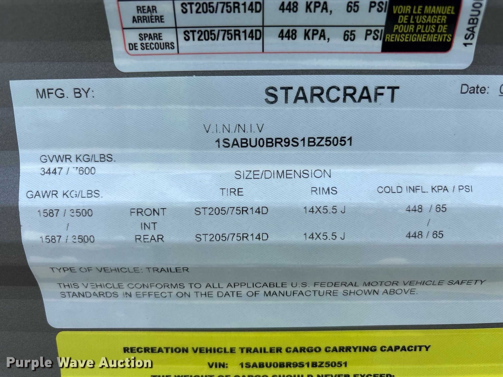 2025 StarCraft Autumn Ridge camper. VIN: 1SABU0BR9S1BZ5051, Unit #: 56933285. Chassis Axles: Tandem, Suspension: Spring, Brakes: Electric, GVWR: 7,600 lbs. Interior Kitchen: Sink, Refrigerator, Freezer, Microwave, Oven, Stove: Gas, Living room: Table, Pull out couch, Bathroom, Beds: 3, TVs: 1, AC units: 2. Features Slide outs: 1, Awnings: 1 Awning type: Electric. Tires Size: 205/75R14. Fleet inventory reduction, stored at a secured facility. Please review REQUIRED REMOVAL INSTRUCTIONS. Titles will be distributed after confirmation of payment and removal. Kentucky salvage title. Title distribution may be delayed up to 30 days from verification of funds. Fleet Inventory Reduction. 1049 Outer Loop. Louisville, KY 40219