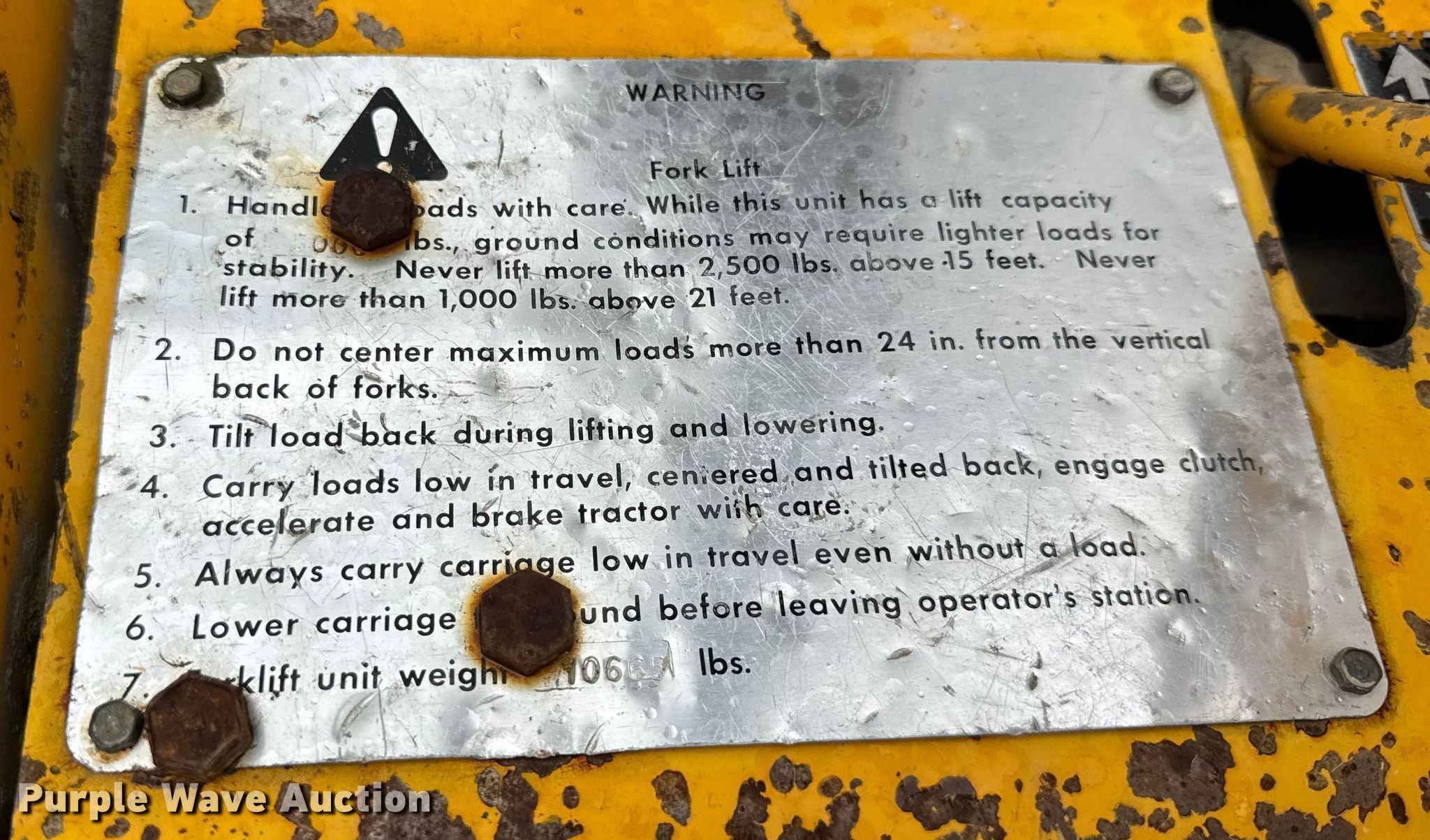 1976 John Deere 480B forklift. Hours: 1,123 on meter, Serial: 253127. Engine John Deere, Cylinders: 4, Fuel type: Diesel. Transmission Shuttle shift, 8F - 8R. Operators station Canopy. Features Collapsed mast height: 118", Mast stages: 3, Side shift, Mast tilt, Fork length: 48". Tires Front: 21L-24, Rear: 11L-15. Notes Transmission shift linkage issues. Heritage Tractor. Bradford, IL 61421