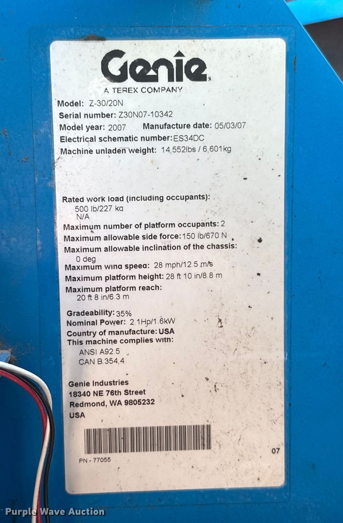 Purple Wave is selling a used Boom Lift in Oklahoma. This item is a 2007 Genie Z-30/20N boom lift with the following: Hours: 689 on meter, Serial: Z30N07-10342