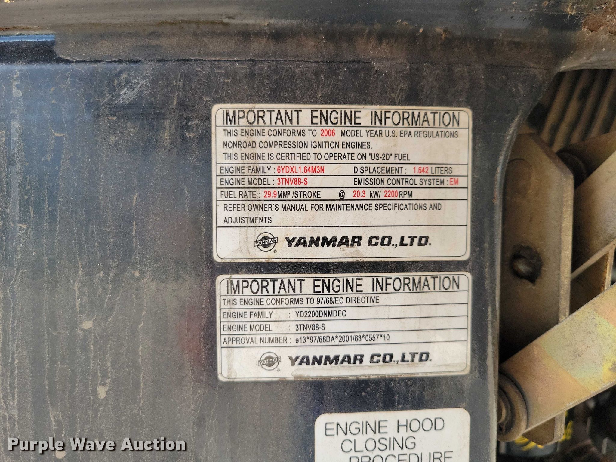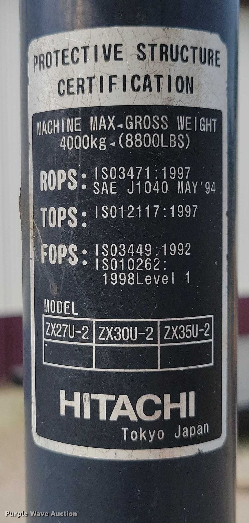2006 Hitachi Zaxis 27U mini excavator. Hours: 5,878 on meter, Serial: FF01MKQ224289. Engine Yanmar 3T3TNV88-SHB, Serial: 29447, Displacement: 1.64L, Cylinders: 3, Fuel type: Diesel, kW: 20.3. Transmission Hydrostatic. Operators station OROPS. Features Auxiliary hydraulics Standard, Two-way, Backfill blade Width: 61", Boom Standard, Swing, Stick Stick length: 46", Bucket Width: 18", Cutting edge: Weld-on, Teeth: 4. Tracks Width: 11.5", Rubber. Oddson Underground Inc. Windom, MN 56101