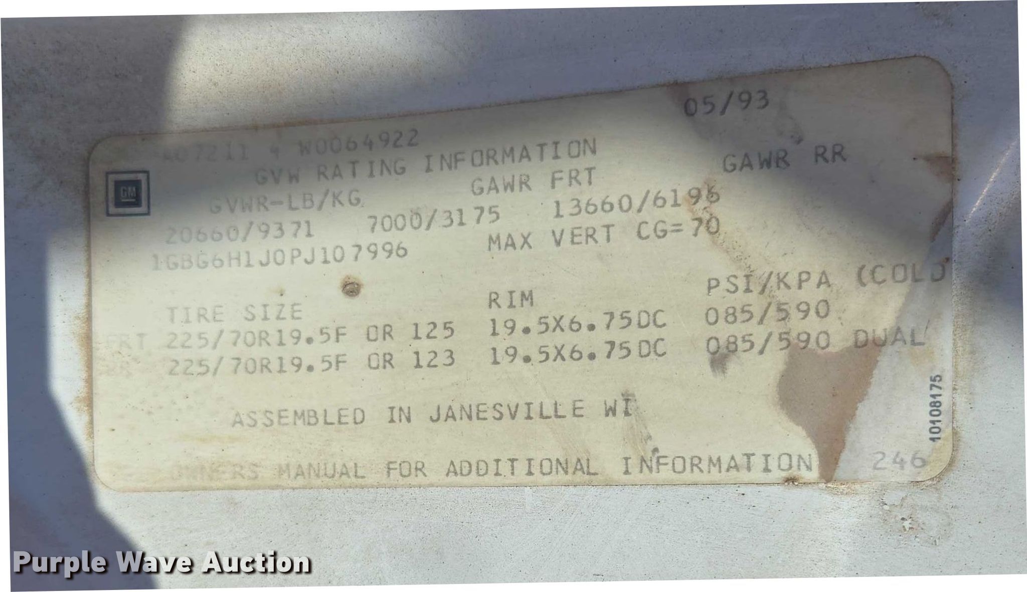 1993 Chevrolet Kodiak C6500 flatbed truck. Miles: 306,703 on odometer, Hours: 8,841 on meter, VIN: 1GBG6H1J0PJ107996, Unit #: 223-04. Engine Caterpillar, Displacement: 6.6L, Cylinders: 6, Fuel type: Diesel. Transmission Manual, Speed: 6. Chassis Axles: Single, Suspension: Spring, Brakes: Hydraulic, PTO, GVWR: 20,660 lbs. Interior AC, Heat, Brake controller. Features Bed Flatbed, Length: 133", Width: 96". Tires Size: 245/70R19.5. Notes Possible AC issues, may need charged, Climate control blend door issues, Windshield chipped or cracked, Dead battery, Jump start required during on-site data collection. Arkansas title. Grant Garrett Excavating. Rogers, AR 72758