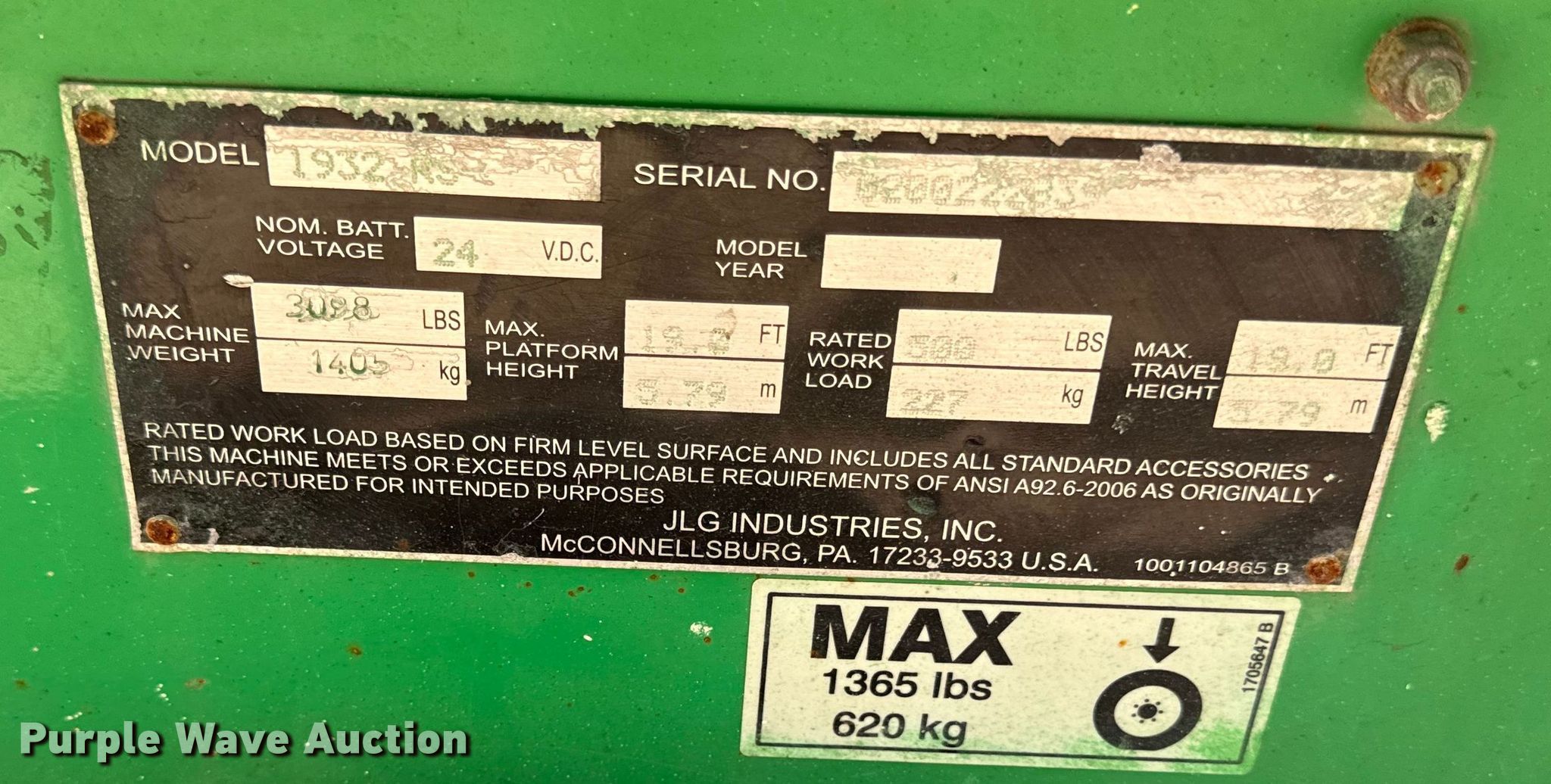 Purple Wave is selling a used Scissor or Vertical Lift in Kansas. This item is a JLG 1932RS scissor lift with the following: Hours: 442 on meter, Serial: 020022233