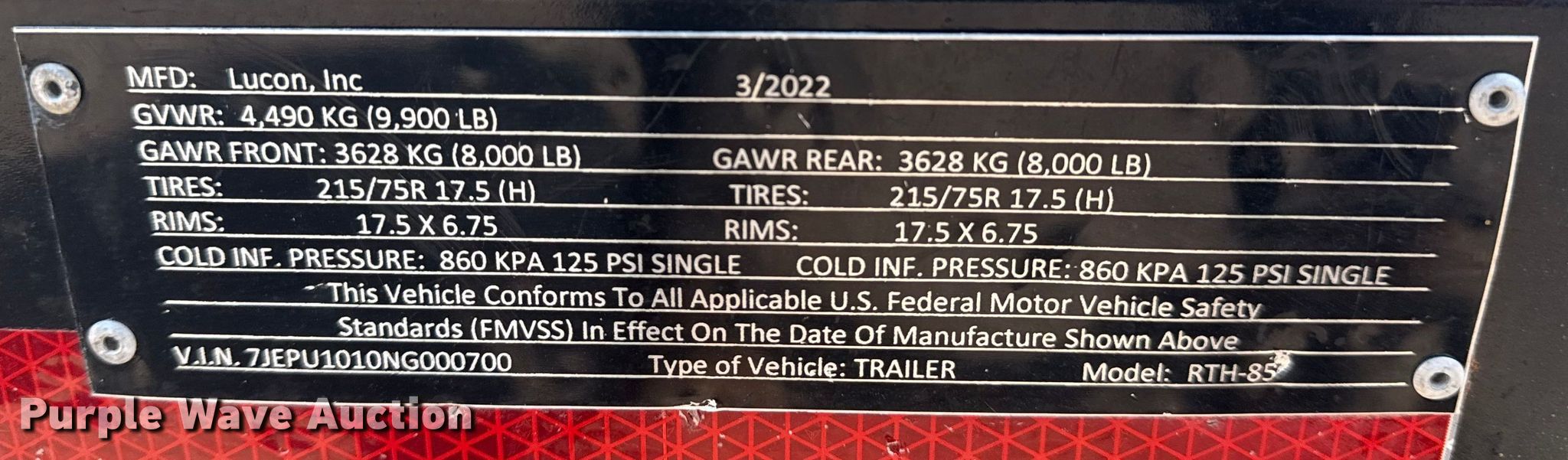 Purple Wave is selling a used Reel Trailer in Oklahoma. This item is a 2022 Lucon Custom Heavy Haul RTH-85 reel trailer with the following: VIN: 7JEPU1010NG000700