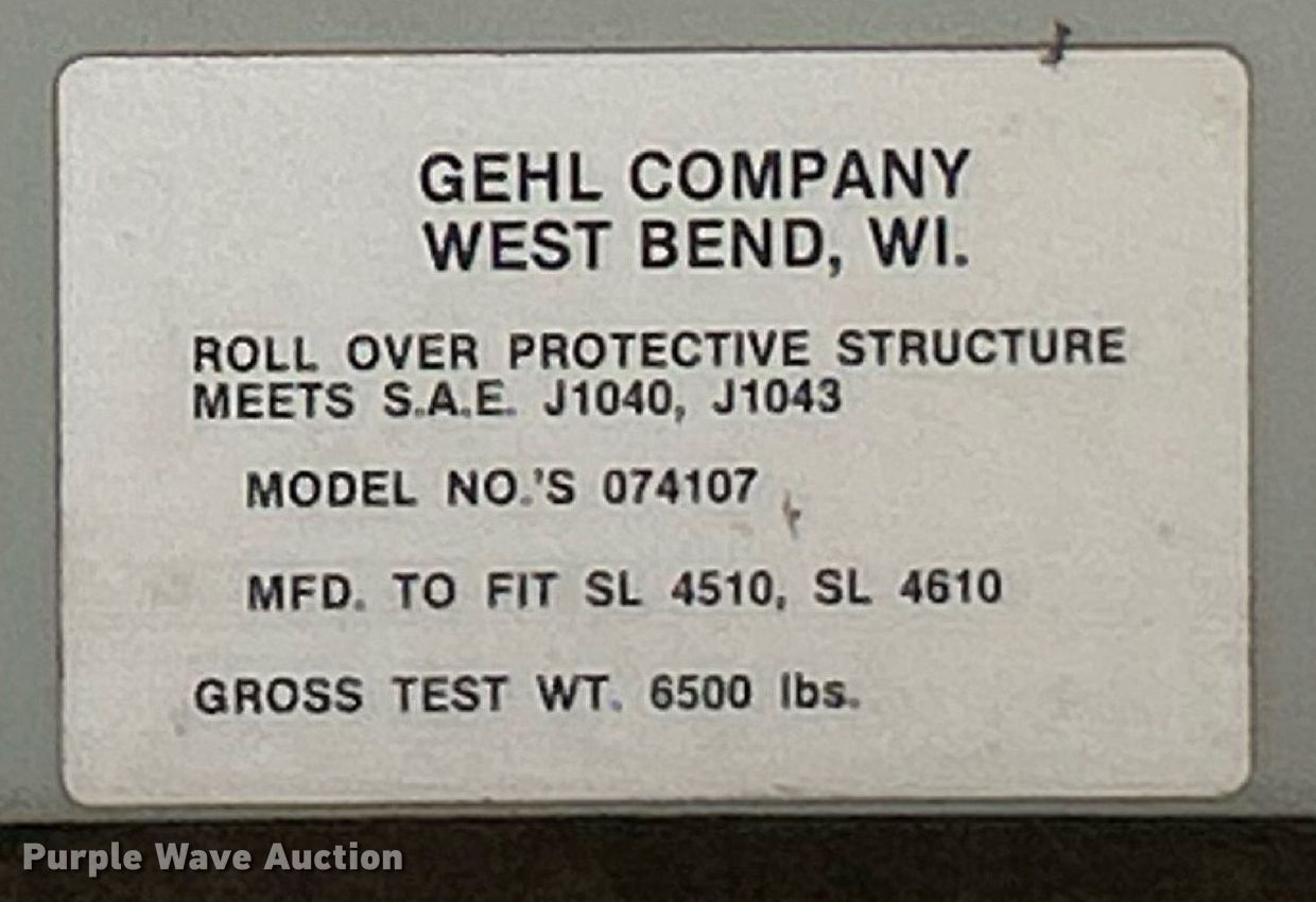 1988 Gehl SL4610 skid steer loader. Hours: 3,437 on meter, Serial: 5916. Engine Cylinders: 4, Fuel type: Diesel. Transmission Hydrostatic. Operators station OROPS, Bucket control: Hand. Features Bucket Width: 66". Tires Size: 10-16.5. De Soto, MO 63020