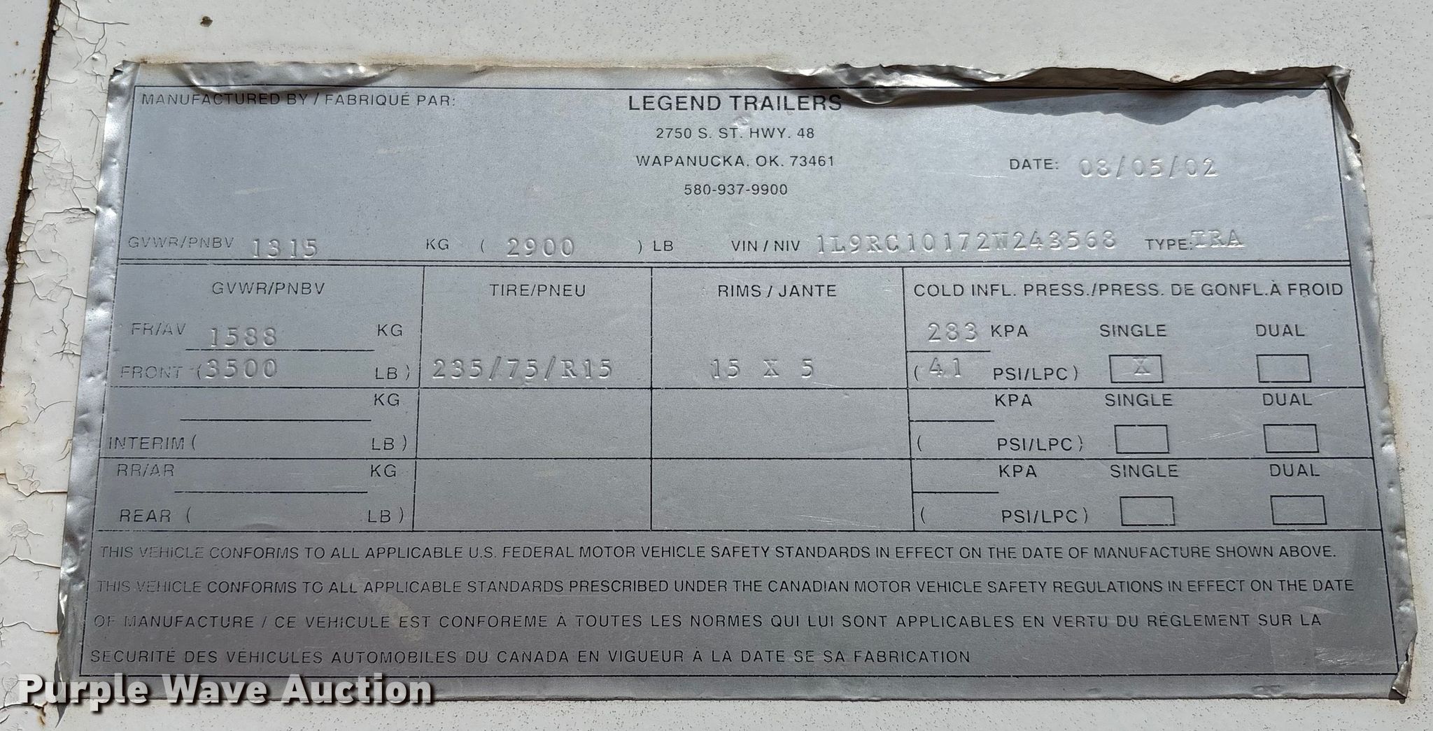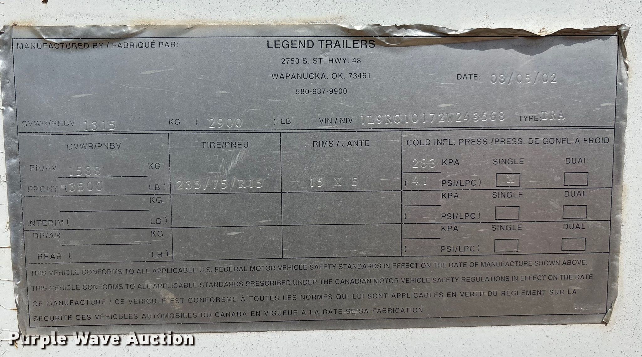 Purple Wave is selling a used Enclosed Cargo Trailer in Texas. This item is a 2002 Legend enclosed cargo trailer with the following: VIN: 1L9RC10172W243568