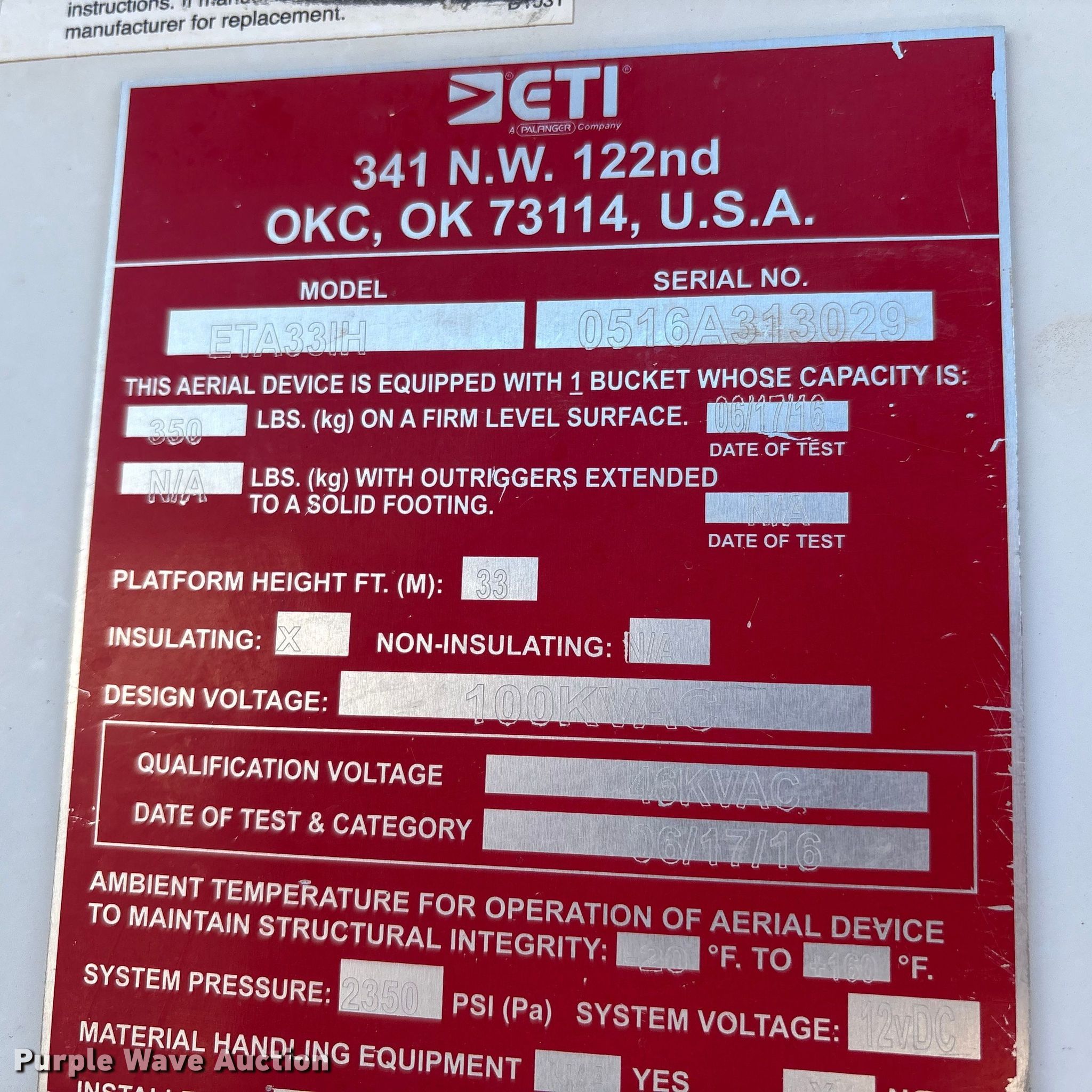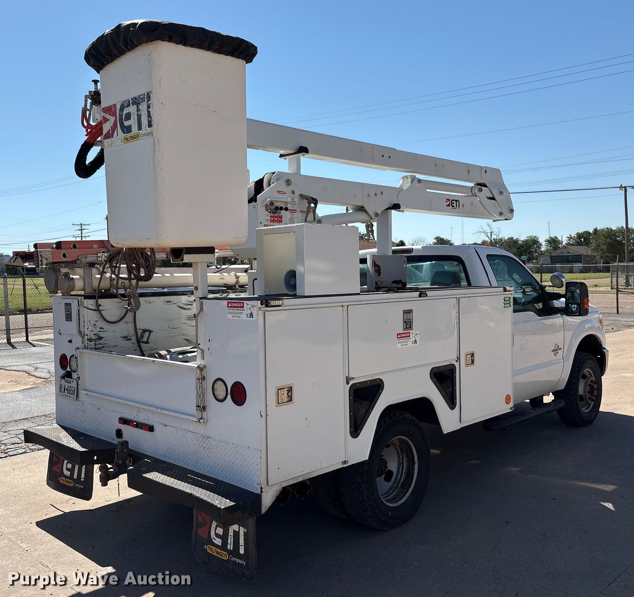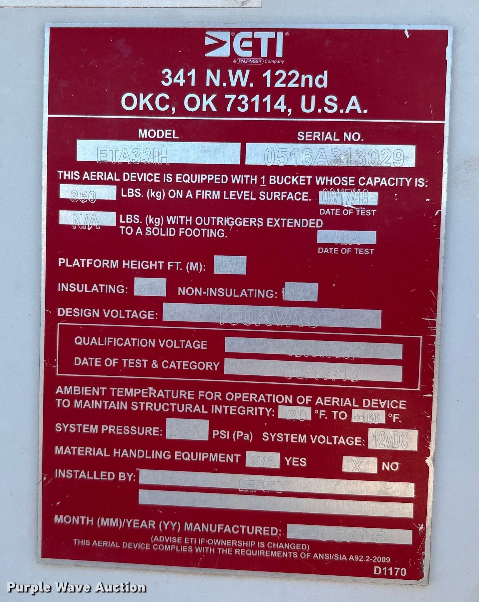 2016 Ford F350 Super Duty bucket truck. Miles: 201,044 on odometer, VIN: 1FDRF3HT7GEC72480. Engine Displacement: 6.7L V8 OHV, Cylinders: 8, Fuel type: Diesel. Transmission Automatic. Chassis Four wheel drive, Axles: Single, Suspension: Spring, Brakes: Hydraulic, PTO, GVWR: 14,000 lbs, Wheelbase: 141". Interior AC, Heat, Heated mirrors, Power windows, Power locks, Cruise control, Auxiliary controls. Features Bed ETI SB108DD96A0O, Serial: 19246, Length: 116", Width: 96", Boom 2016 ETI ETA33IH, Serial: 0516A313029, Maximum lift capacity: 350 lbs, Maximum lift height: 33', Boom type: Articulating, Insulated, Man basket, Boom controls Ground, Platform/ basket.. Tires Size: LT235/80R17. Texas title. Title distribution may be delayed up to 30 days from verification of funds. Swisher Electric Cooperative, Inc.. Tulia, TX 79088
