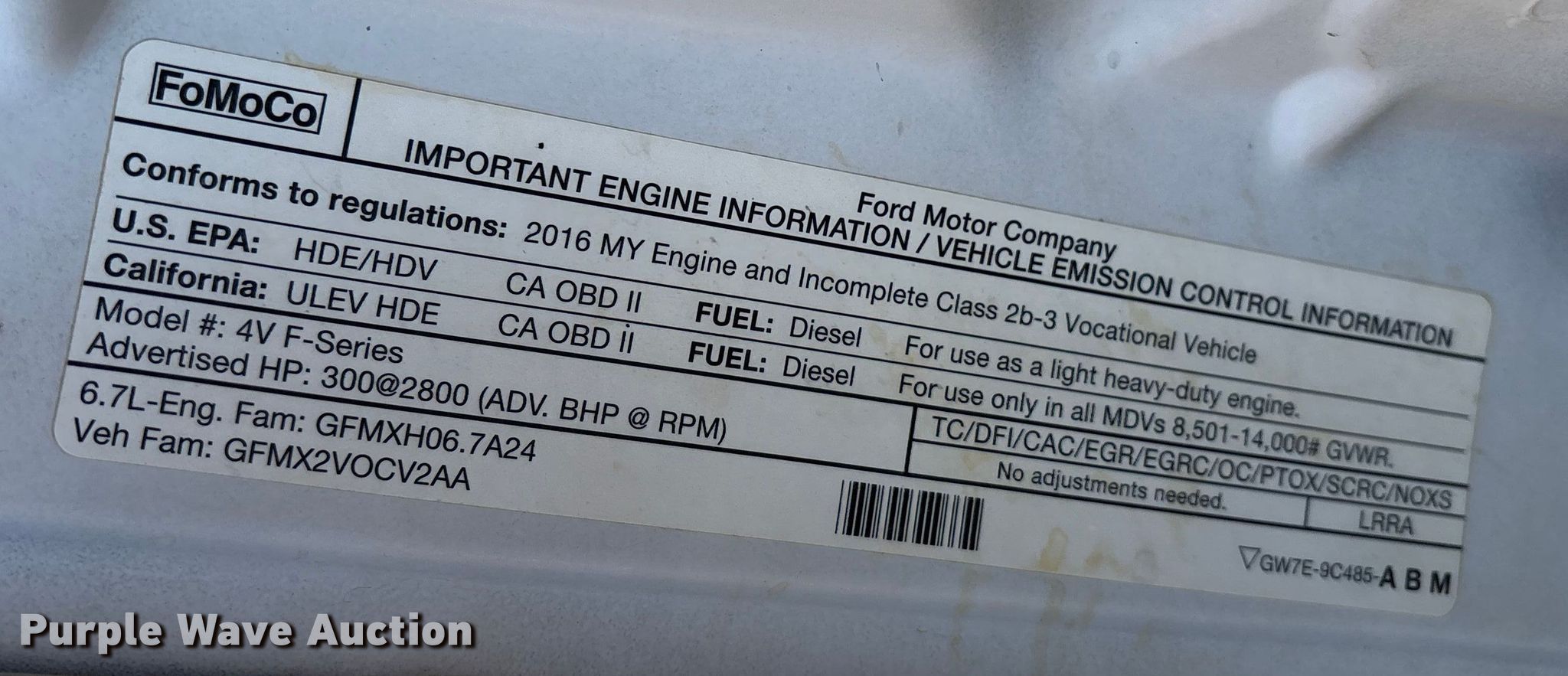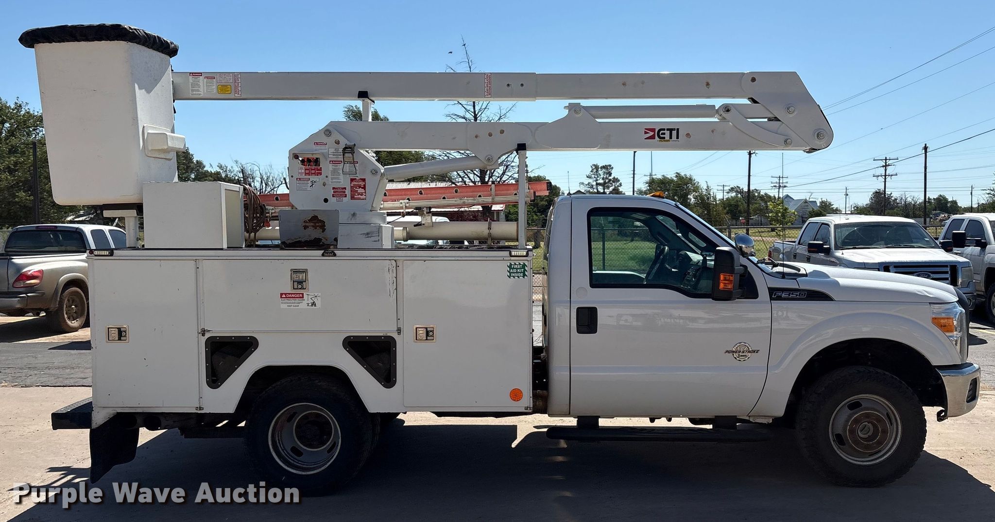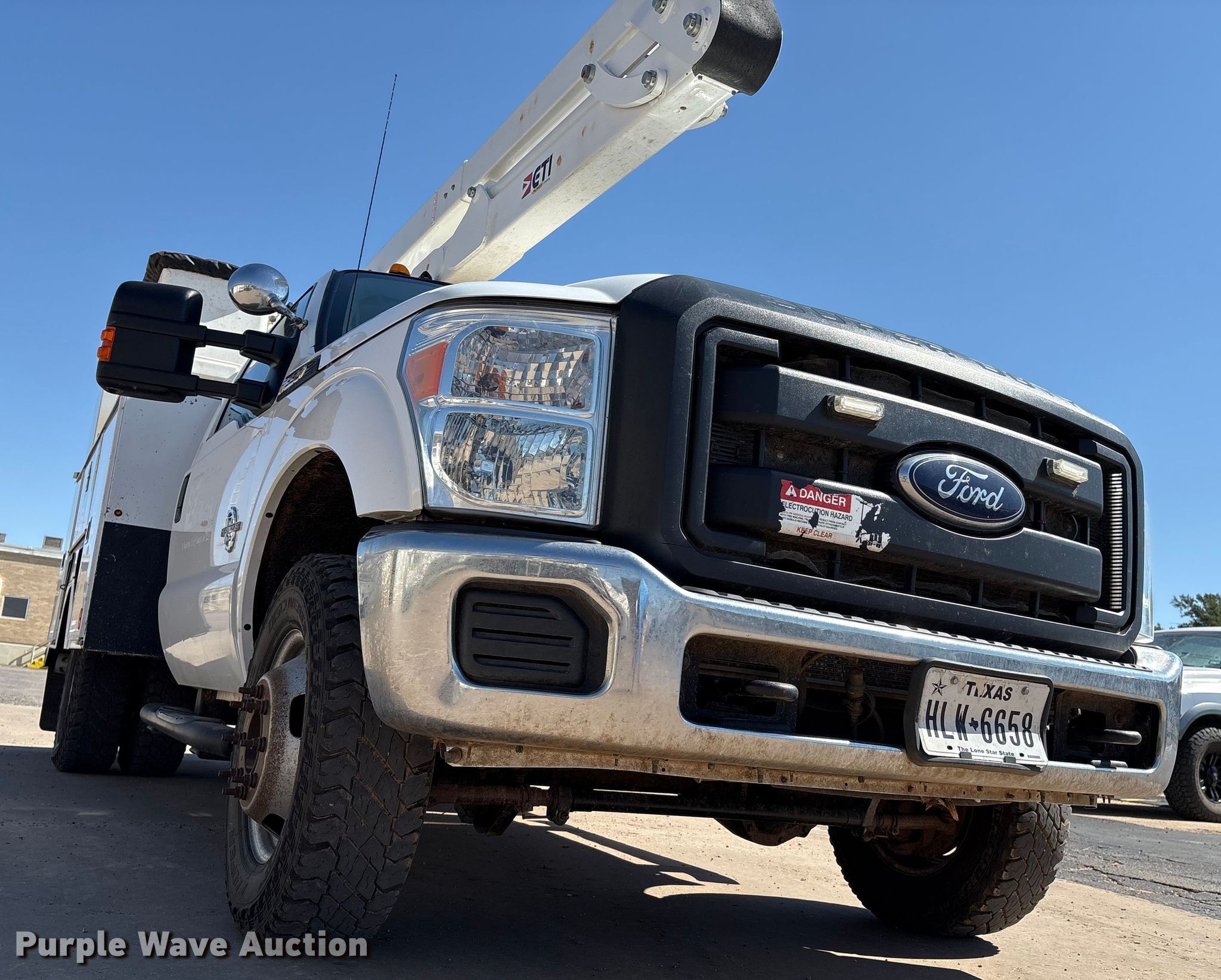 2016 Ford F350 Super Duty bucket truck. Miles: 201,044 on odometer, VIN: 1FDRF3HT7GEC72480. Engine Displacement: 6.7L V8 OHV, Cylinders: 8, Fuel type: Diesel. Transmission Automatic. Chassis Four wheel drive, Axles: Single, Suspension: Spring, Brakes: Hydraulic, PTO, GVWR: 14,000 lbs, Wheelbase: 141". Interior AC, Heat, Heated mirrors, Power windows, Power locks, Cruise control, Auxiliary controls. Features Bed ETI SB108DD96A0O, Serial: 19246, Length: 116", Width: 96", Boom 2016 ETI ETA33IH, Serial: 0516A313029, Maximum lift capacity: 350 lbs, Maximum lift height: 33', Boom type: Articulating, Insulated, Man basket, Boom controls Ground, Platform/ basket.. Tires Size: LT235/80R17. Texas title. Title distribution may be delayed up to 30 days from verification of funds. Swisher Electric Cooperative, Inc.. Tulia, TX 79088