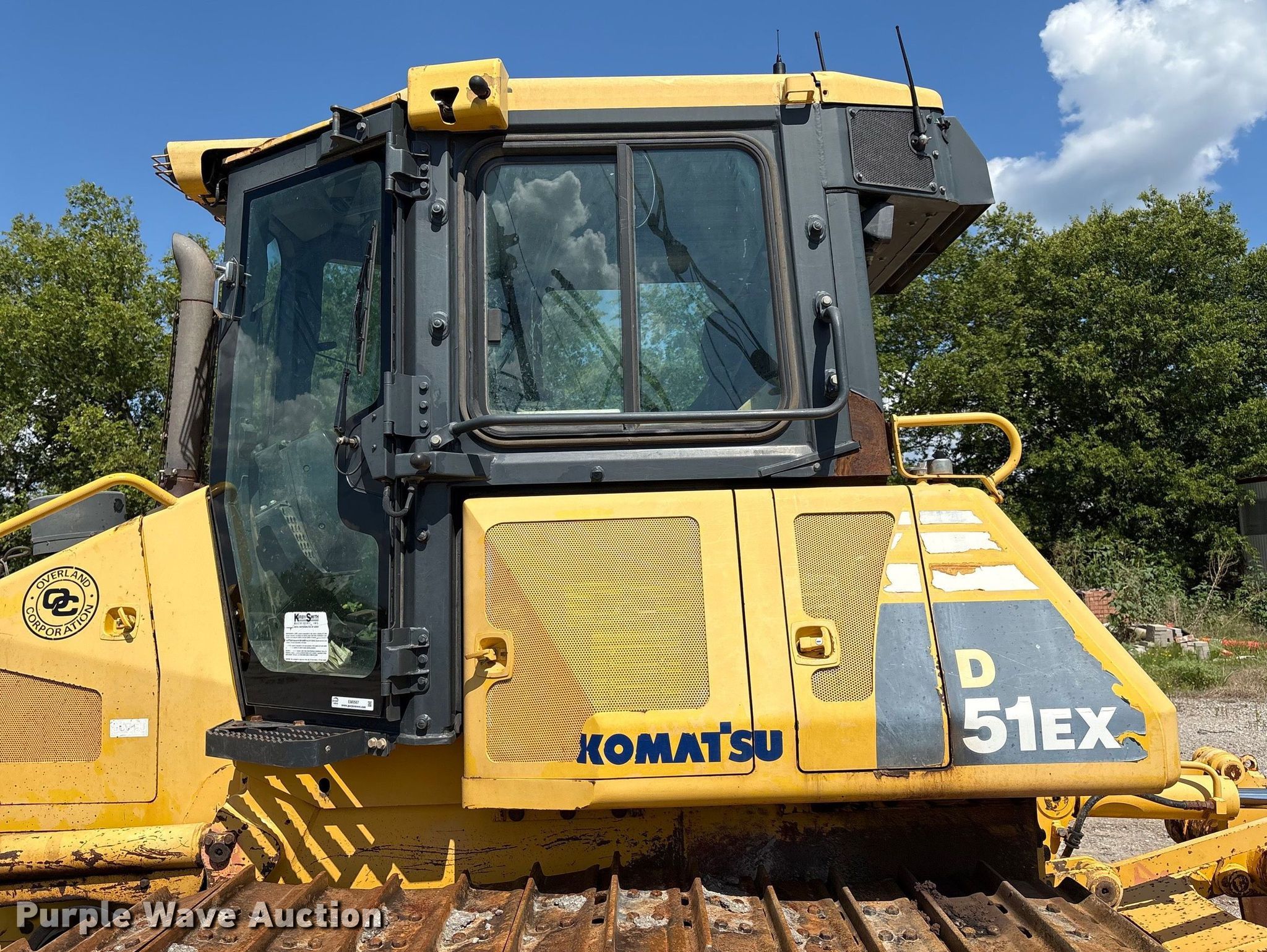 2013 Komatsu D51EX dozer. Hours: 5,046 on meter, Serial: KMT0D080C51B13227. Engine Komatsu, Displacement: 6.7L, Cylinders: 6, Fuel type: Diesel. Transmission Hydrostatic. Operators station Enclosed cab, AC, Heat. Features Dozer blade Blade type: 6-way, Blade shape: Straight, Width: 112", Attachments Ripper Komatsu 4CD01-5, Shanks: 3.. Tracks Width: 22", Grouser pads: Single, Bottom rollers: 7, Track guards. Notes Jump start required during on-site data collection, Non-operational transmission , Engine issues , Requires starting fluid to start, does not stay running. Overland Corporation. 534 U.S. 77. Ardmore, OK 73401
