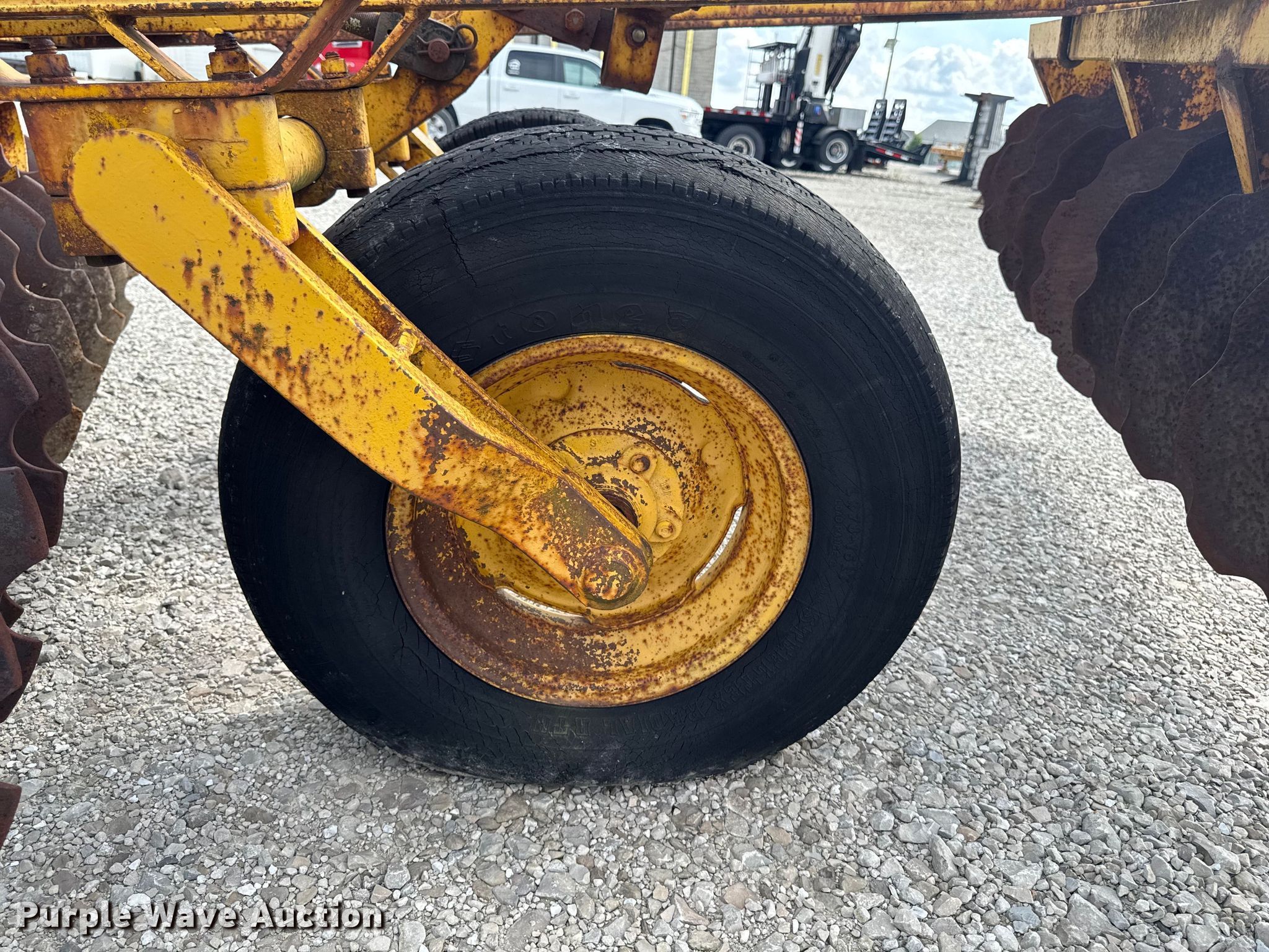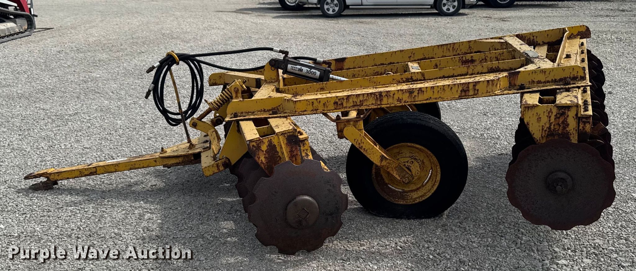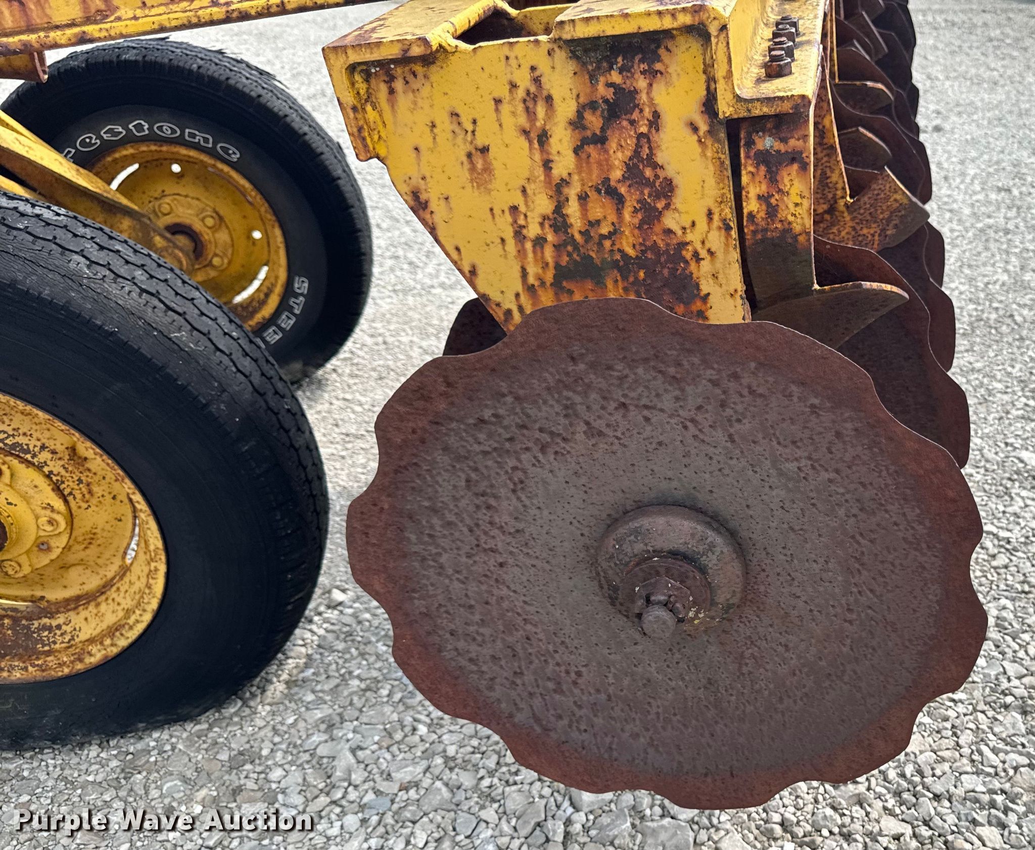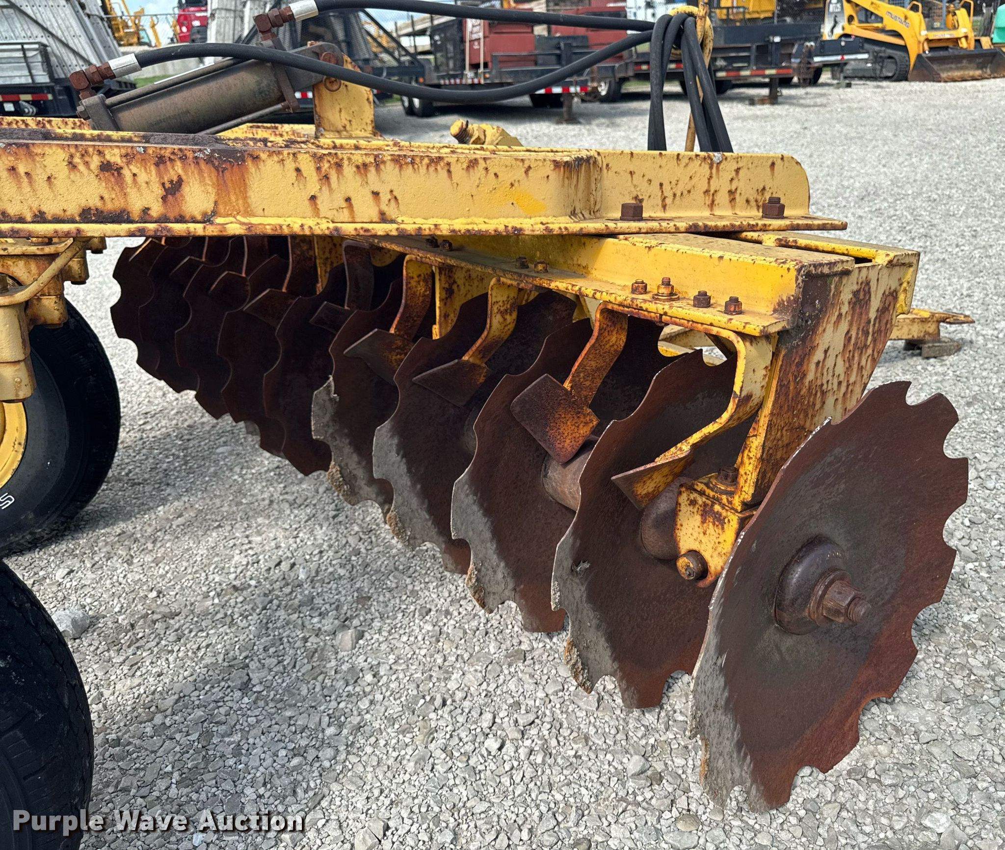 AMCO 2022-BG off-set disk. Overall width: 7', Serial: 807. Features Front blades Diameter: 22", Spacing: 10", Rear blades Diameter: 20", Spacing: 10", Disk scrapers, Operation Hydraulic lift, Leveler: Manual. Tires Tire size: LR78-15LT. Pella Concrete Contractors Inc. Pella, IA 50219