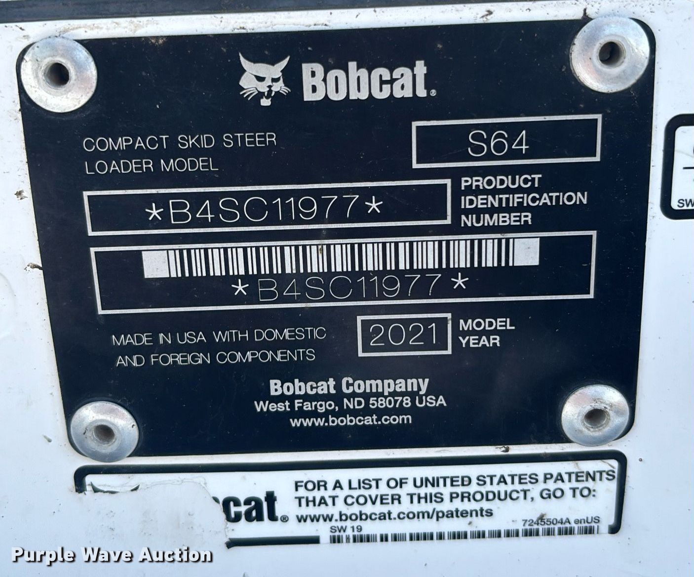 Purple Wave is selling a used Skid Steer Loader in Arizona. This item is a 2021 Bobcat S64 R-Series skid steer loader with the following: Hours: 1,050 on meter, Serial: B4SC11977