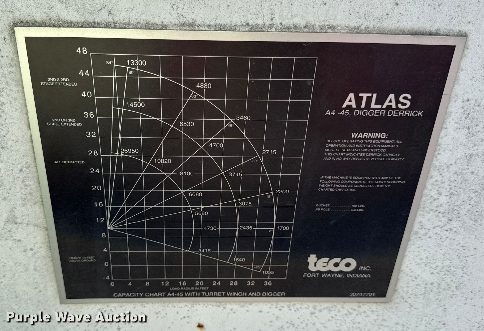2001 International 4700 digger derrick truck. Miles: 104,807 on odometer, Hours: 9,346 on meter, VIN: 1HTSCAAN61H368673. Engine International DT466E, Displacement: 7.6L, Cylinders: 6, Fuel type: Diesel. Transmission Allison, Automatic. Chassis Axles: Single, Suspension: Spring, Brakes: Air, PTO. Interior AC, Heat, Brake controller. Features Boom Model: A4-45R-FT22-CTW0, Maximum lift capacity: 15,000 lbs, Maximum lift height: 45', Boom type: Insulated, Telescopic, Boom controls Platform/ basket, Pressure digger, Material handler, Pole guide, Auger Diameter: 20".. Tires Size: 11R22.5. Notes Dead battery. Kansas title. Title distribution may be delayed up to 14 days from verification of funds. CDL Electric. Pittsburg, KS 66762