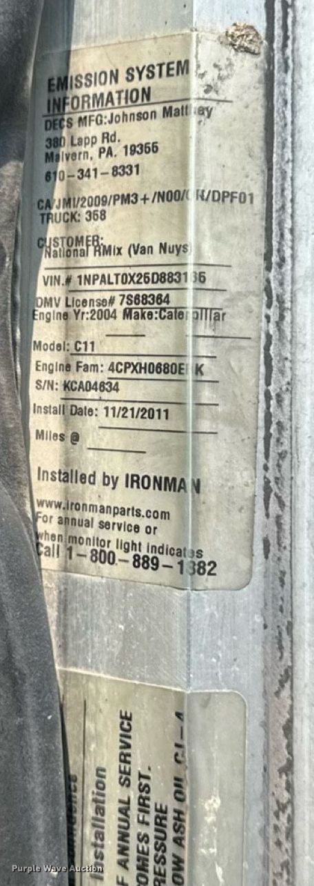 2005 Peterbilt 357 dump truck. Miles: 231,819 on odometer, Hours: 28,896 on meter, VIN: 1NPALT0X25D883165. Engine Caterpillar C11, Displacement: 10.3L, Cylinders: 6, Fuel type: Diesel, Engine brake. Transmission Allison, Automatic. Chassis Axles: Tandem, Differential lock: Inter-axle, Suspension: Spring over walking beam, Brakes: Air, PTO, GVWR: 62,000 lbs FAWR: 20,000 lbs, IAWR: 22,000 lbs, RAWR: 22,000 lbs. Interior AC, Heat, Power windows, Cruise control, Brake controller. Features Bed Dump bed, Reiter inc, Serial: 1299231, Length: 17' 8", Width: 96", Side height: 48", Side board height: 12", Bed type: Aluminum, Ram: Single, End gate: Air operated. Tires Front: 425/65R22.5, Rear: 11R22.5. Iowa title. Title distribution may be delayed up to 14 days from verification of funds. J & J Ready Mix. Centerville, IA 52544