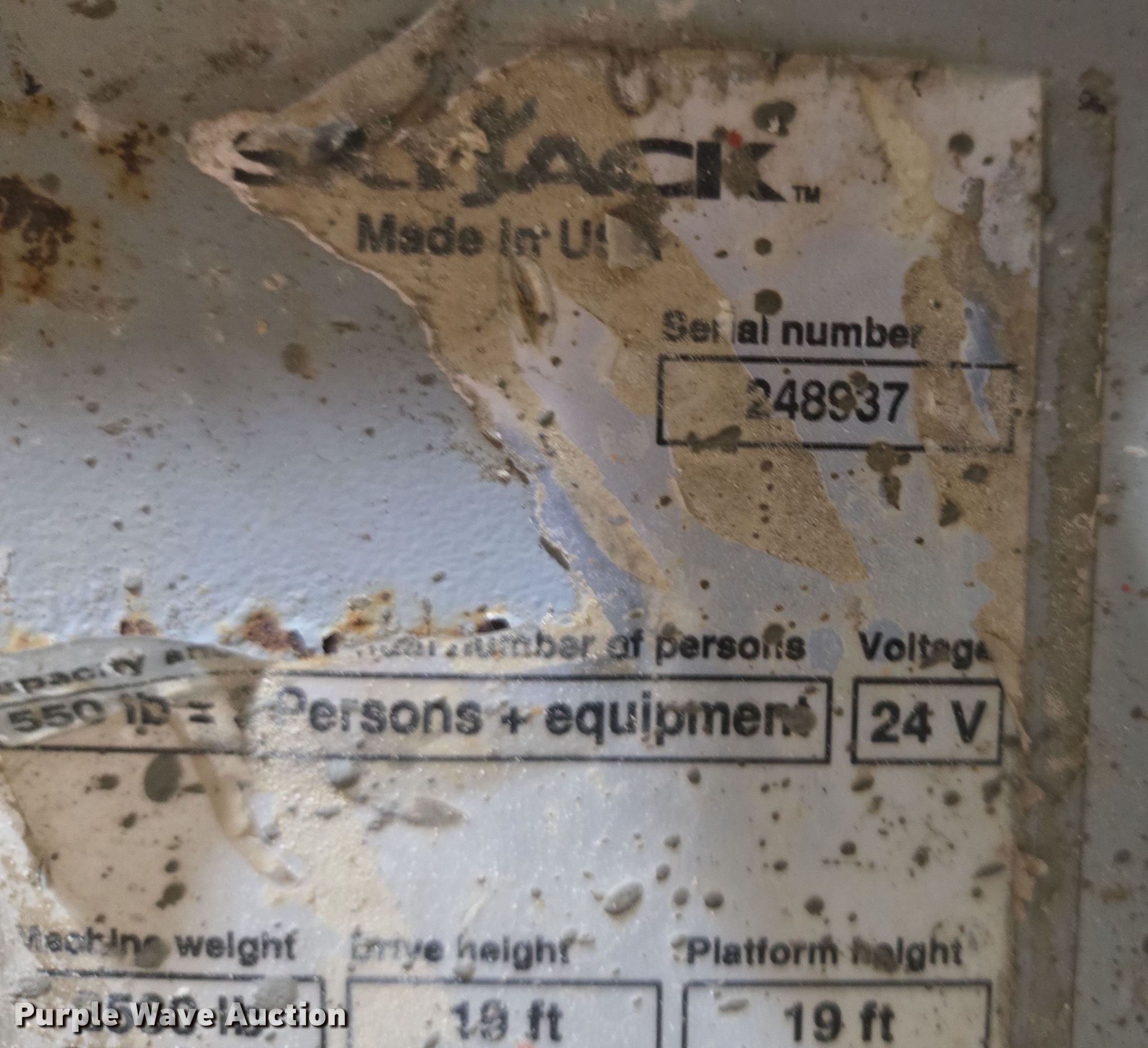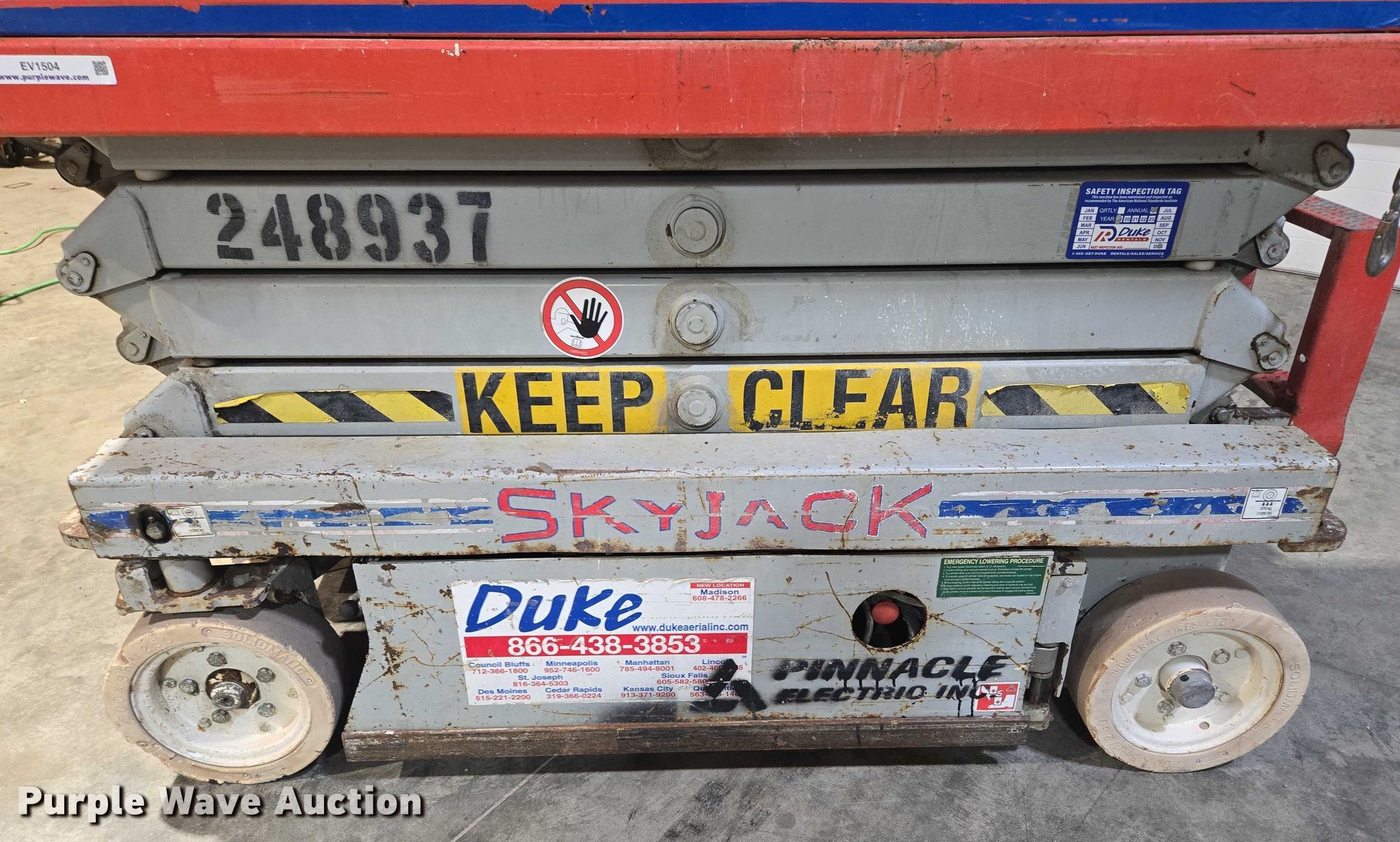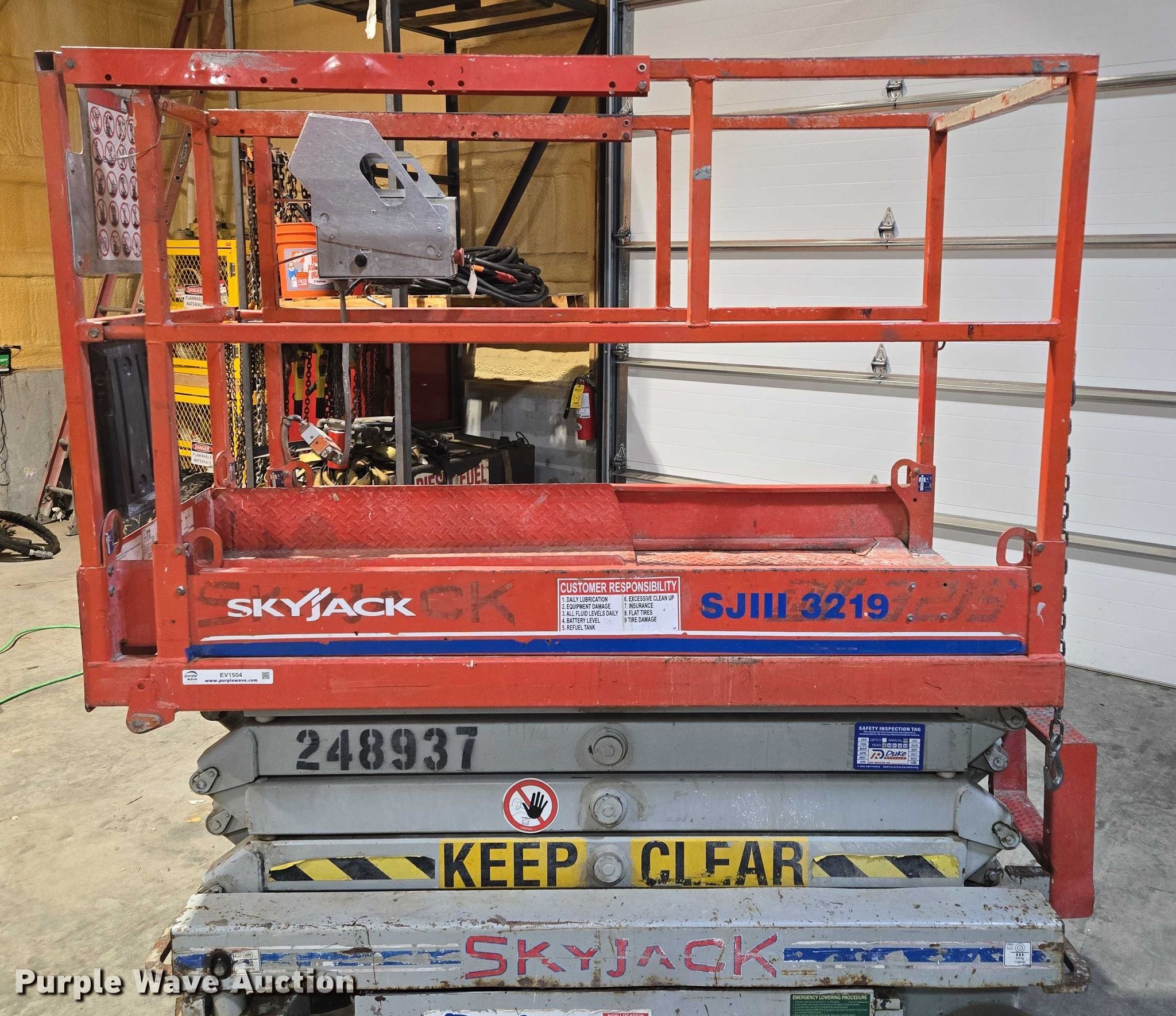 2005 SkyJack SJIII 3219 scissor lift. Hours: 409 on meter, Serial: 248937. Electric Motor Volts: 24. Features Maximum lift capacity: 550 lbs, Maximum lift height: 19', Platform: 63" L x 28" W, AC power outlet, Controls: Platform, Platform extensions: Manual, Safety alarm. Tires Tire size: 200x8, Solid. St. Joseph, MO 64506