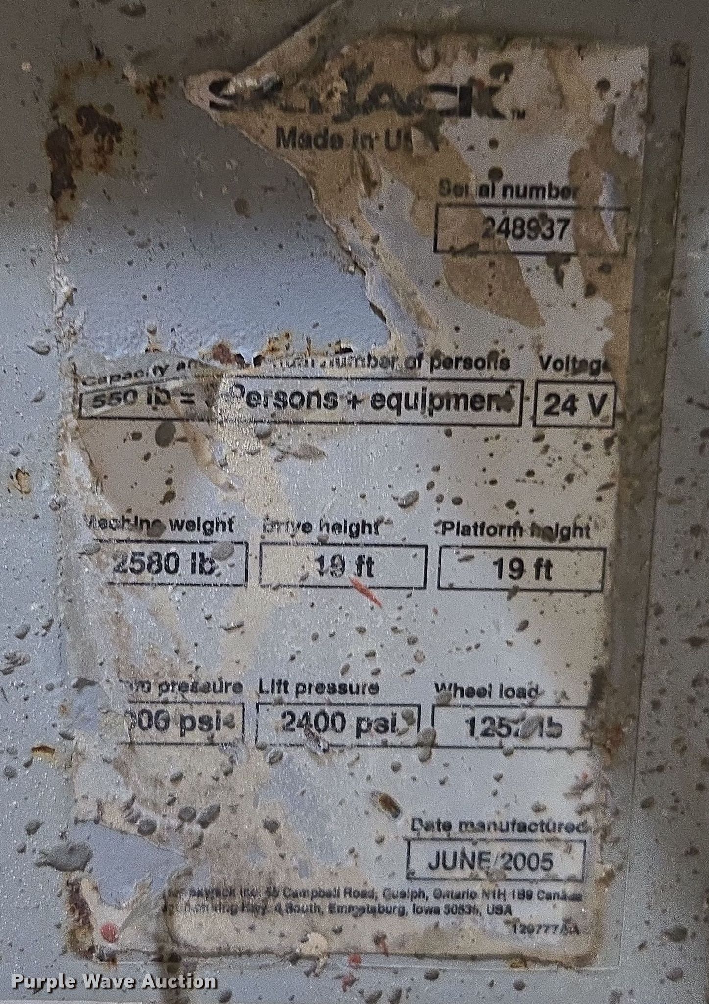 Purple Wave is selling a used Scissor or Vertical Lift in Missouri. This item is a 2005 SkyJack SJIII 3219 scissor lift with the following: Hours: 409 on meter, Serial: 248937