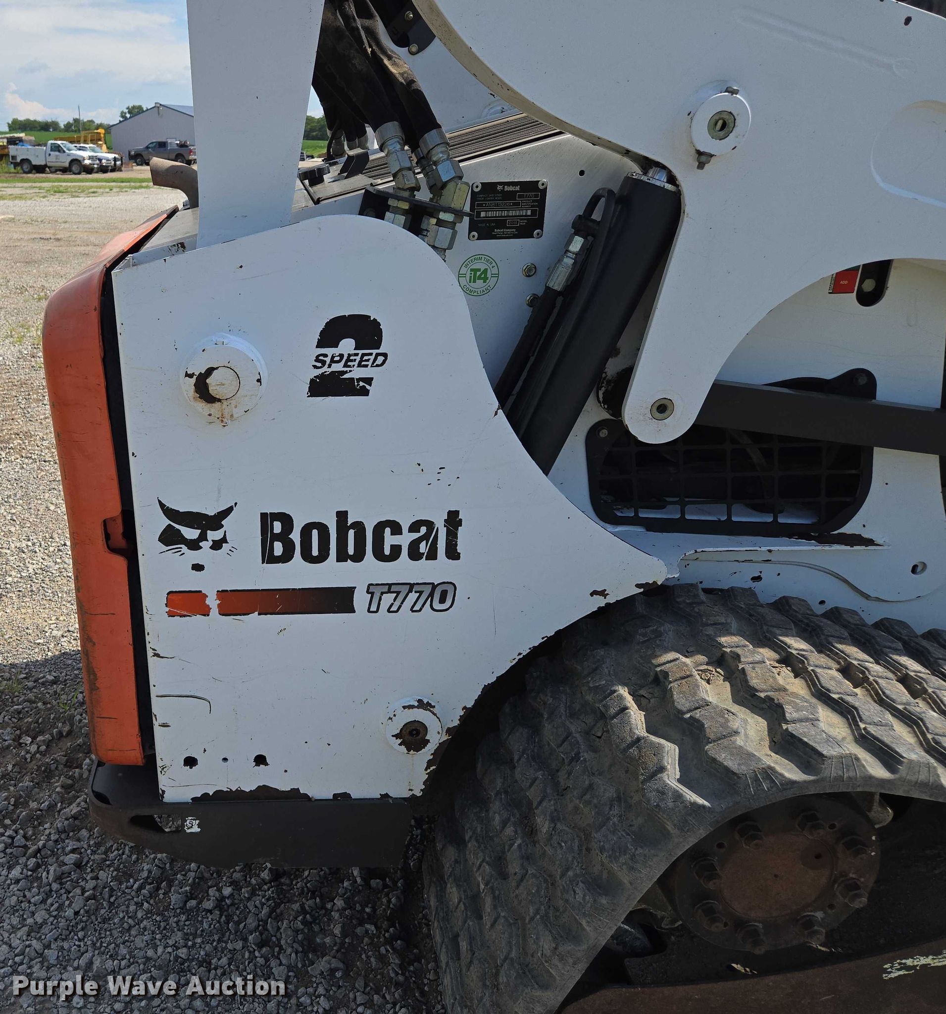 2014 Bobcat T770 tracked skid steer loader. Hours: 3,056 on meter, Serial: AN8T13226. Engine Kubota V3800-CR-T-EF09, Displacement: 3.8L, Cylinders: 4, Fuel type: Diesel, kW: 67.6. Transmission Hydrostatic, Two speed travel. Operators station Enclosed cab, AC, Heat, Bucket control: Hand, Pattern changer, Electronic Monitoring System panel. Features Auxiliary hydraulics, Auxiliary electrical outlet, Quick coupler: Hydraulic, Bucket Width: 80", Cutting edge: Weld-on, Teeth: Bolt-on. Tracks Width: 17.5". Lance Construction. Savannah, MO 64485