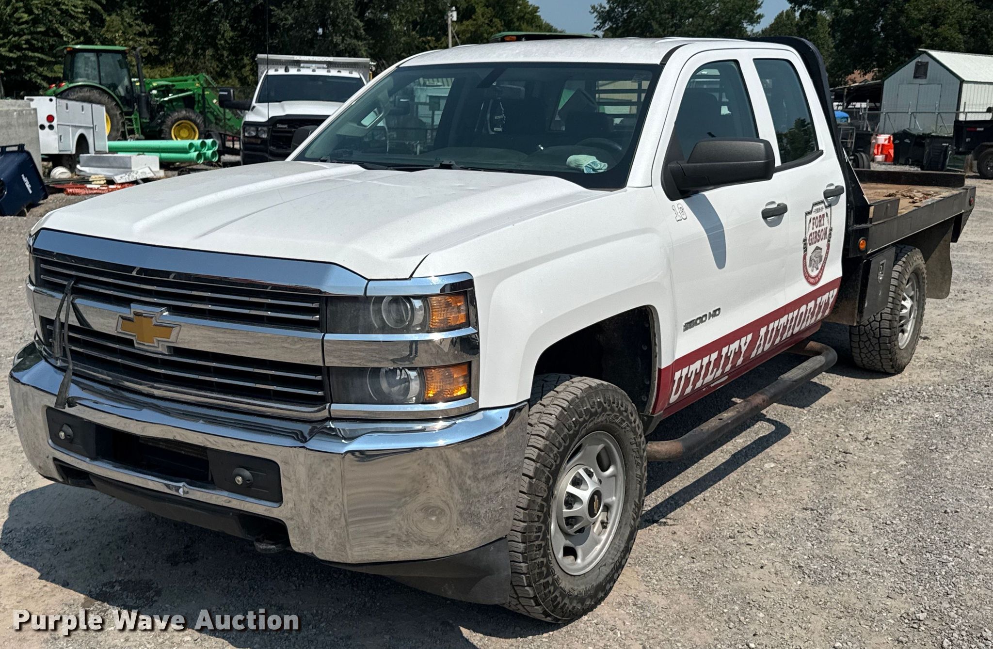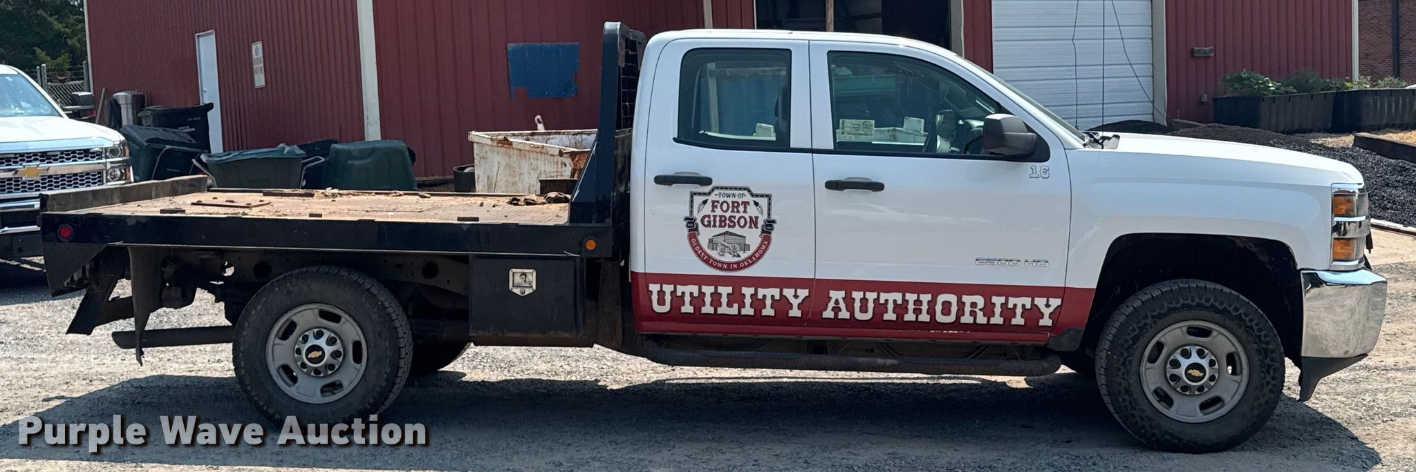 2015 Chevrolet Silverado 2500HD Double Cab flatbed pickup truck. Miles: 73,507 on odometer, VIN: 1GC2KUEG3FZ550670. Engine Displacement: 6.0L V8 OHV, Cylinders: 8, Fuel type: Gas. Transmission Automatic, Four wheel drive. Interior AC, Heat, Heated mirrors, Power windows, Power locks, Cruise control. Features Bed Flatbed, Length: 8' 6", Width: 82", Hitch: Gooseneck. Tires Size: LT265/70R17. Oklahoma title. Title distribution may be delayed up to 14 days from verification of funds. City of Fort Gibson. 200 West Poplar Street. Fort Gibson, OK 74434
