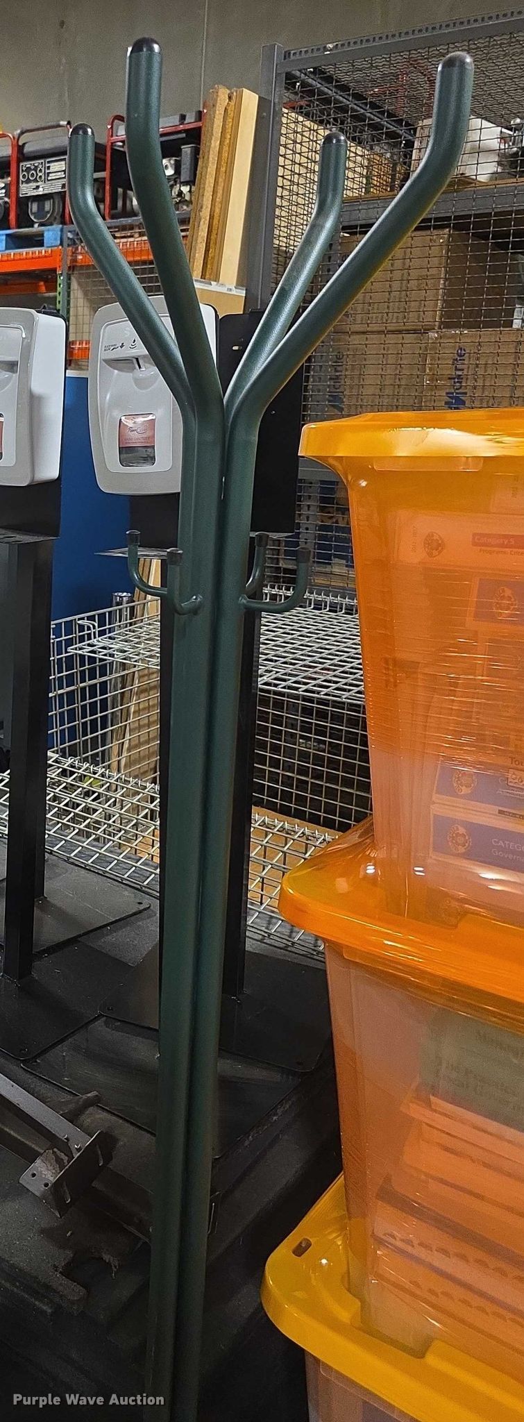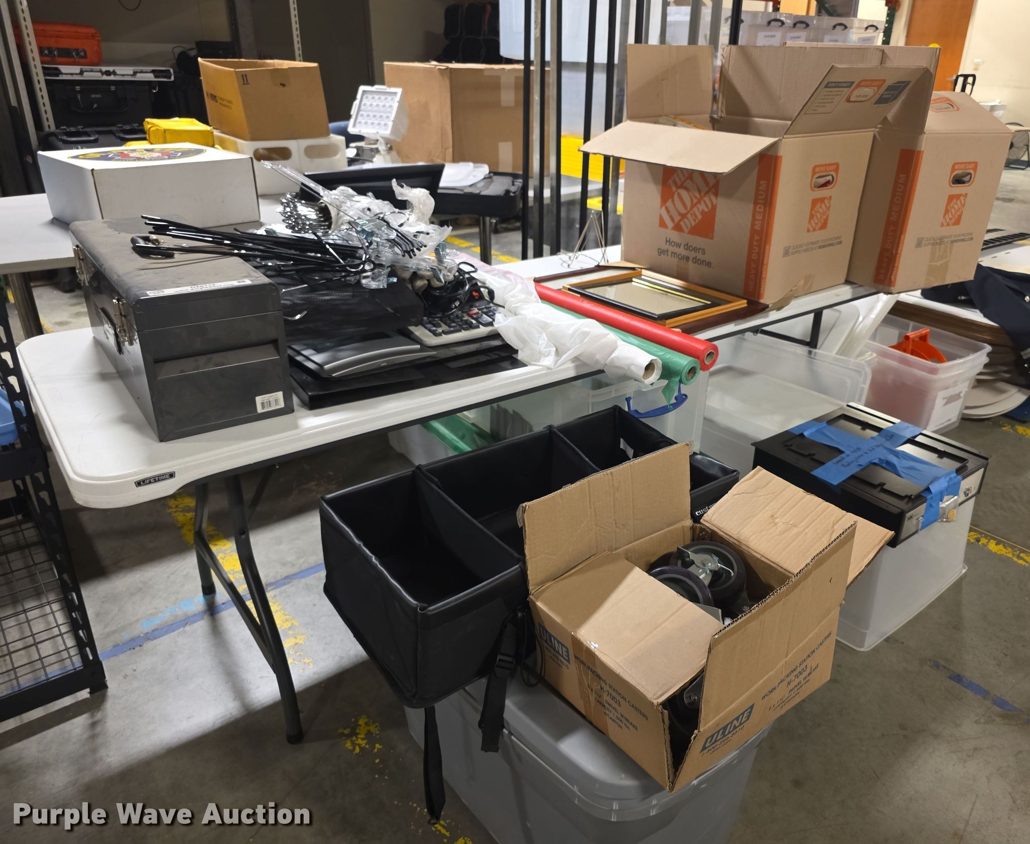 Purple Wave is selling a used Office Supplies and Equip. in Kansas. This item is a Office equipment with the following: Table, Dimensions: 10' x 46", Cash register, Toolbox, Helmets, Calculator, Picture frames, Bed frame, Coat rack, Hand sanitizer stations and more