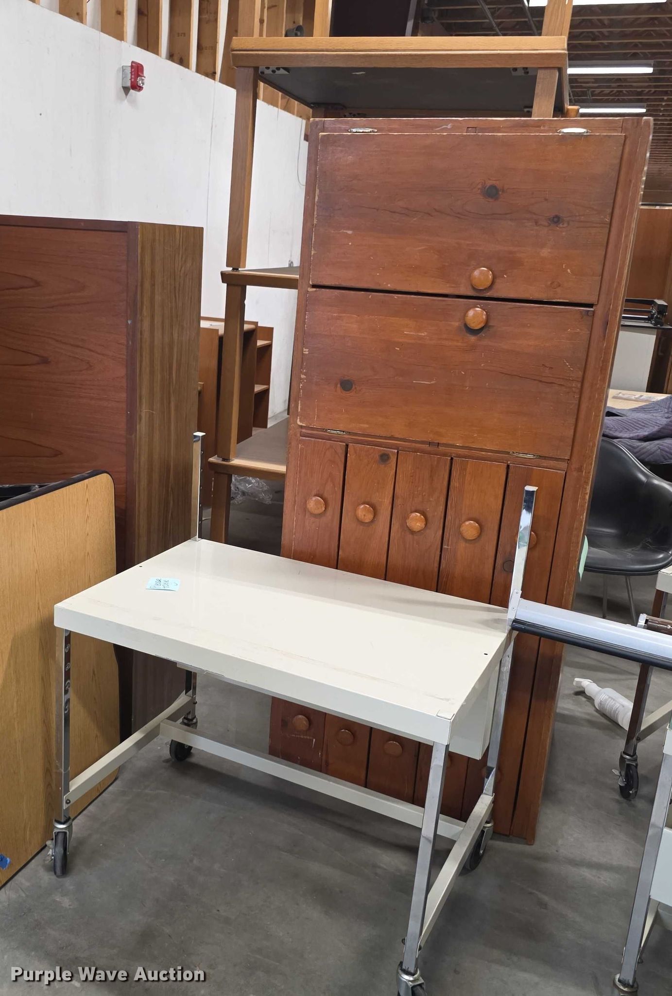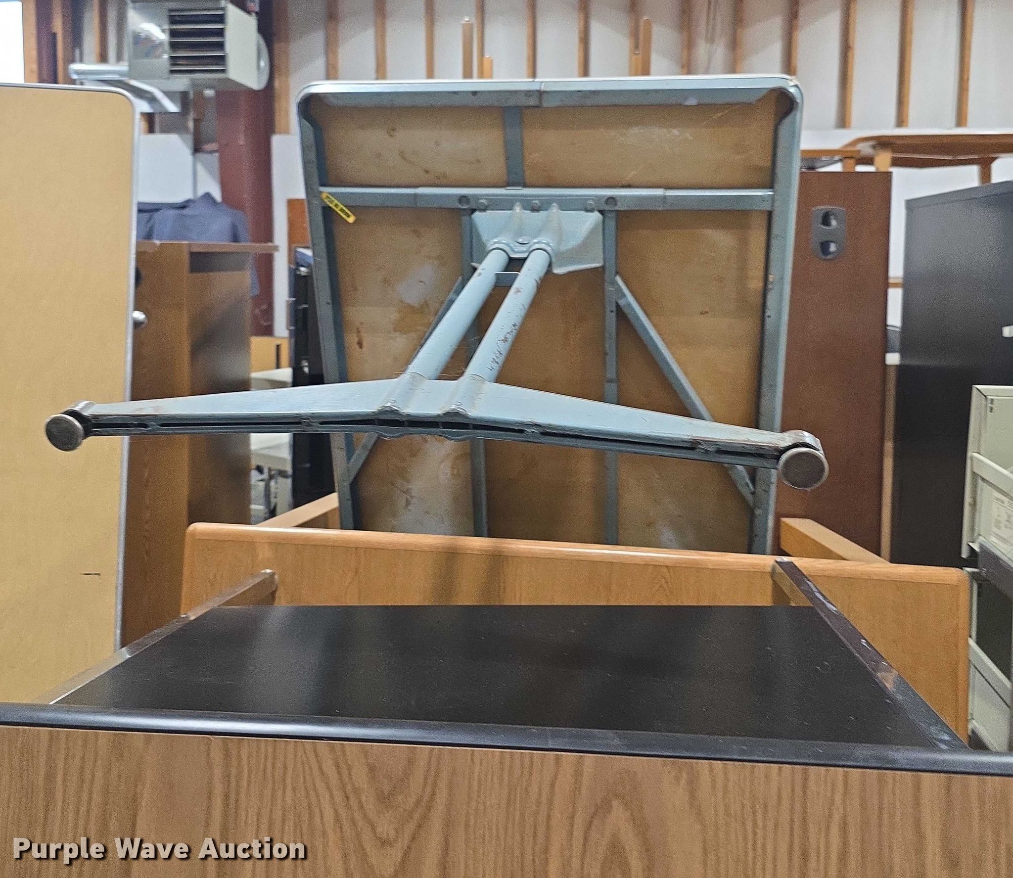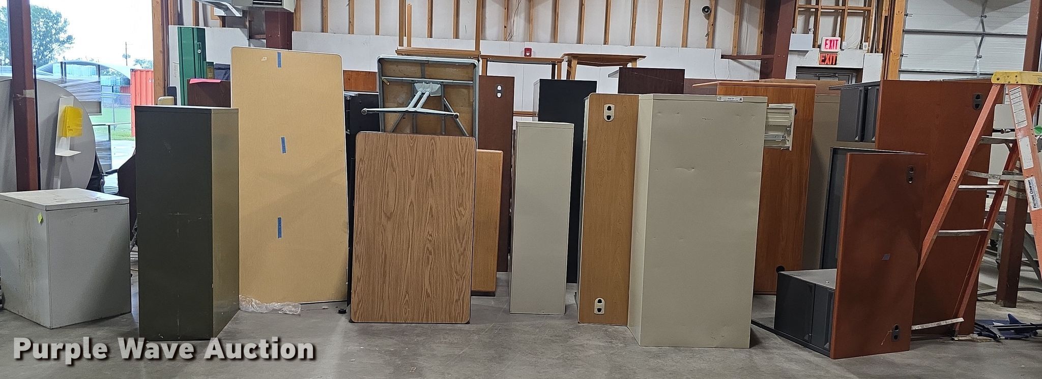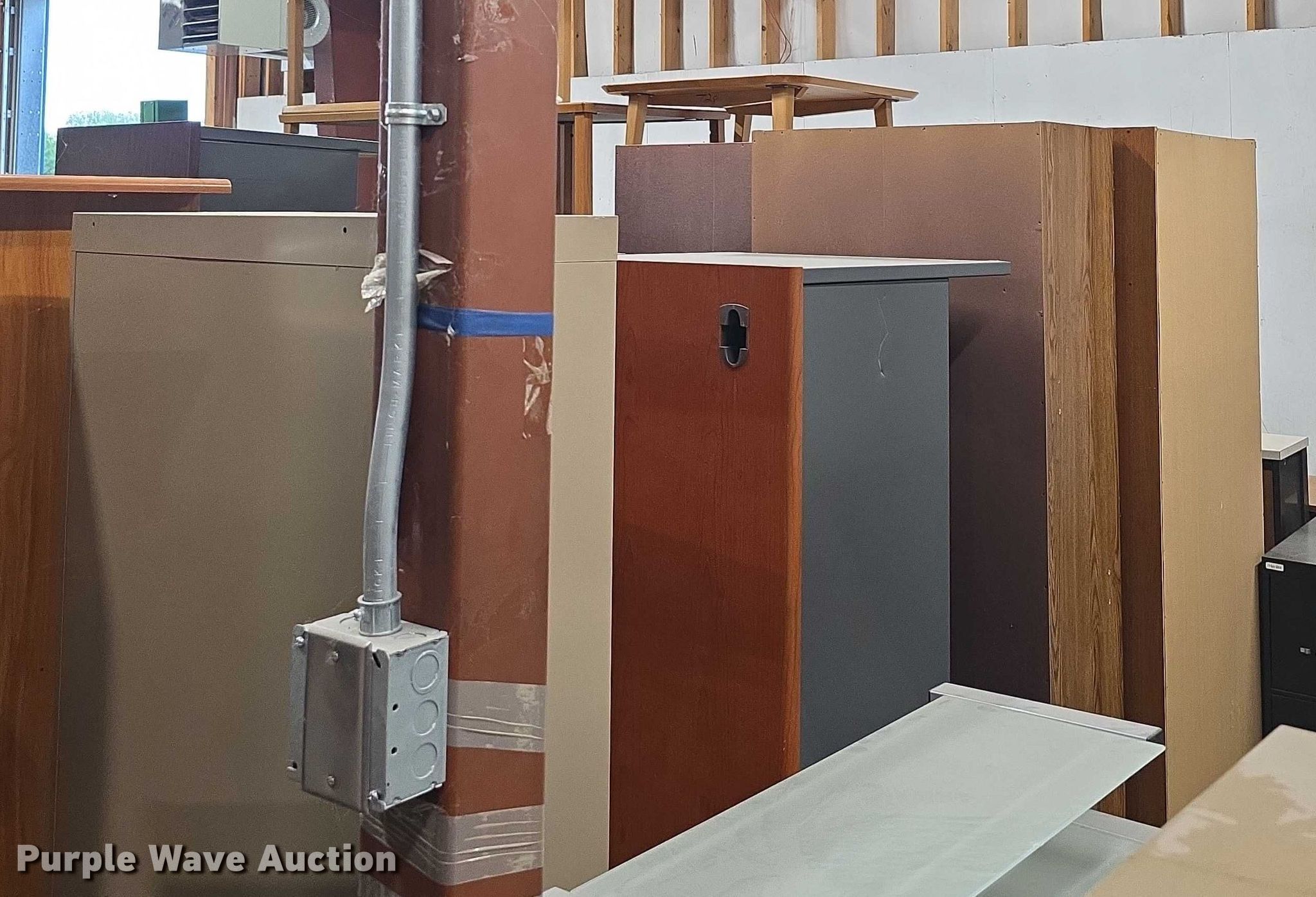 Purple Wave is selling a used Furniture in Kansas. This item is a Furniture with the following: (2) chairs, (15) desks, (11) filing cabinets, (18) tables, (7) Bookcases, (2) Podiums, (2) Projector screens, Cabinet, Step ladder