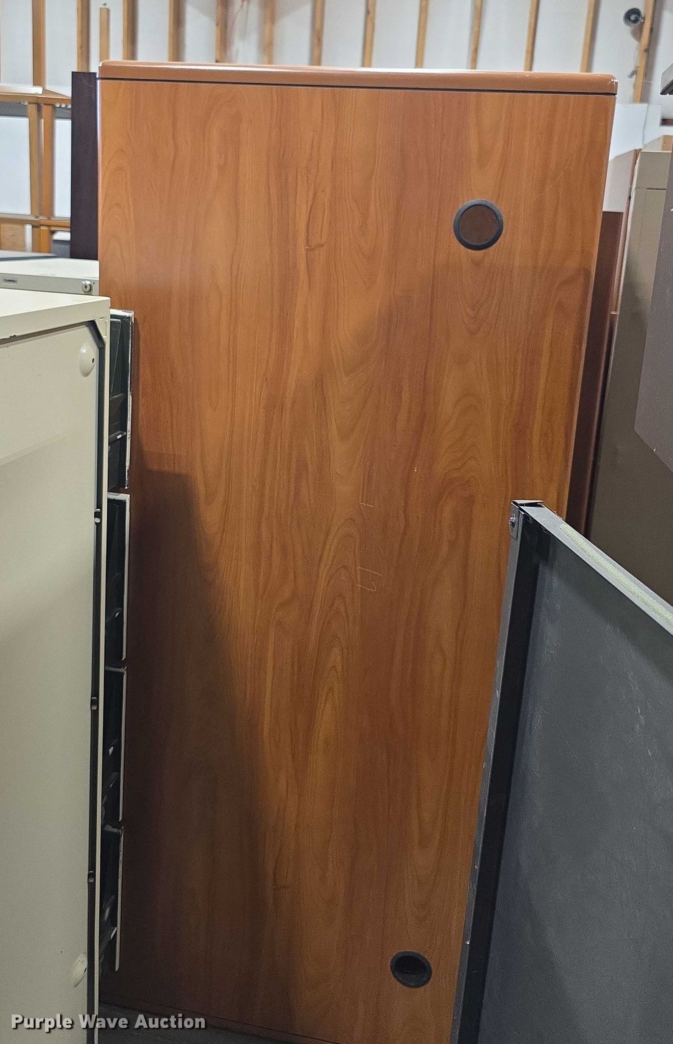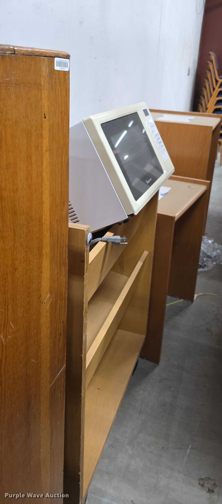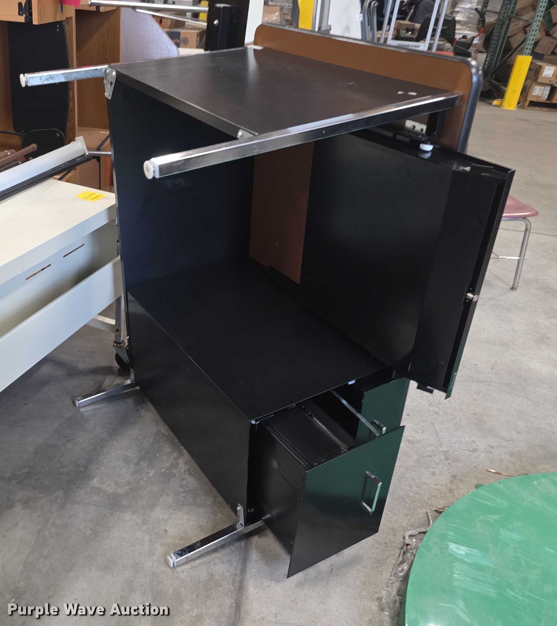 Purple Wave is selling a used Furniture in Kansas. This item is a Furniture with the following: (2) chairs, (15) desks, (11) filing cabinets, (18) tables, (7) Bookcases, (2) Podiums, (2) Projector screens, Cabinet, Step ladder