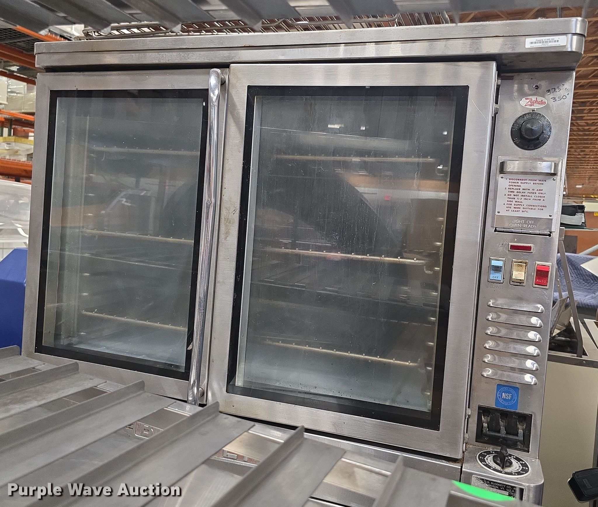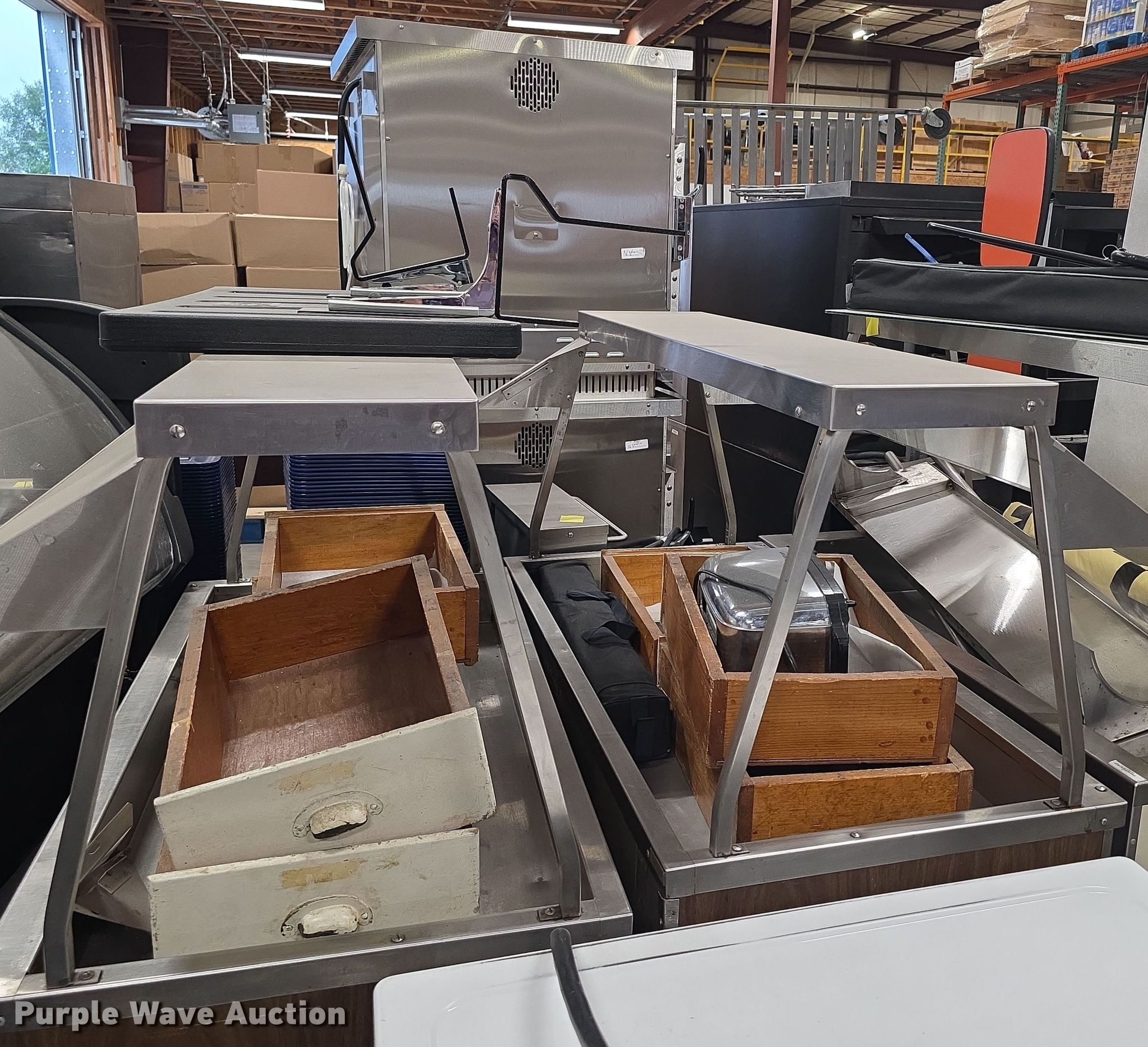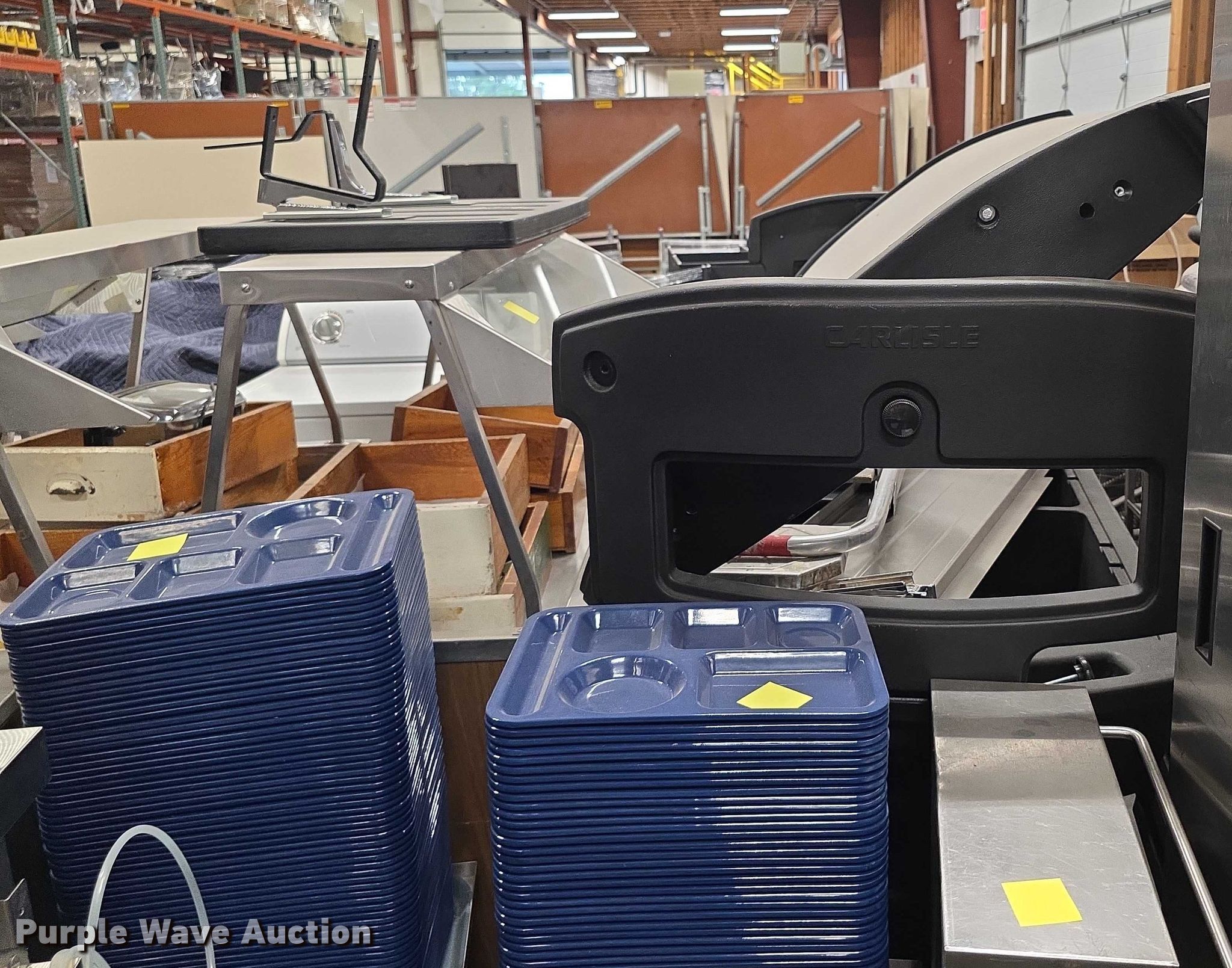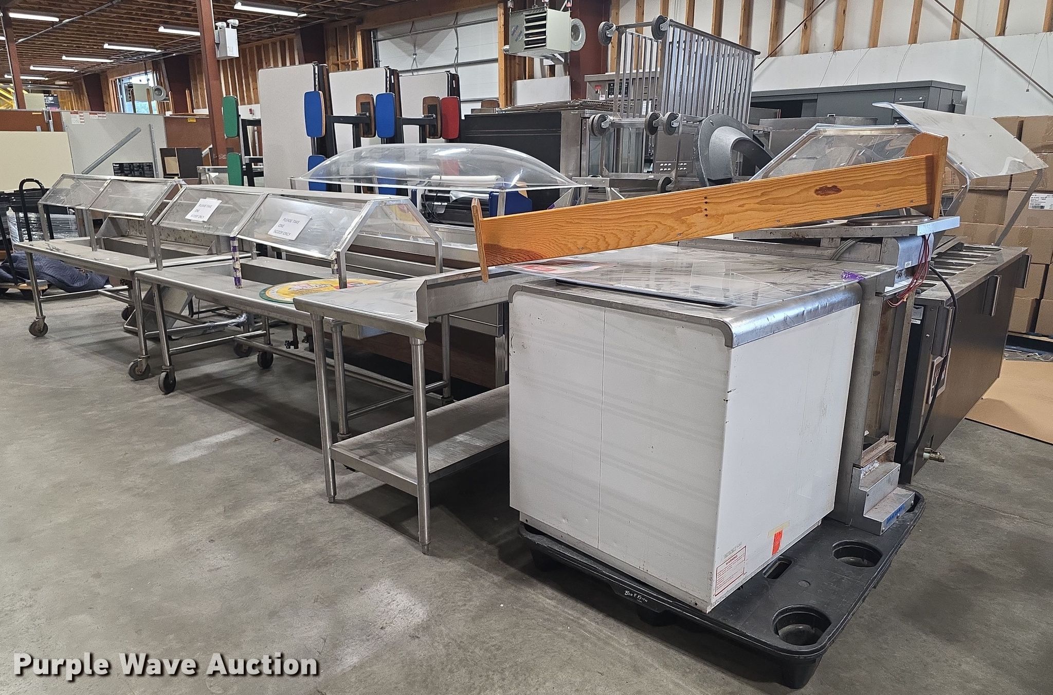 Purple Wave is selling a used Restaurant Equip. in Kansas. This item is a Restaurant equipment with the following: Steam tables, Ice cream freezer, Sheet pan rack, Blodgett double stacked convection ovens, Lunchroom tables, Dryer, Cold tables, Serving trays, Warming cabinets and more