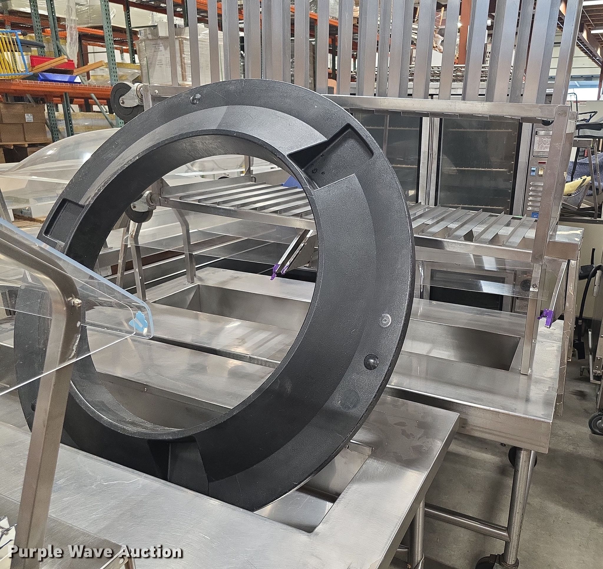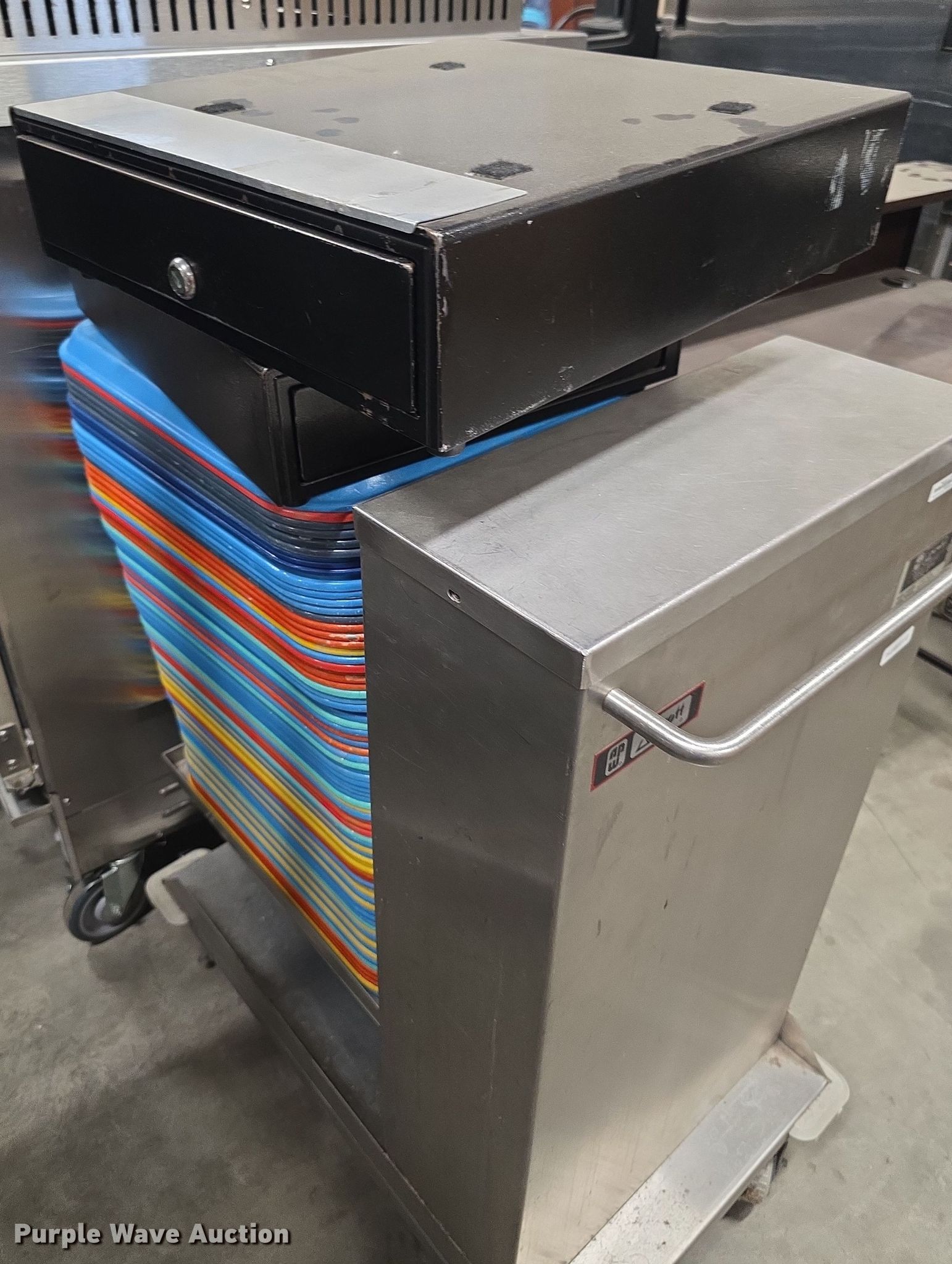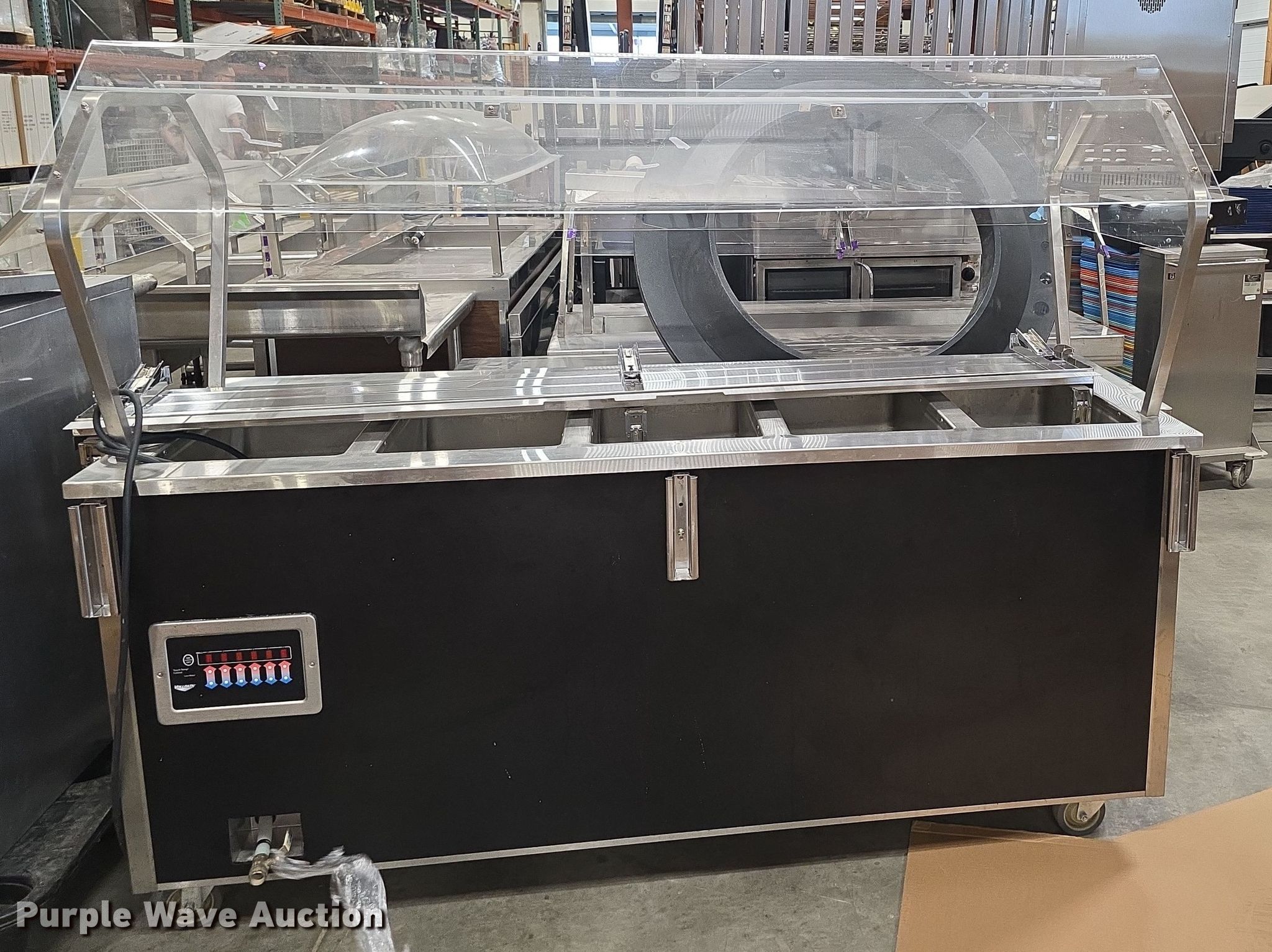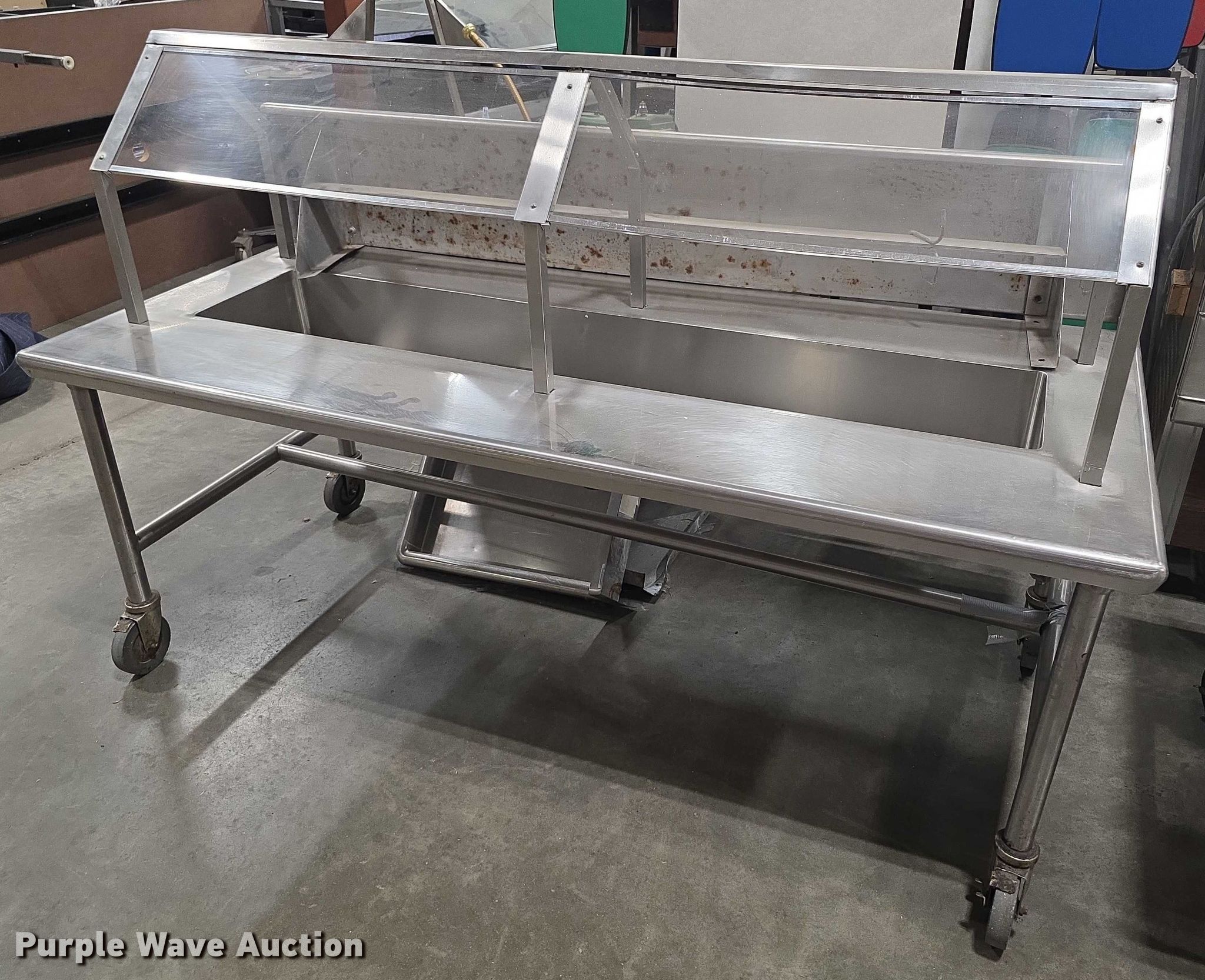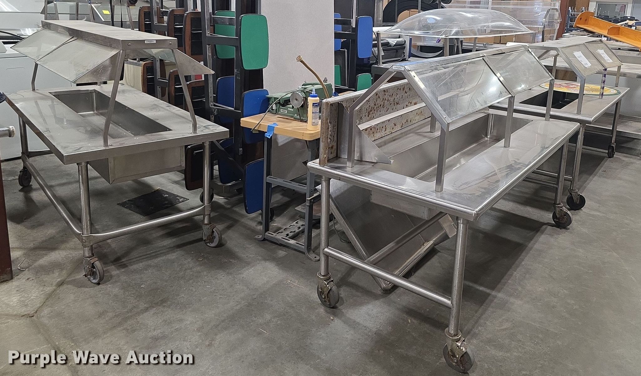 Purple Wave is selling a used Restaurant Equip. in Kansas. This item is a Restaurant equipment with the following: Steam tables, Ice cream freezer, Sheet pan rack, Blodgett double stacked convection ovens, Lunchroom tables, Dryer, Cold tables, Serving trays, Warming cabinets and more