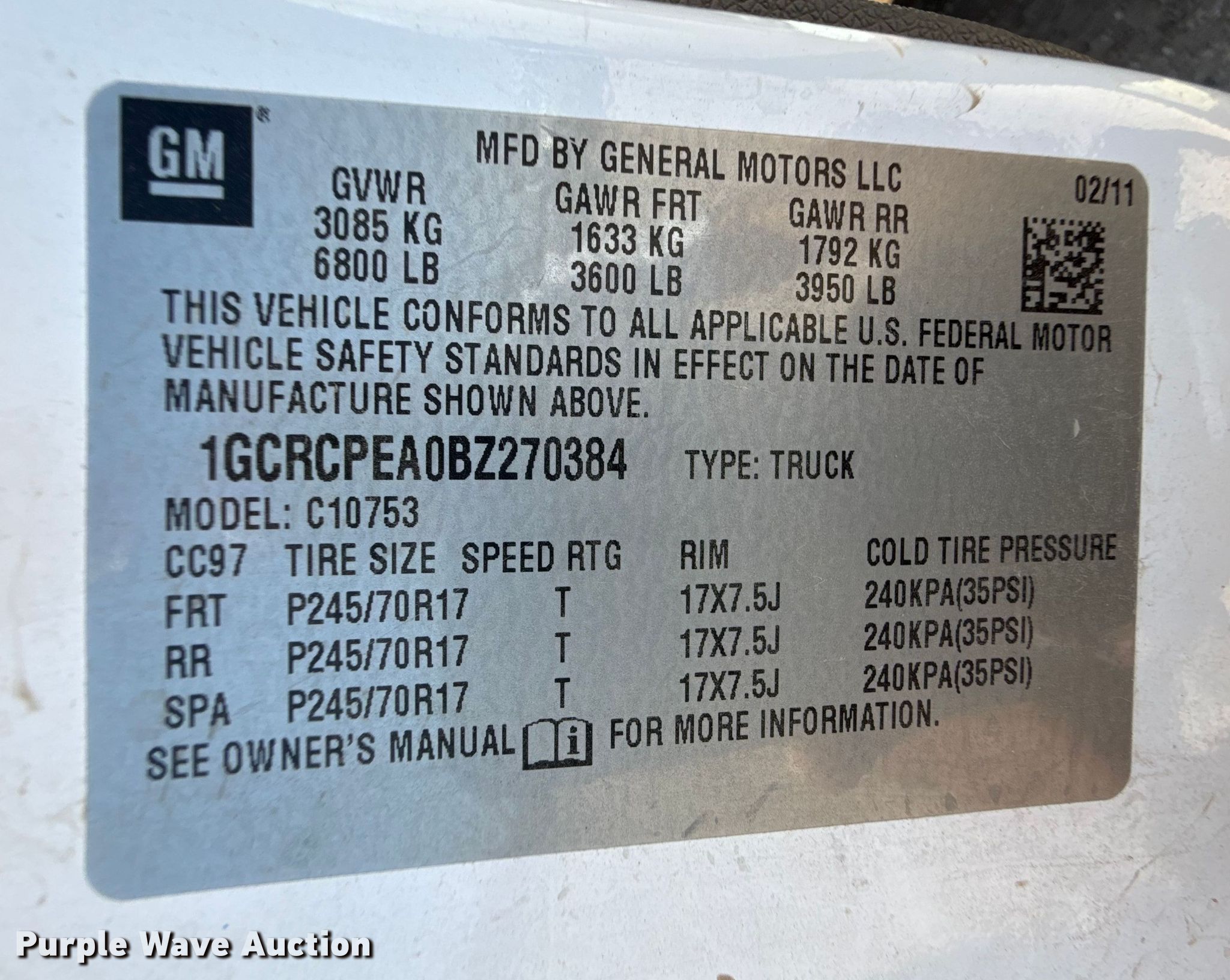 Purple Wave is selling a used 1/2 Ton Pickup or Van in Oklahoma. This item is a 2011 Chevrolet Silverado 1500 Ext. Cab pickup truck with the following: Miles: 72,638 on odometer, VIN: 1GCRCPEA0BZ270384