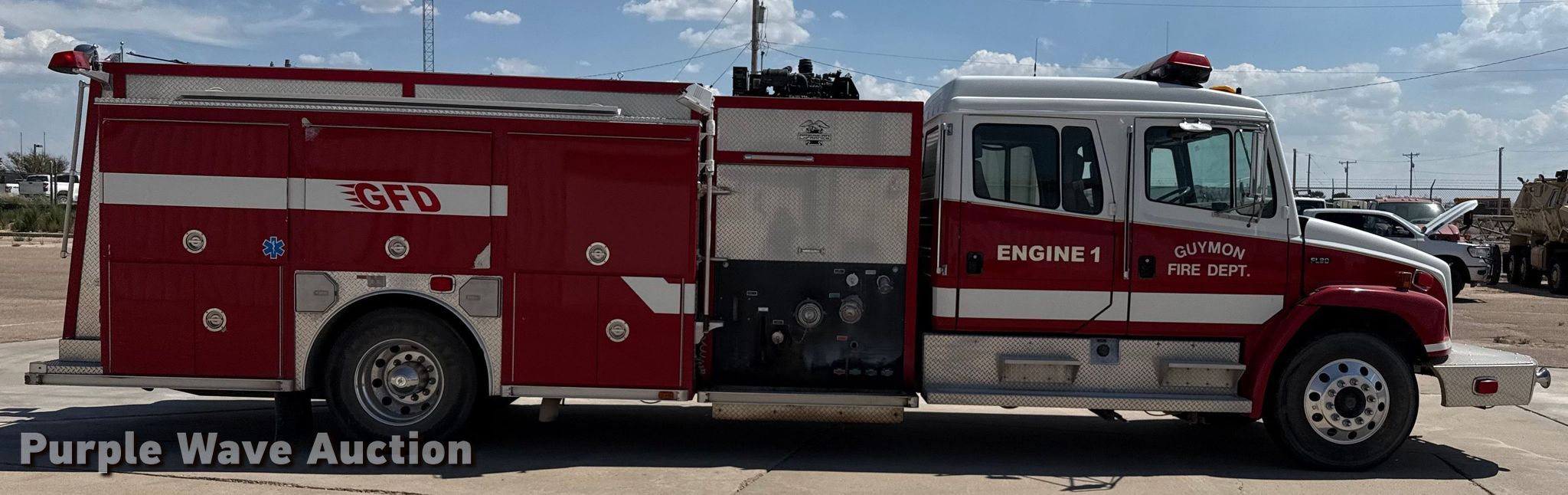 2001 Freightliner FL80 pumper fire truck. Miles: 32,835 on odometer, Hours: 4,300 on meter, VIN: 1FVABXBS71HH98545. Engine Cummins, Displacement: 8.3L, Cylinders: 6, Fuel type: Diesel. Transmission Automatic. Chassis Axles: Single, Suspension: Spring, Brakes: Air. Interior AC, Heat, Heated mirrors, Cruise control. Features Fire truck body Pump 1,504 gpm.. Tires Size: 11R22.5. Notes Jump start required during on-site data collection. Oklahoma title. Title distribution may be delayed up to 14 days from verification of funds. City of Guymon, OK. Guymon, OK 73942