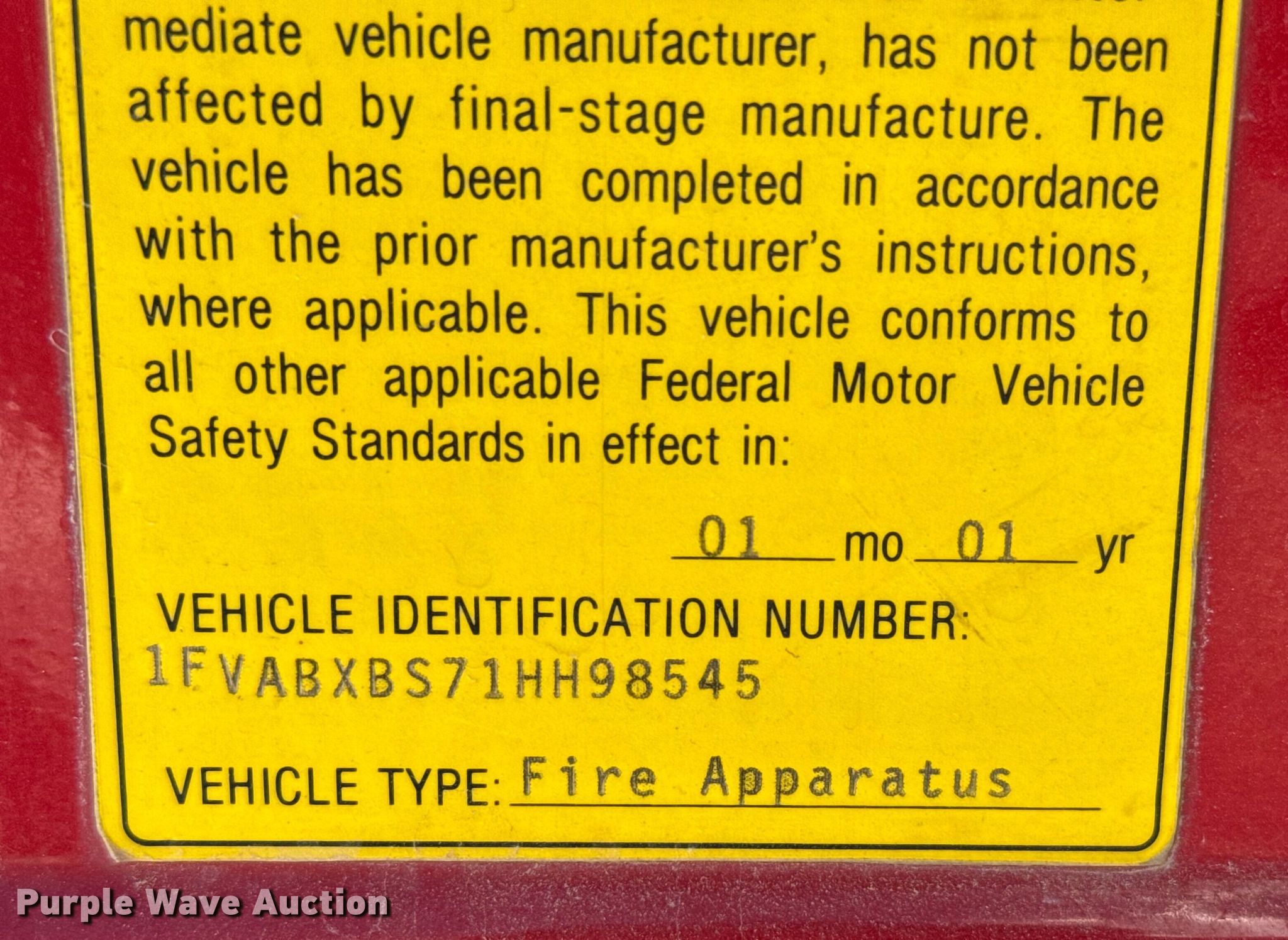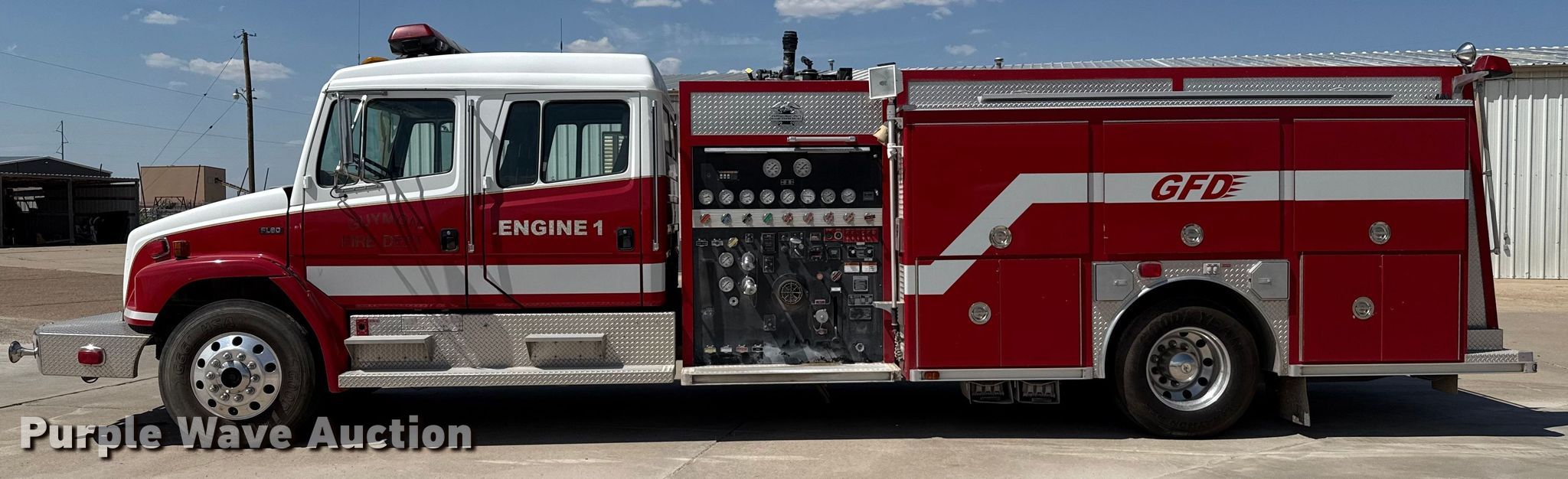 Purple Wave is selling a used Fire Truck or Emergency Vehicle in Oklahoma. This item is a 2001 Freightliner FL80 pumper fire truck with the following: Miles: 32,835 on odometer, Hours: 4,300 on meter, VIN: 1FVABXBS71HH98545