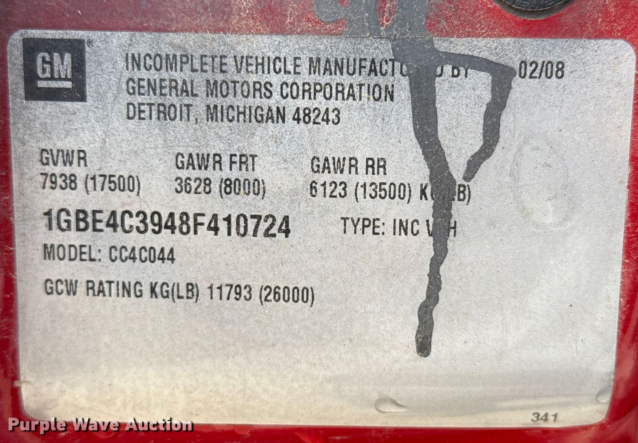 Purple Wave is selling a used Truck Chassis in Oklahoma. This item is a 2008 Chevrolet C4500 truck cab and chassis with the following: Miles: 44,606 on odometer, VIN: 1GBE4C3948F410724