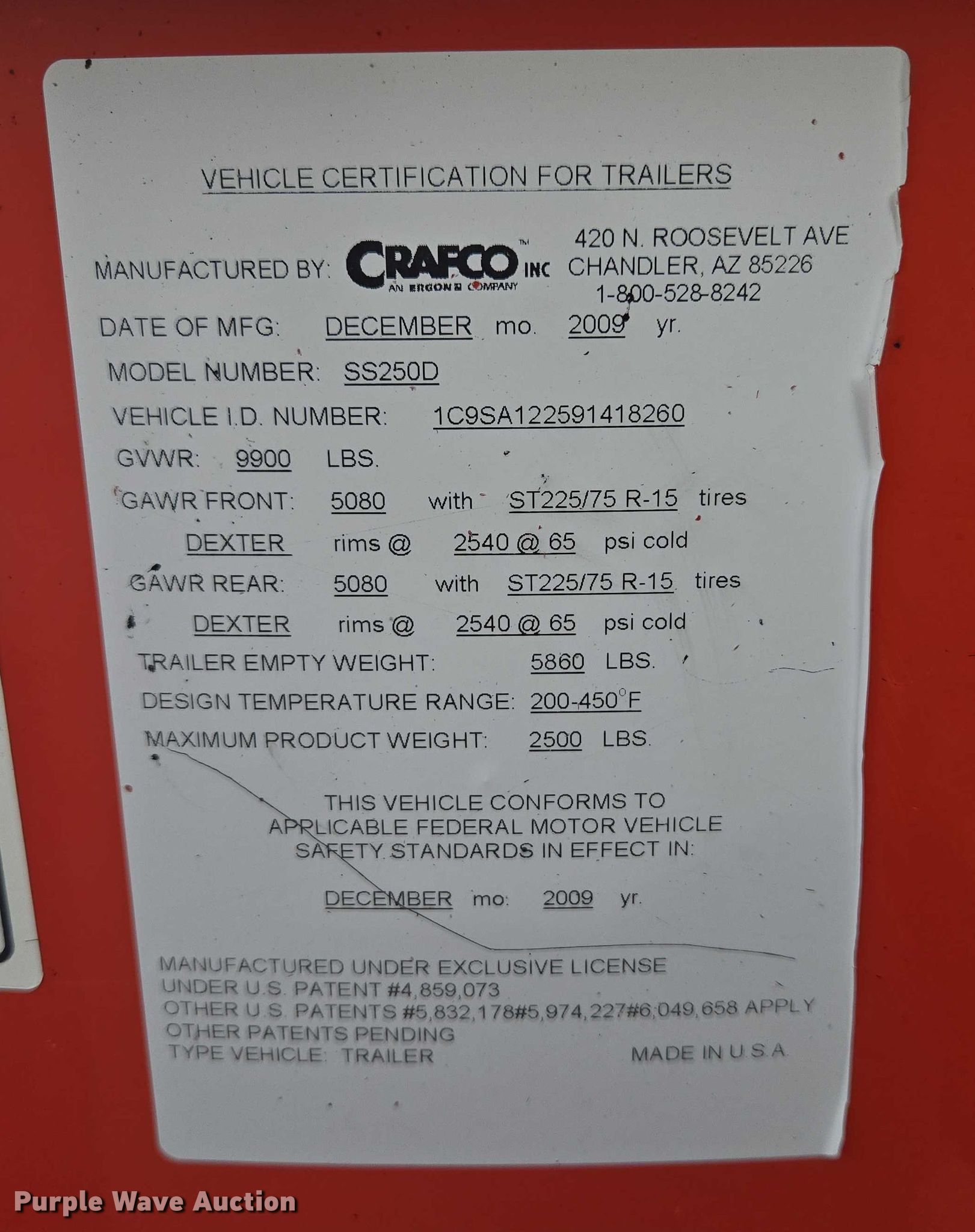 2010 Crafco SS250D pothole patcher. Hours: 3,121 on meter, VIN: 1C9SA122591418260. Engine Izuzu 3CB1-CZP01, Serial: 004588, Displacement: 1.116L, Cylinders: 3, Fuel type: Diesel. Features Hitch: 2 5/16 ball, Brakes: Electric. Tires Size: ST225/75R15. Transfer of ownership documentation will be a bill of sale. City of Vermillion, SD. Vermillion, SD 57069