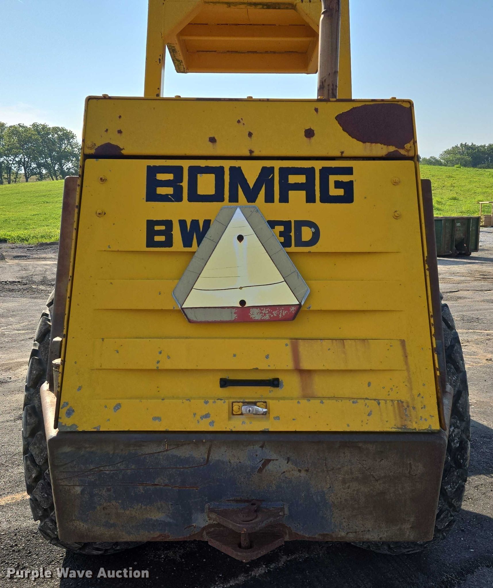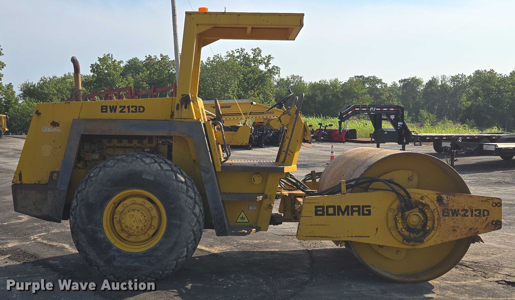 1987 Bomag BW213D single drum vibratory roller. Hours: 897 on meter, Serial: 101400250226. Engine Deutz, Cylinders: 6, Fuel type: Diesel. Transmission Hydrostatic. Operators station OROPS. Features Drum Drum type: Smooth, Vibratory system: Single, Width: 82", Diameter: 60", Drum scrapers. Notes Dead battery, Battery needs replaced, Non-operational parking brake, Hydraulic leak, Non-operational vibratory system. Leavenworth County. Leavenworth, KS 66048