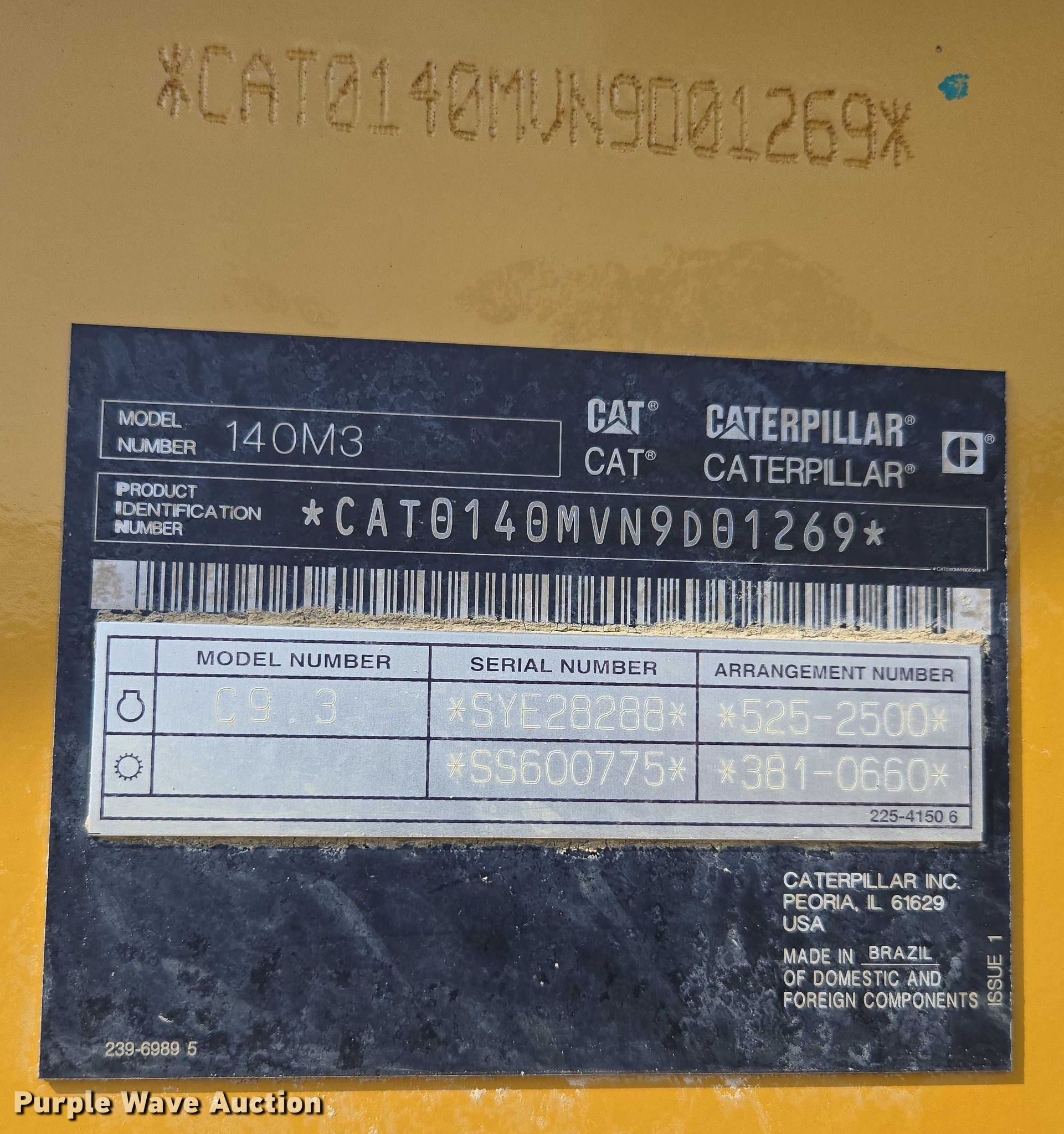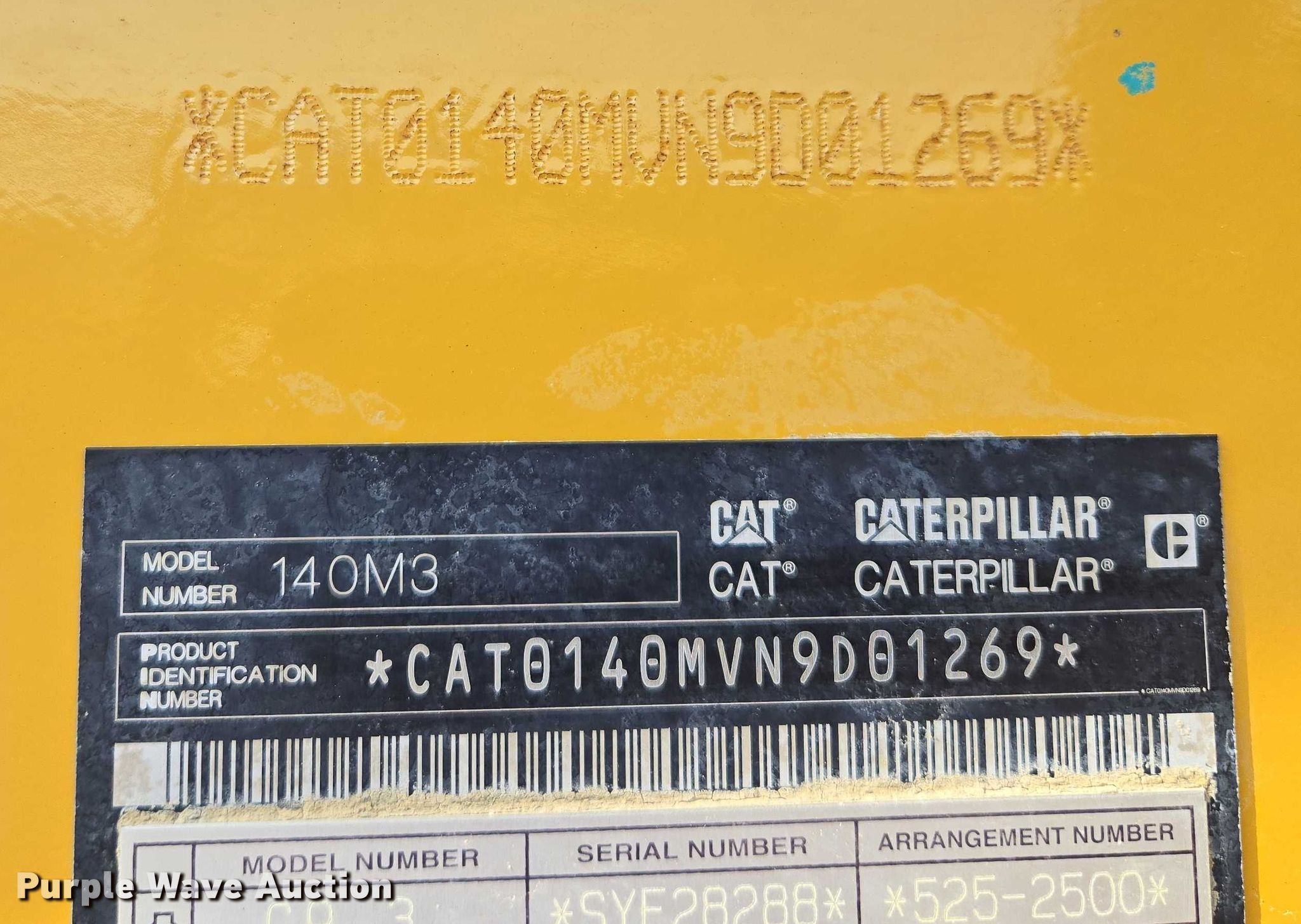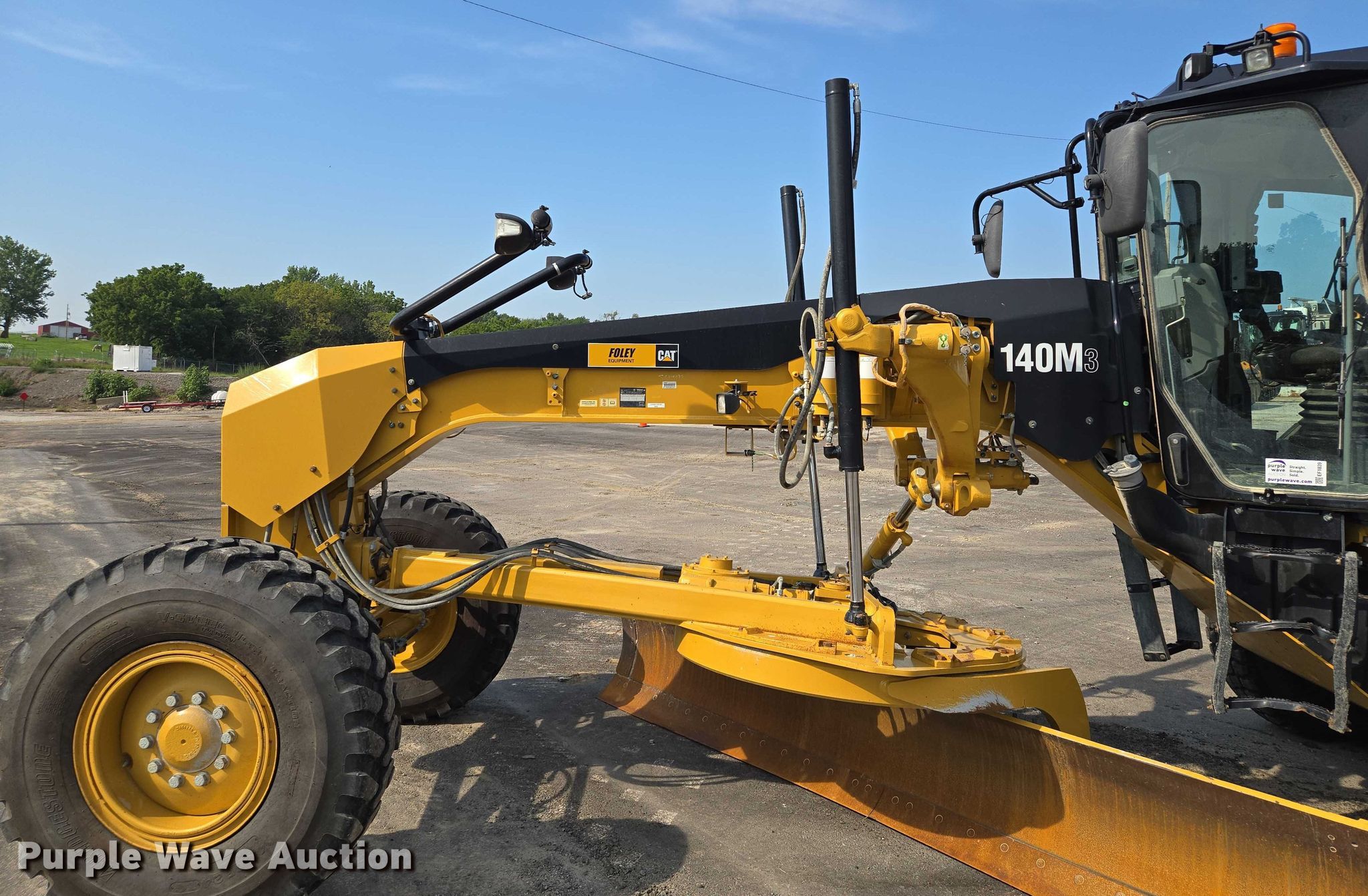 2018 Caterpillar 140M3 motor grader. Hours: 6,714 on meter, Serial: CAT0140MVN9D01269. Engine Caterpillar C9.3, Displacement: 9.3L, Cylinders: 6, Fuel type: Diesel. Transmission Powershift. Chassis Differential lock. Operators station Enclosed cab, AC, Heat, Backup camera, Steering: Joystick. Features Moldboard: Tip control, Side shift, Moldboard total width: 14', Blade accumulators. Tires Size: 14.00R24. Notes Jump start required during on-site data collection. Leavenworth County. Leavenworth, KS 66048