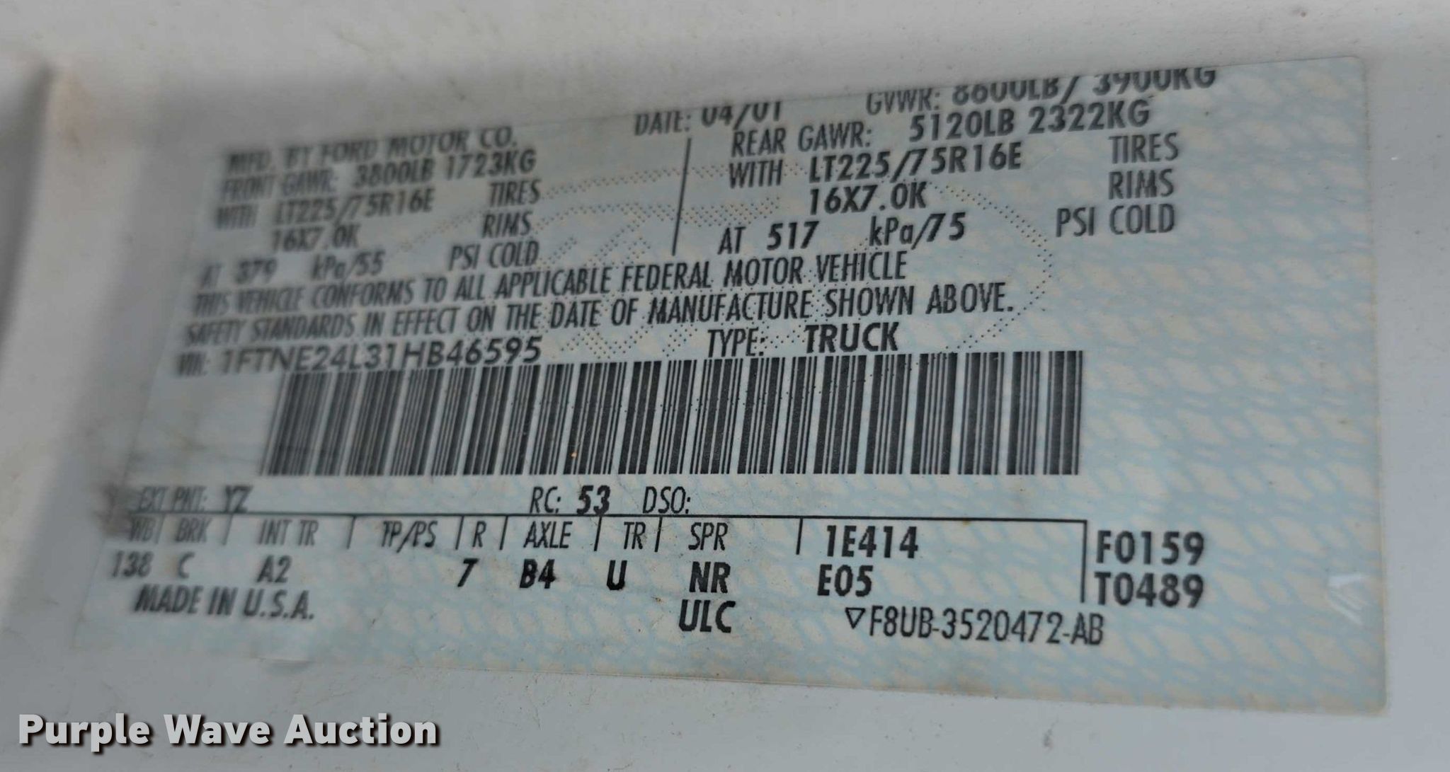 Purple Wave is selling a used 3/4 or 1 Ton Pickup or Van in Kansas. This item is a 2001 Ford Econoline E250 van with the following: Miles: 116,509 on odometer, VIN: 1FTNE24L31HB46595, Unit #: 01
