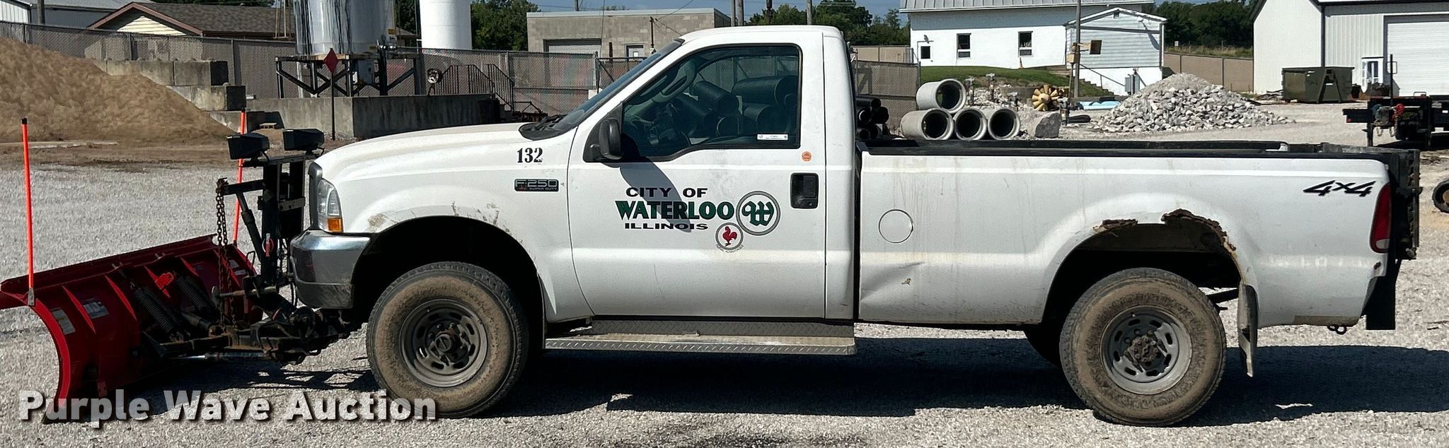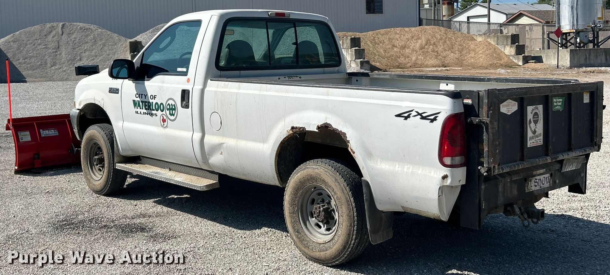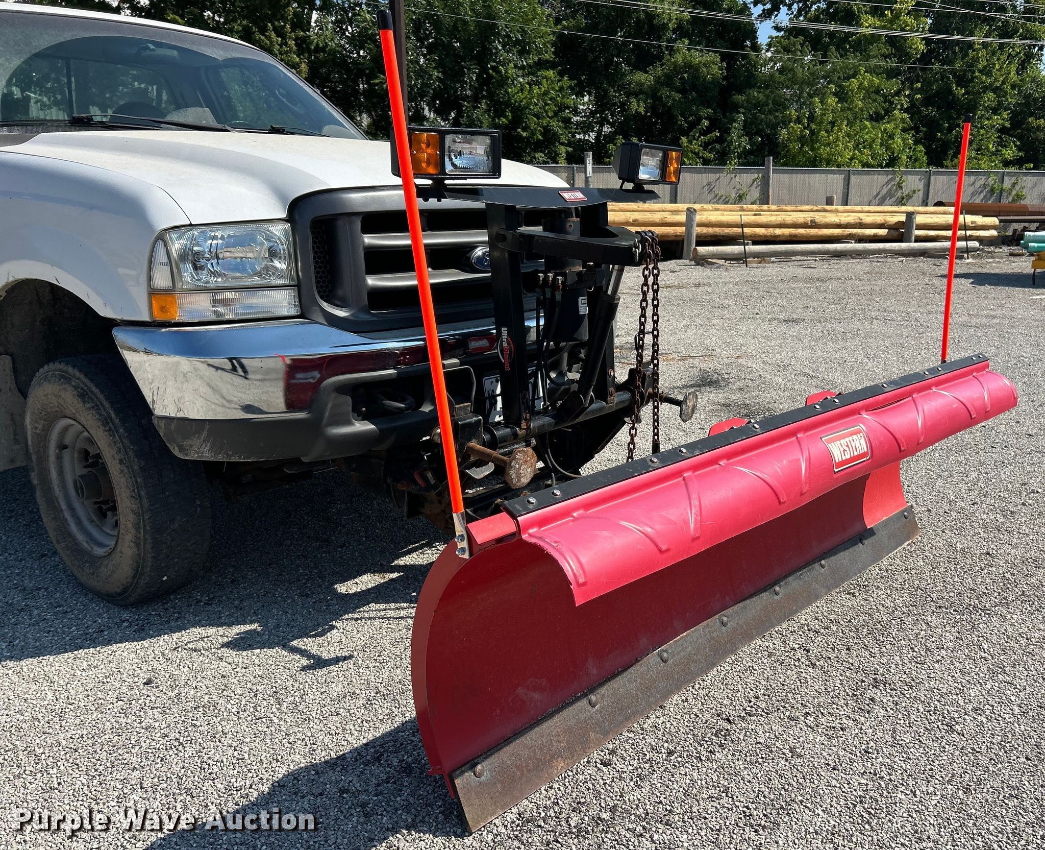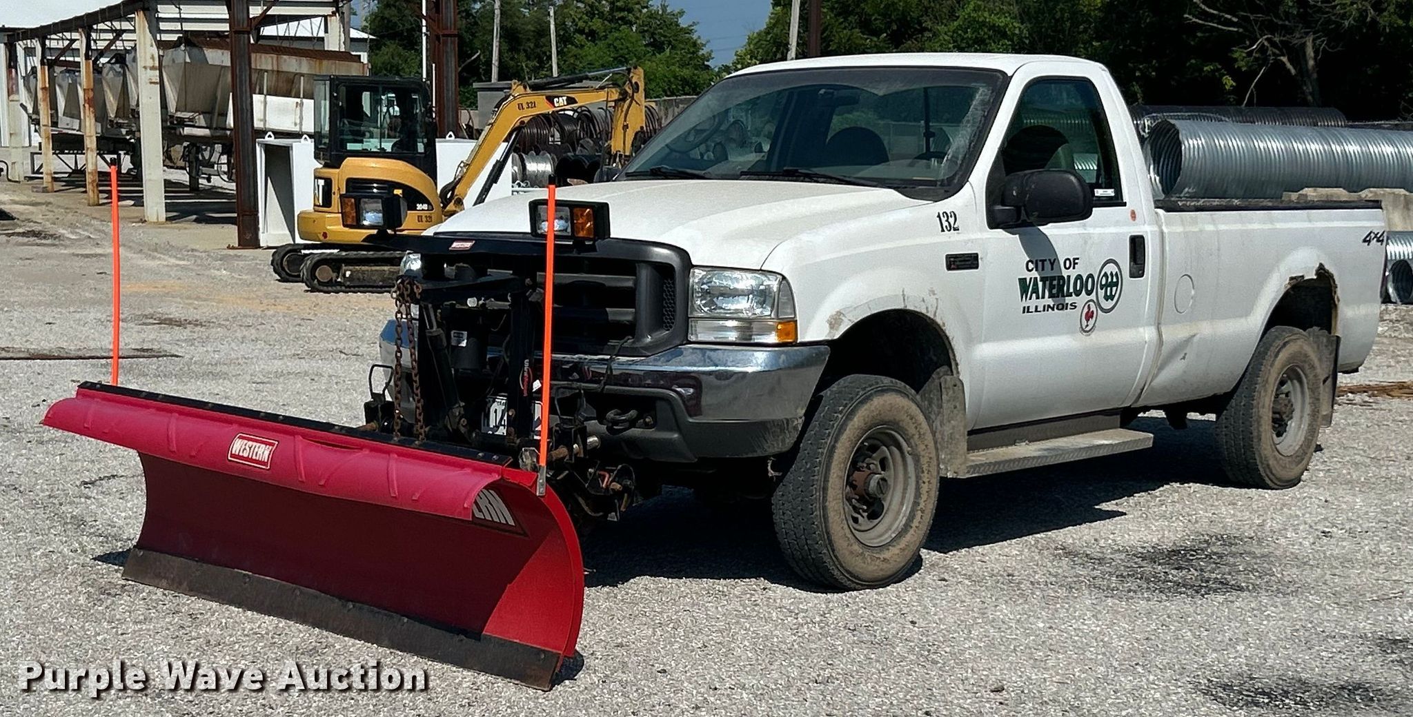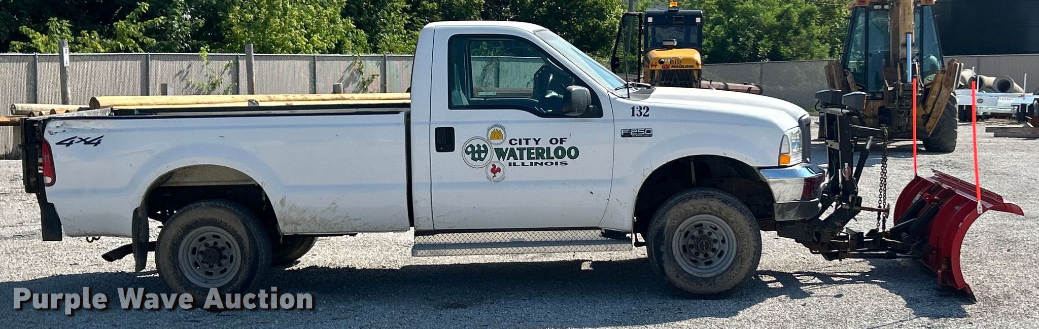 2003 Ford F250 Super Duty XL pickup truck. Miles: 63,614 on odometer, VIN: 3FTNF21L43MB29921. Engine Displacement: 5.4L V8 DOHC, Cylinders: 8, Fuel type: Gas. Transmission Automatic, Four wheel drive. Interior Heat, Brake controller. Features Snow plow Western, Width: 90", End gate lift Tommy Gate. Tires Size: 235/85R16. Notes Decals will be removed prior to auction. Illinois title. Title distribution may be delayed up to 14 days from verification of funds. City of Waterloo, IL. Waterloo, IL 62298