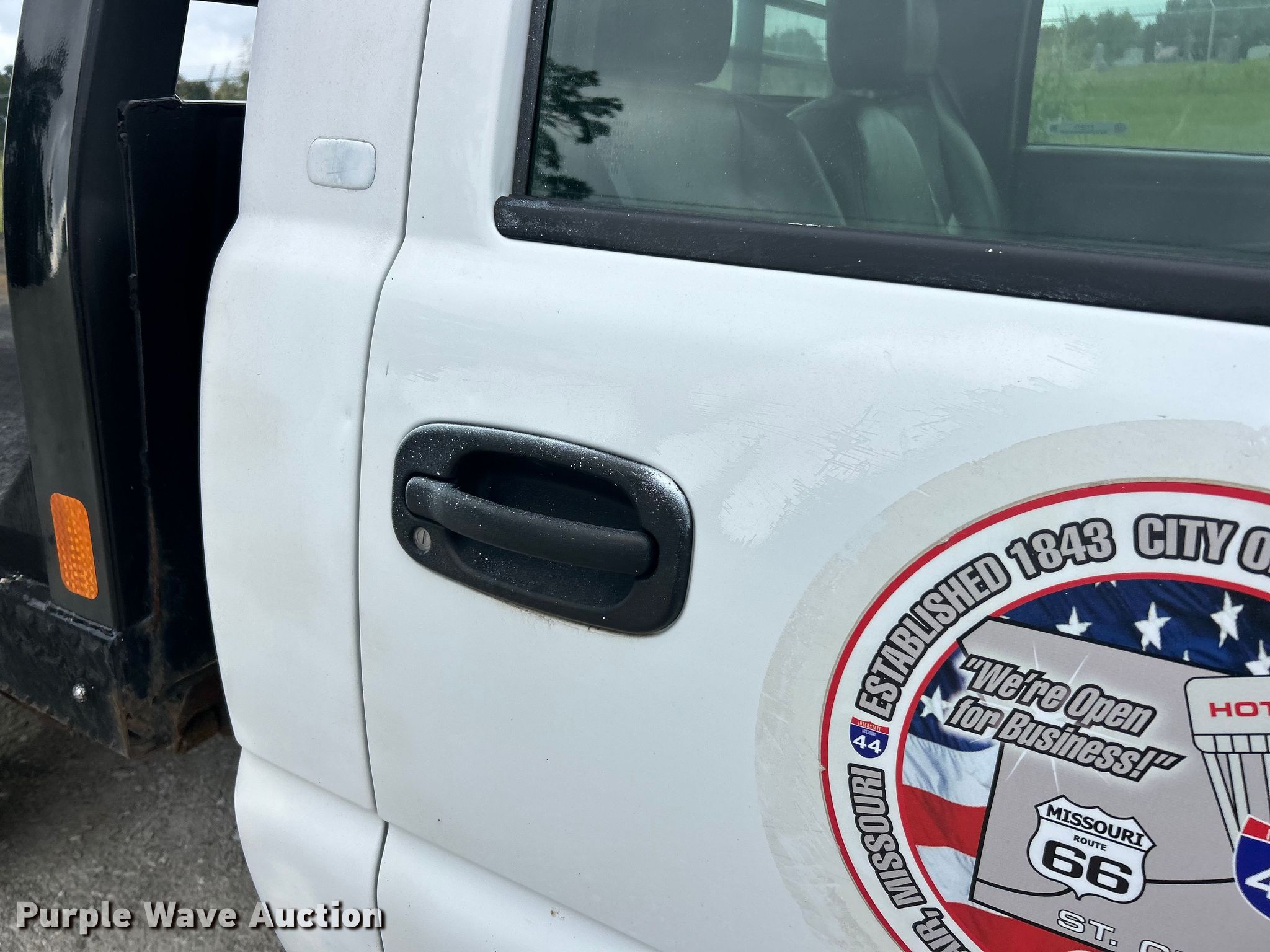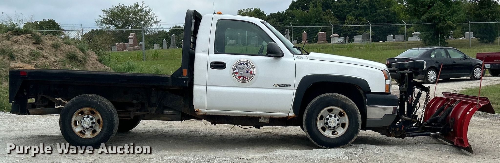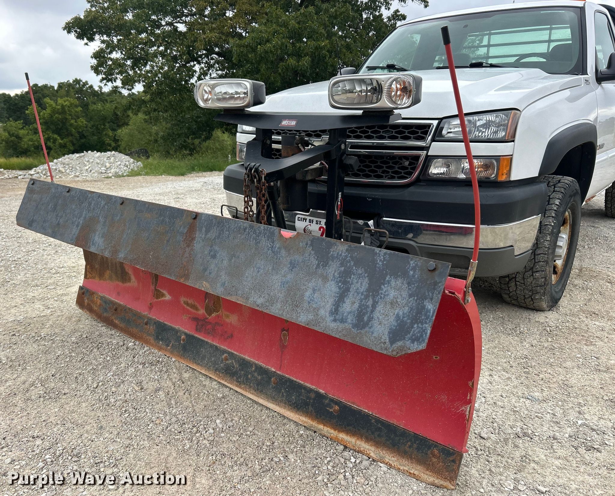 2005 Chevrolet Silverado 3500 flatbed pickup truck. Miles: 53,818 on odometer, VIN: 1GCHK34U85E297007. Engine Displacement: 6.0L V8 OHV, Cylinders: 8, Fuel type: Gas. Transmission Automatic, Four wheel drive. Interior AC, Heat. Features Bed Flatbed, CM, Length: 8' 6", Width: 80", Hitch: Gooseneck, Snow plow Western, Width: 90". Tires Size: 265/75R16. Notes Dash warning indicator: Check engine, ABS, Brake, Airbag, Parking brake line damaged, Possible AC issues, may need charged. Missouri title. Title distribution may be delayed up to 14 days from verification of funds. City of St. Clair, MO. Saint Clair, MO 63077