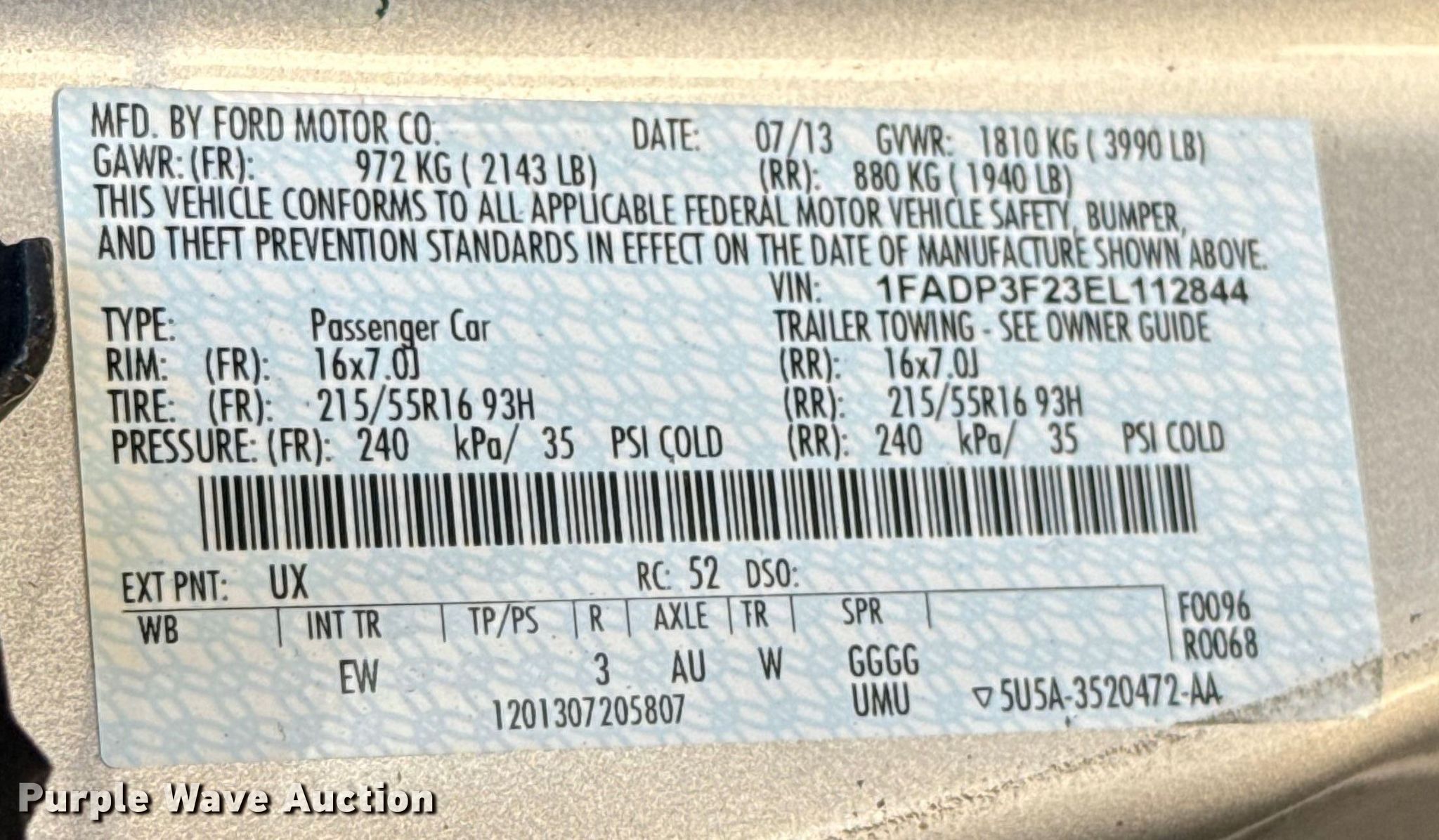 2014 Ford Focus. Miles: 45,259 on odometer, VIN: 1FADP3F23EL112844, Unit #: 677, Sale #: 2613-KP. Engine Displacement: 2.0L L4 DOHC, Cylinders: 4, Fuel type: Gas. Transmission Automatic. Interior AC, Heat, Power windows, Power locks, Cruise control. Tires Size: 215/55R16. Notes Dash warning indicator: TPMS, Jump start required during on-site data collection. Oklahoma title. OSU-OKC Security (CSEP). Oklahoma City, OK 73107