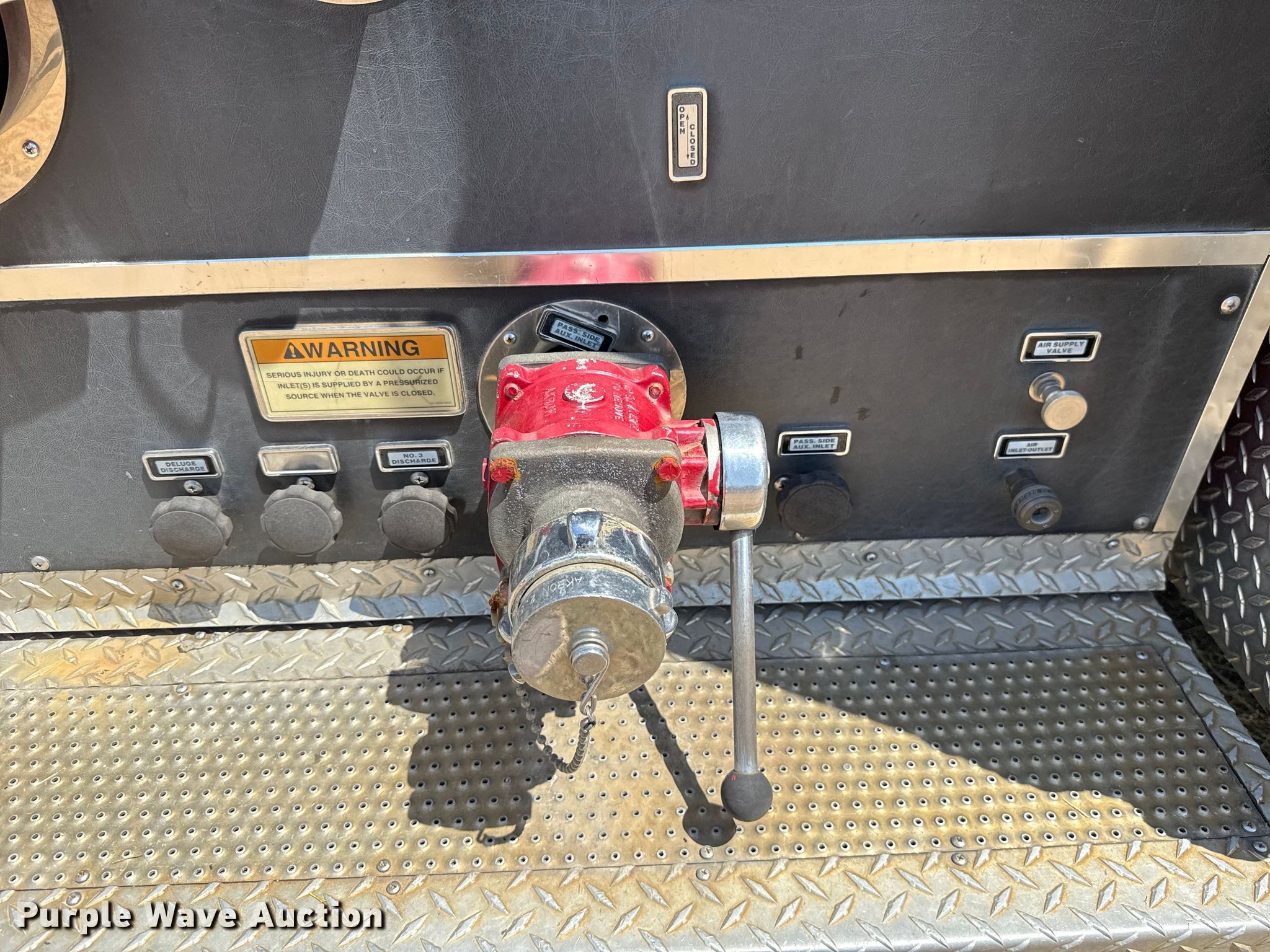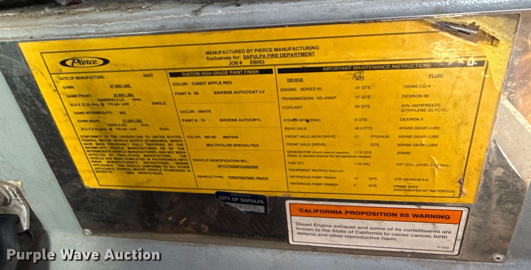 1997 Pierce Manufacturing Quantum pumper fire truck. VIN: 4P1CT02S6VA000595. Engine Detroit Diesel Series 60, Displacement: 12.7L, Cylinders: 6, Fuel type: Diesel. Transmission Allison HD-4060P, Automatic. Chassis Axles: Single, Suspension: Spring, Brakes: Air, GVWR: 47,800 lbs. Interior Heat, Auxiliary controls. Features Fire truck body Pierce Quantum, Tank Capacity: 1,000 gallons, Pump 1,500 gpm, PA/ siren controls. Tires Front: 425/65R22 5, Rear: 11R22 5. Notes Engine issues , Unit must be towed or hauled , Unknown operating condition. Oklahoma title. Title distribution may be delayed up to 14 days from verification of funds. City of Sapulpa, OK. Sapulpa, OK 74066