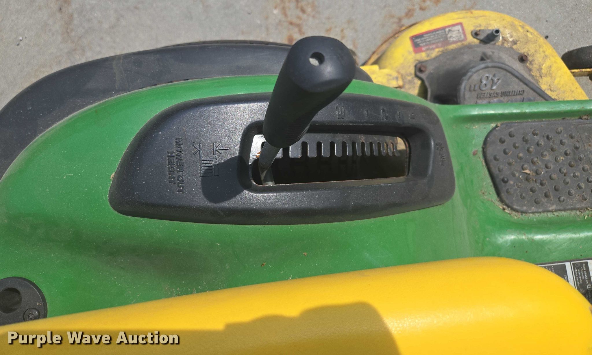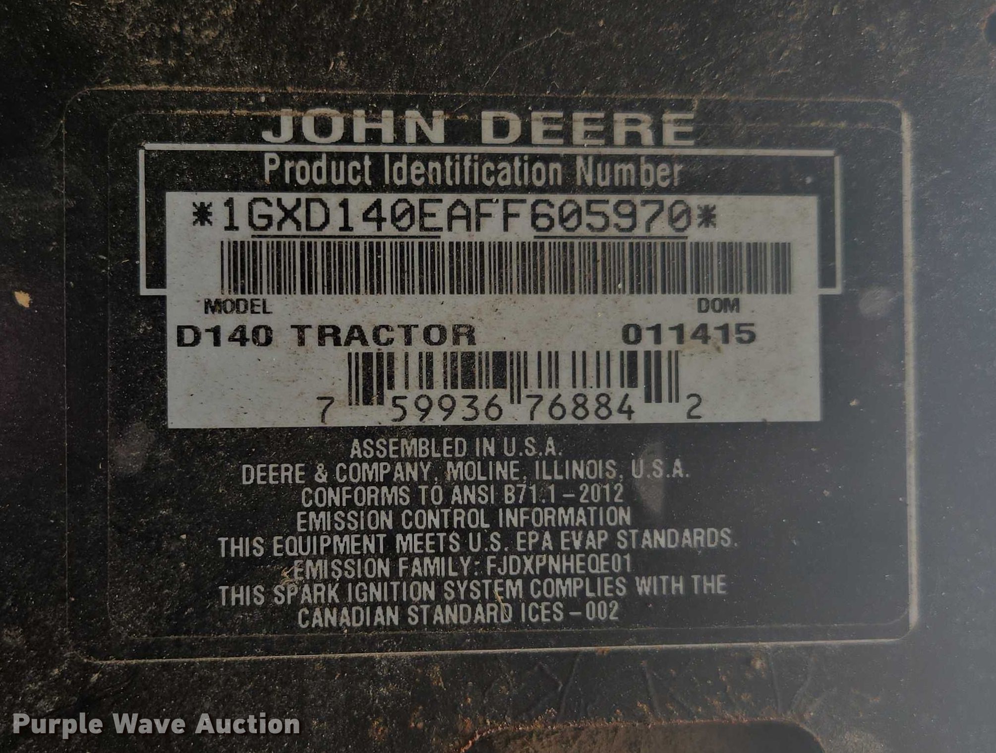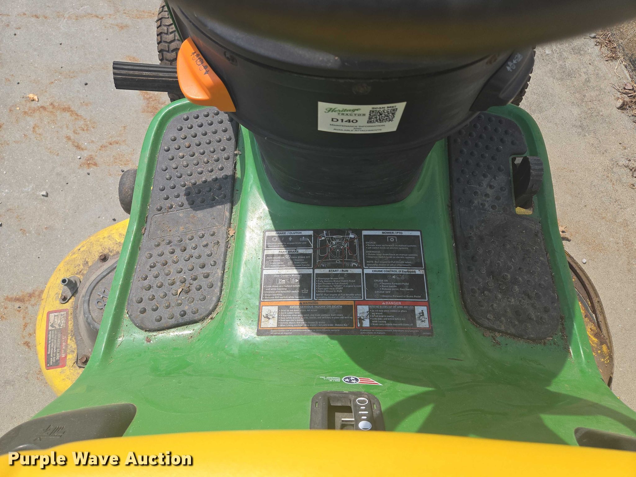Purple Wave is selling a used Lawn Mower in Kansas. This item is a 2015 John Deere D140 lawn mower with the following: Hours: 176 on meter, Cutting width: 48", Serial: 1GXD140EAFF605970