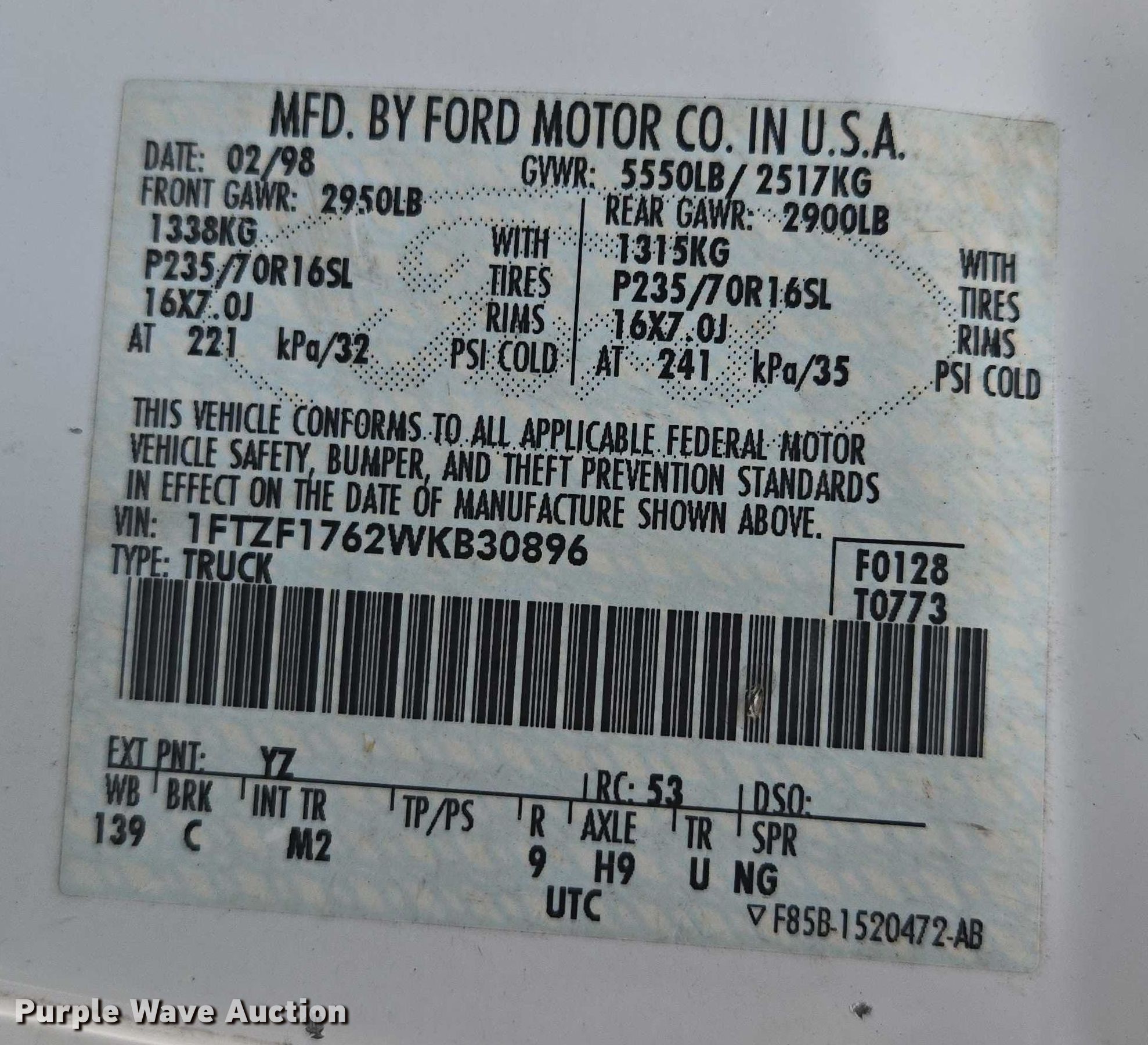 Purple Wave is selling a used 1/2 Ton Pickup or Van in Missouri. This item is a 1998 Ford F150 pickup truck with the following: Miles: 108,446 on odometer, VIN: 1FTZF1762WKB30896