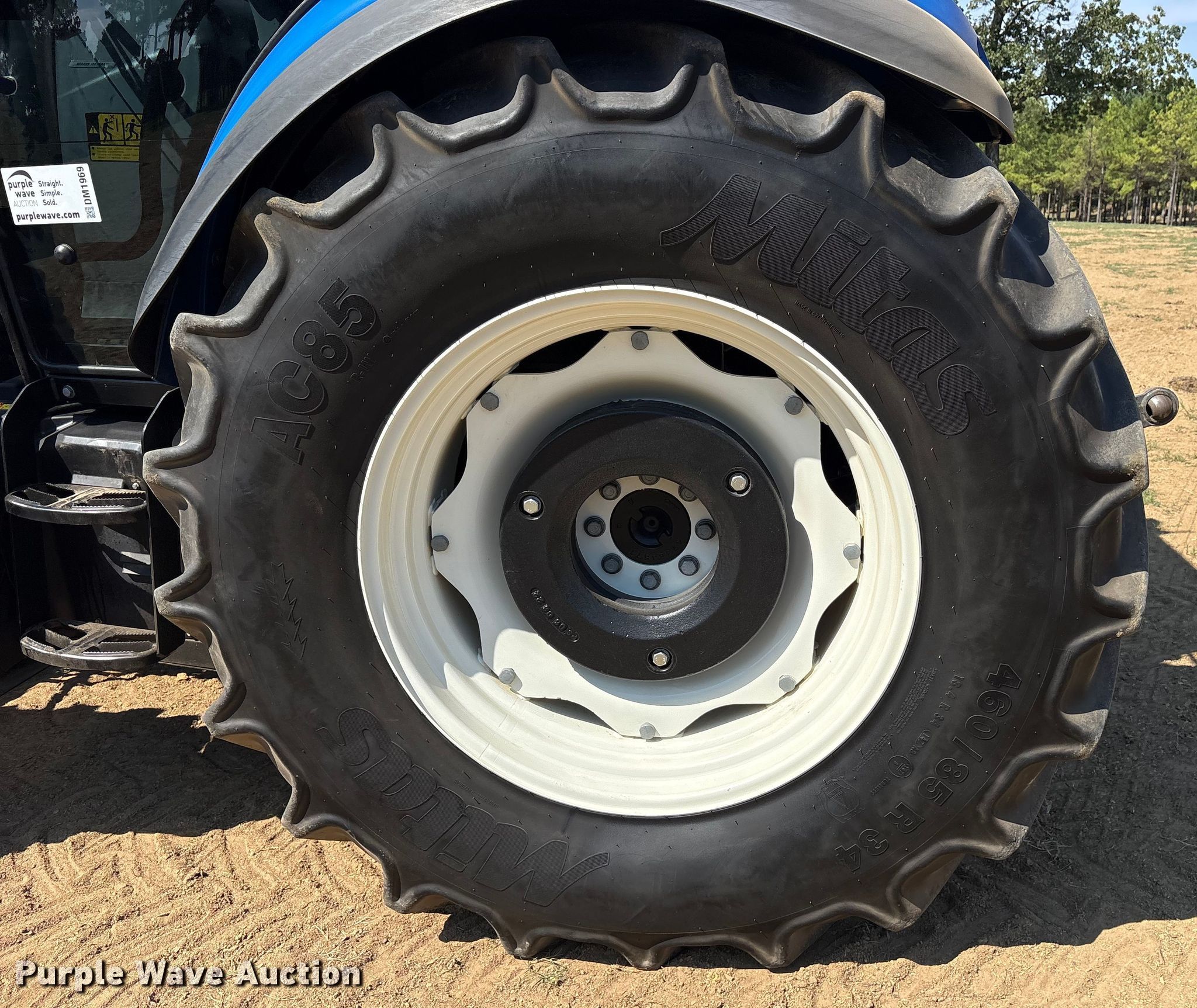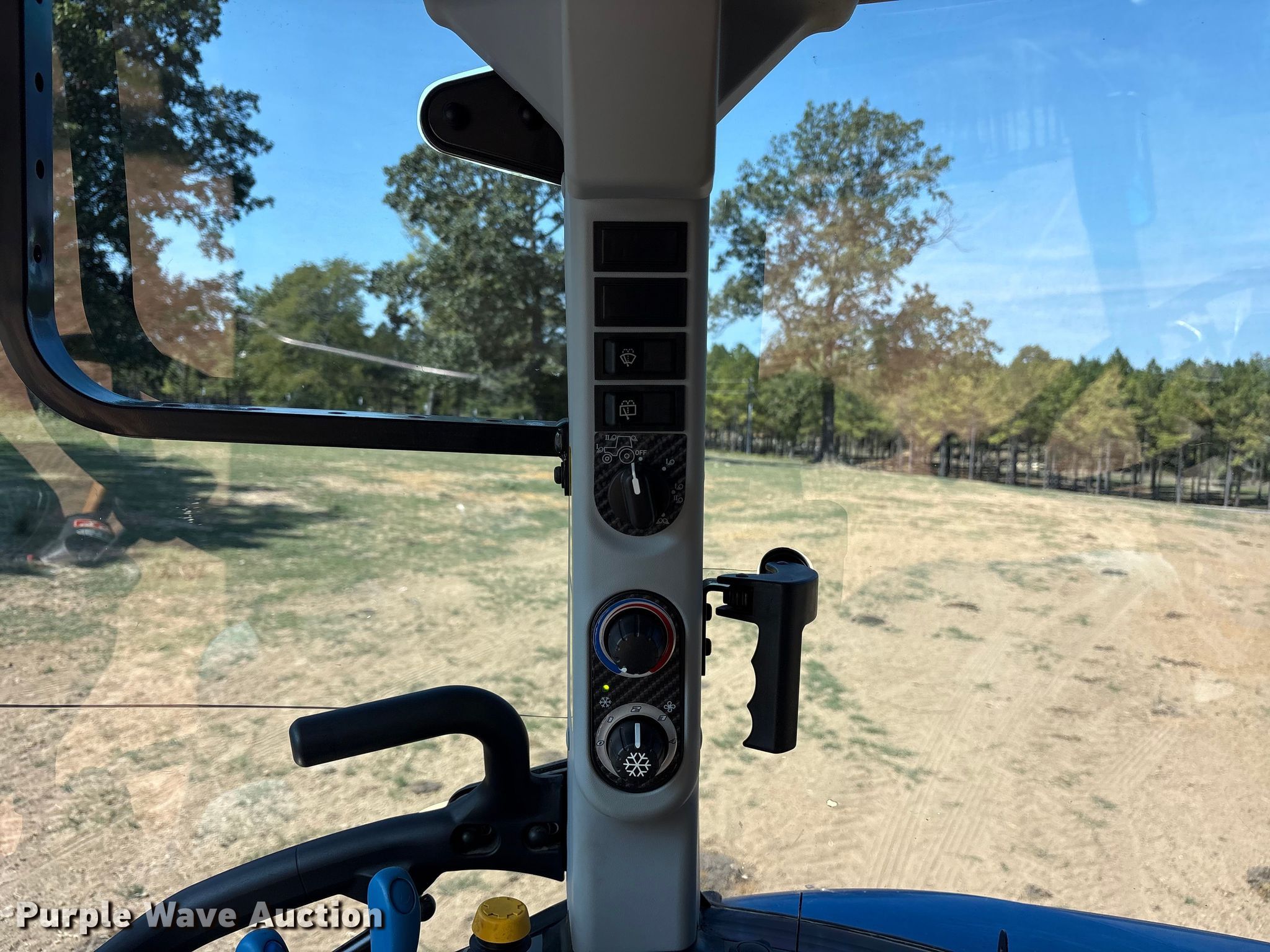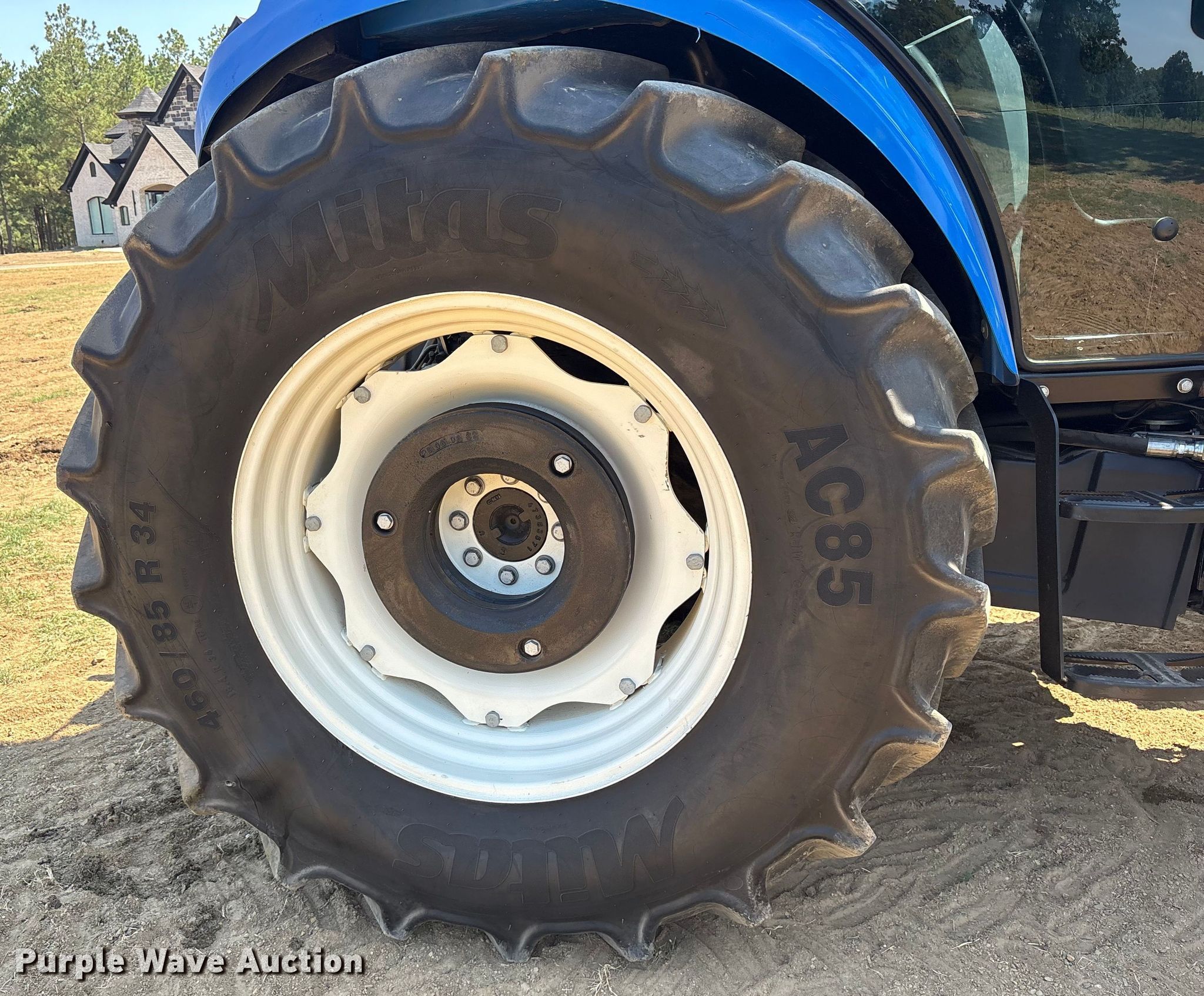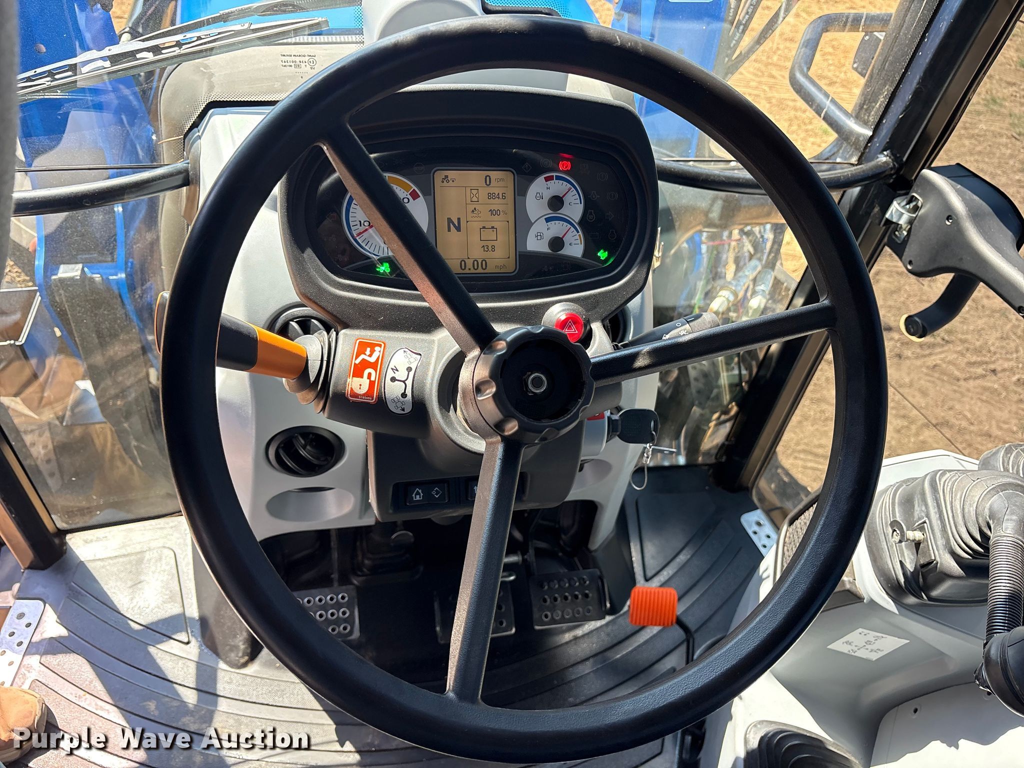 2022 New Holland T5.110 MFWD tractor. Hours: 885 on meter, Miles or hours may vary, unit still in use, Serial: HLRT5110JNL108949. Engine New Holland F5LGL413C, Displacement: 3.6L, Cylinders: 4, Fuel type: Diesel, HP: 99. Transmission Dual power, 24F - 24R, Left-hand reverser, Differential lock. Operators station AC, Heat. Features PTO: 540, 1000, Three point, Seven pin outlet, Hydraulic remote sets Rear: 2, Loader New Holland 720LU, Controls: Joystick, Bucket Width: 85".. Tires Front: 380/85R24, Rear: 460/85R34, Wheel weights: 4. Broken Bow, OK 74728