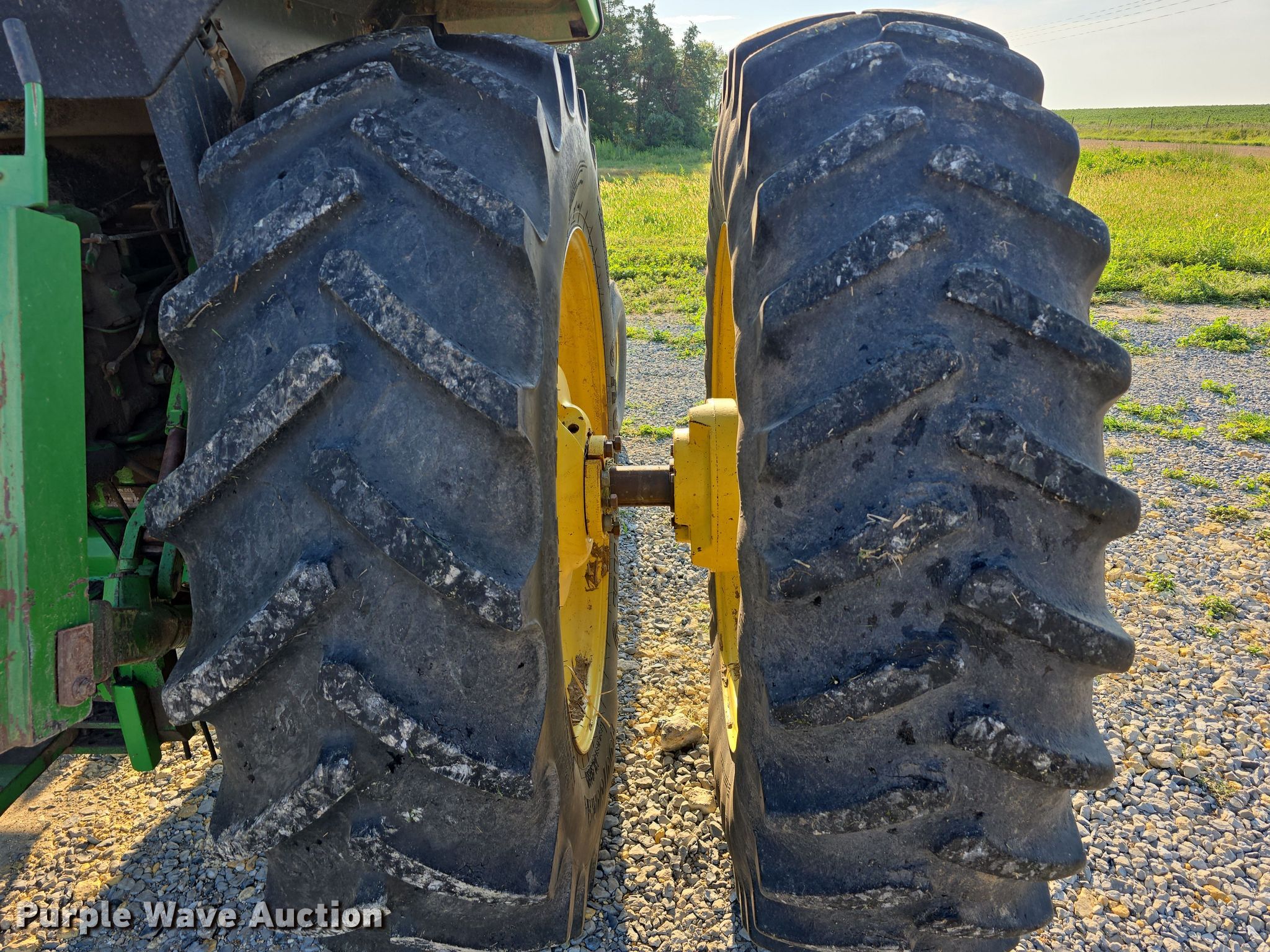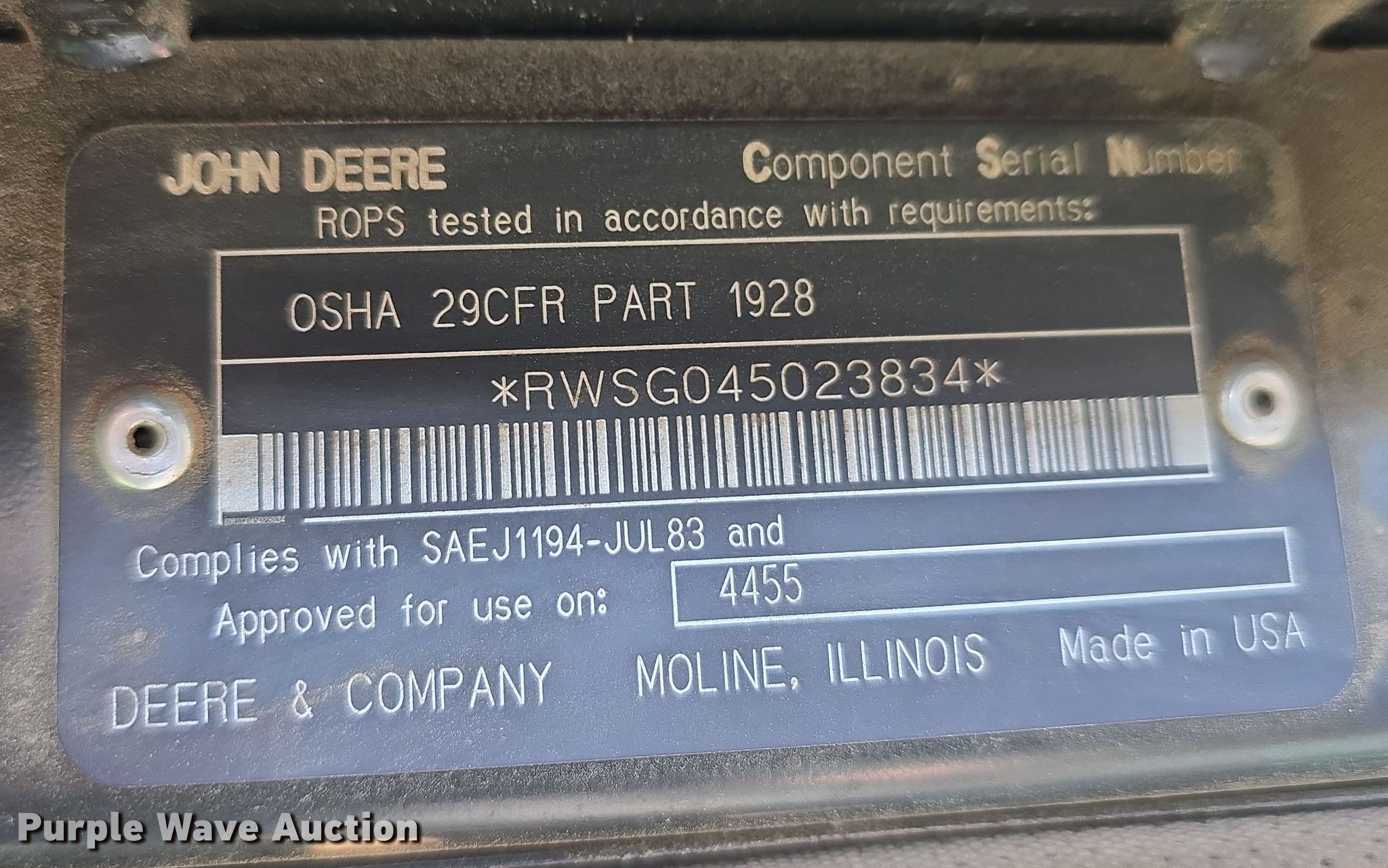 1992 John Deere 4455 tractor. Hours: 8,438 on meter, Serial: RW4455P020819. Engine John Deere, Cylinders: 6, Fuel type: Diesel. Transmission Powershift, 15F - 4R, Differential lock. Operators station AC, Heat, Display Case EZ-Guide 250. Features PTO: 1000, Three point Quick attach, Seven pin outlet, Hydraulic remote sets Rear: 3, Power beyond (hydraulics), Suitcase weights: 14. Tires Front: 11.00-16, Rear: 18.4R42, Duals. Superior, NE 68978